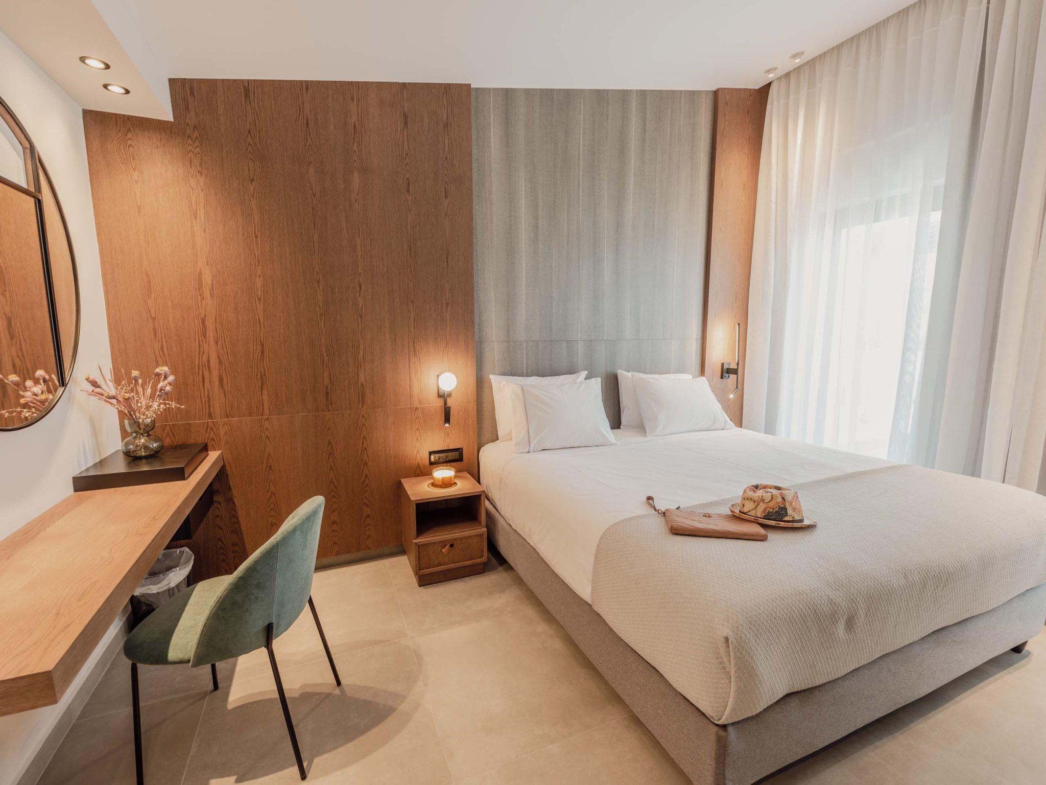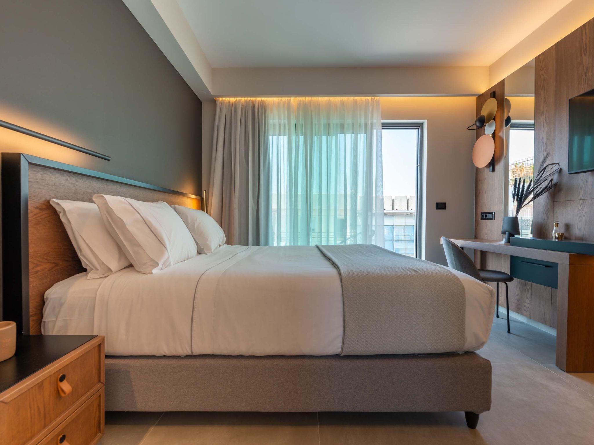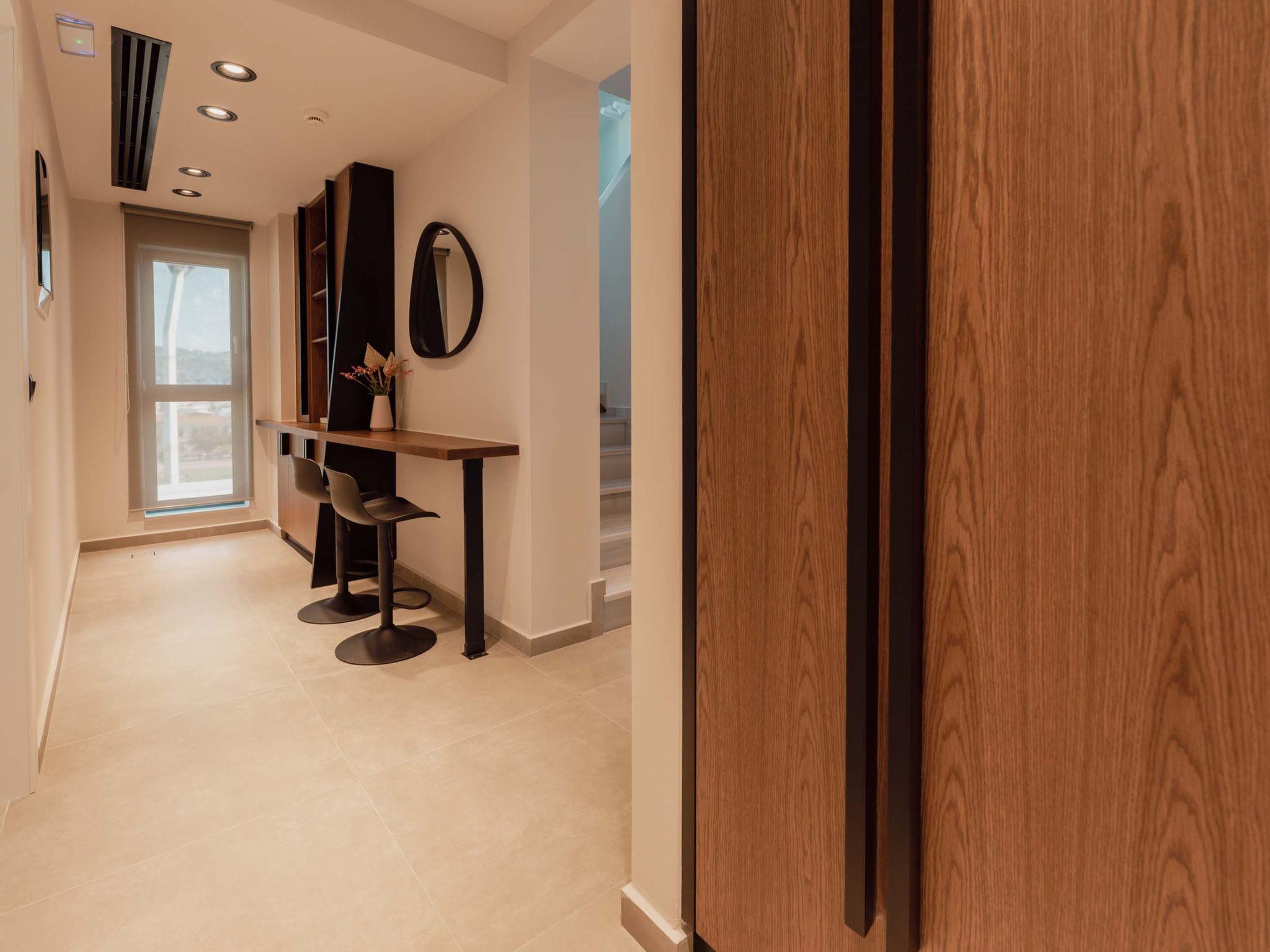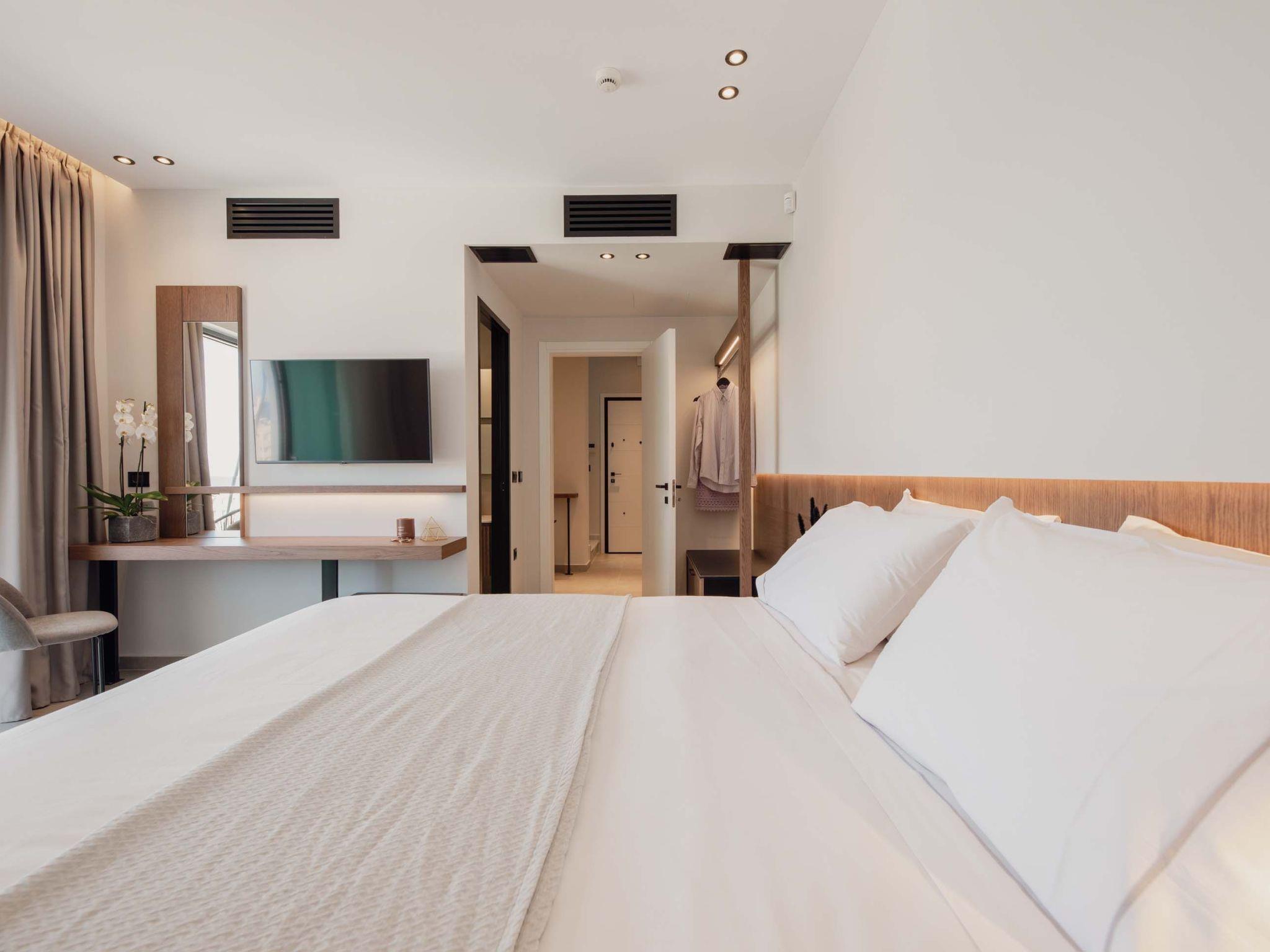 The stunning penthouse features generous indoor and outdoor areas that can host up to 6 guests generously featuring lavish design, supreme amenities handcrafted furniture, an exuberant living room, and a dining area on the upper floor, completing the utopian hideaway. Set across two floors, on the 5th and 6th floors of a new building, the owners have styled each room to feel like an immersive sanctuary. On the entrance floor, there is the open-plan living accommodation with a living area with a satellite TV, a modern fireplace for perfect cosy nights, a dining area, and a fully equipped, fitted, and modern kitchen. The large windows create the illusion of transparency allowing for a flood of Cretan sunshine to illuminate the room. When you reach the lower floor through the elevator you will find 3 modern-designed bedrooms that themselves host queen-size beds with ensuite bathrooms offering complete autonomy and privacy. Next to the bedrooms, for your convenience, you can find a coffee bar with two coffee machines, a small fridge, and some tableware adequate to serve your needs. The property is filled with natural light and instyled with minimal furniture specially designed for this specific project. All the spaces in it offer an indelible mark on the visitor's heart. Its various luxury facilities, its generous stylish areas, its unique location, and its matchless natural beauty make the City Moment Penthouse the perfect opportunity for a high-quality stay and the ideal summer home.