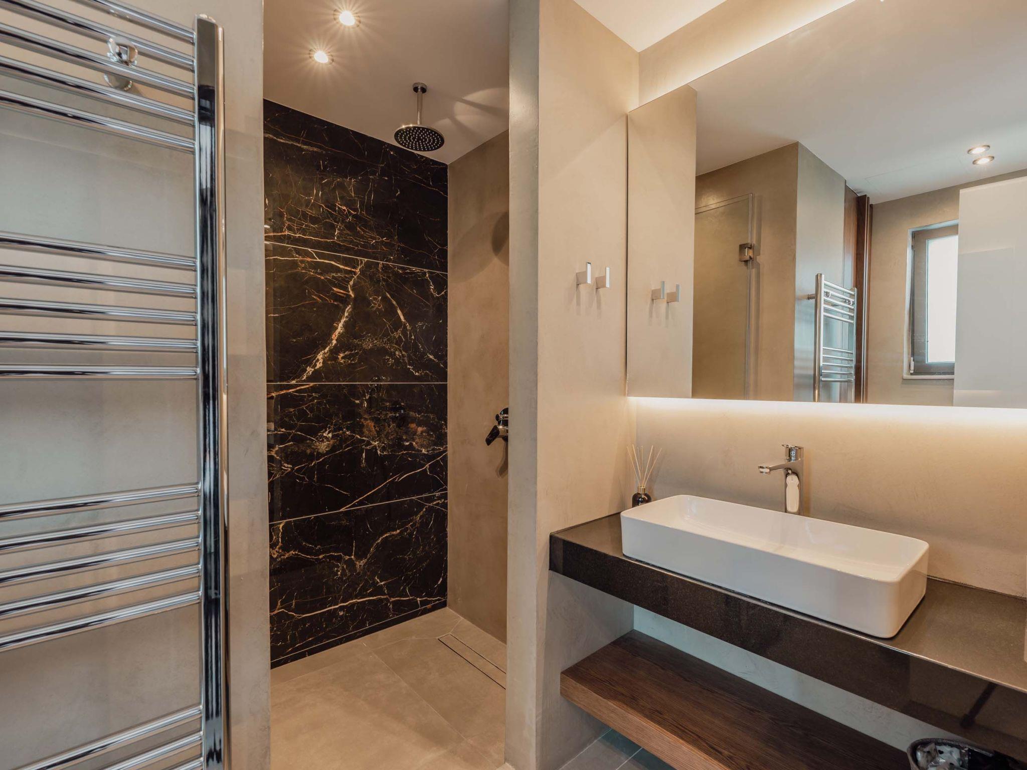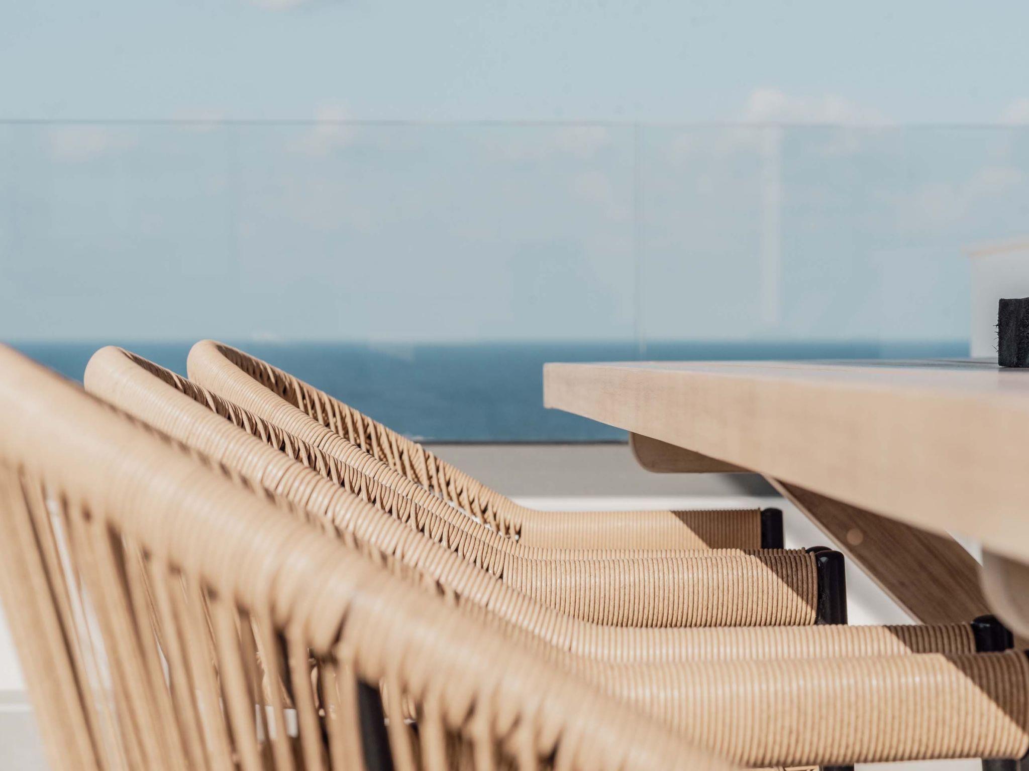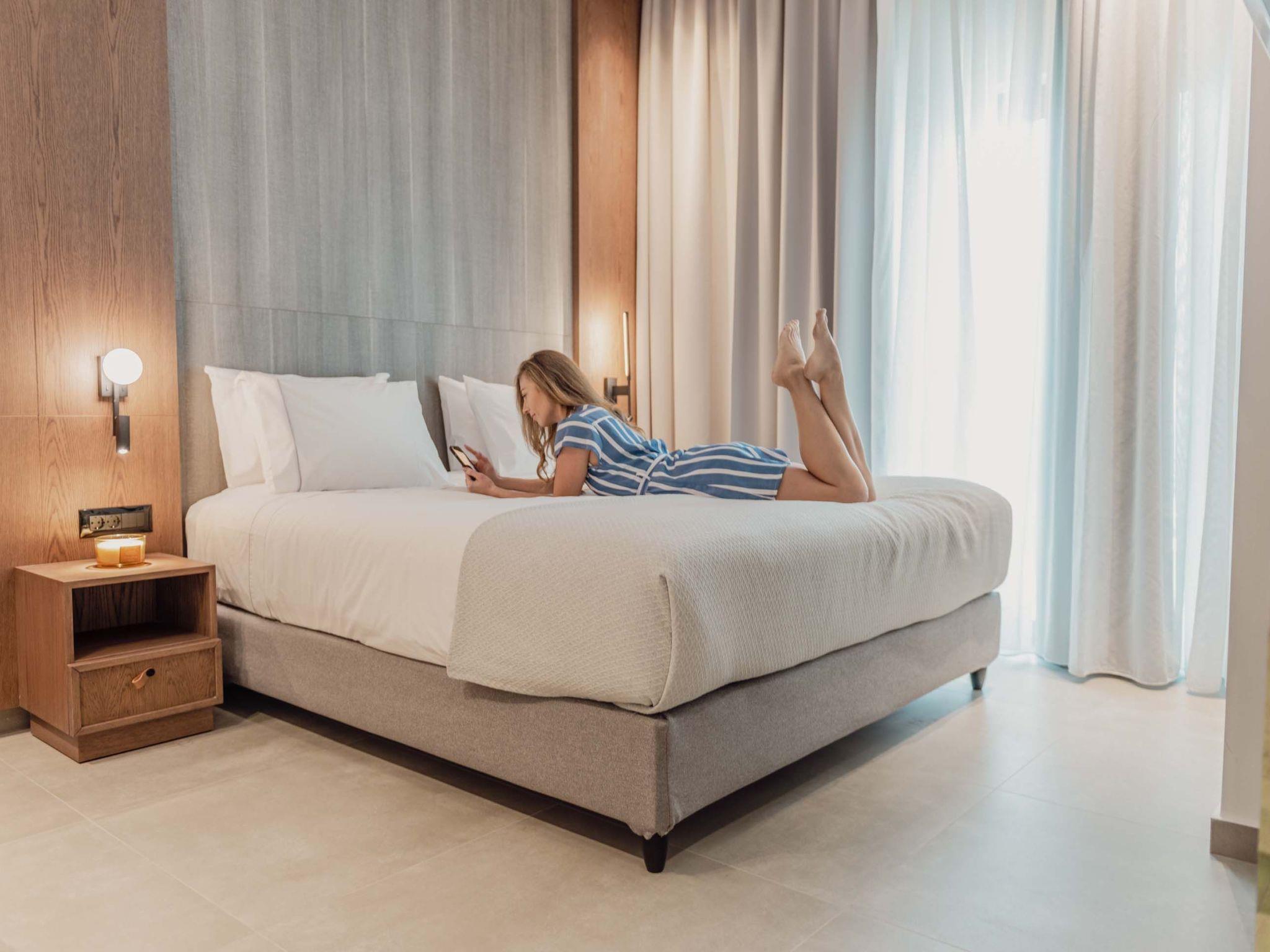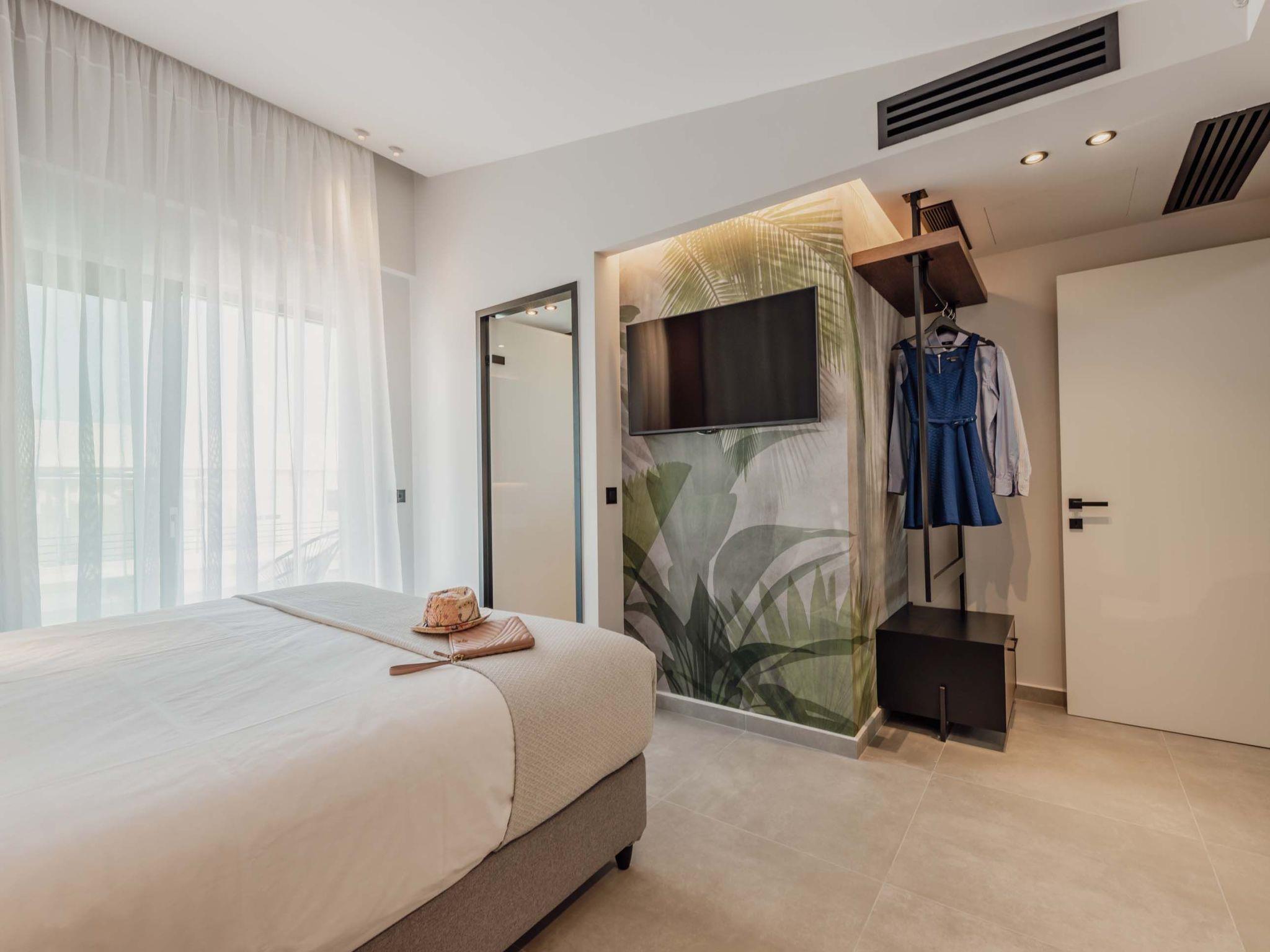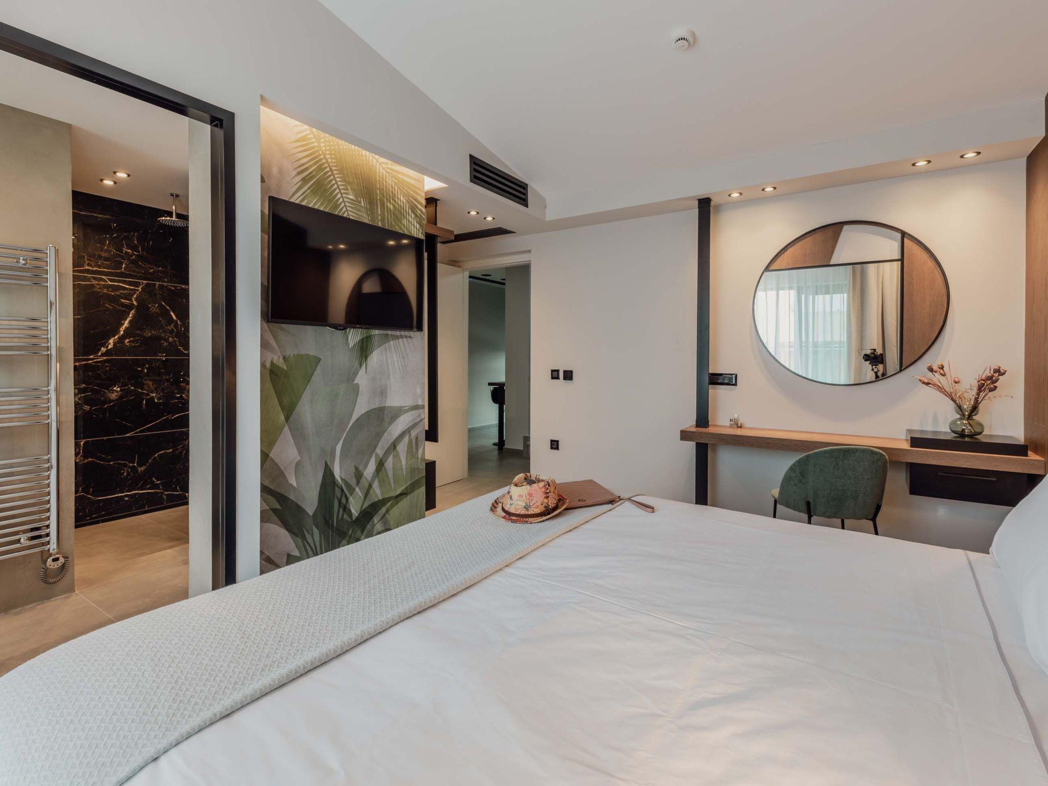 The stunning penthouse features generous indoor and outdoor areas that can host up to 6 guests generously featuring lavish design, supreme amenities handcrafted furniture, an exuberant living room, and a dining area on the upper floor, completing the utopian hideaway. Set across two floors, on the 5th and 6th floors of a new building, the owners have styled each room to feel like an immersive sanctuary. On the entrance floor, there is the open-plan living accommodation with a living area with a satellite TV, a modern fireplace for perfect cosy nights, a dining area, and a fully equipped, fitted, and modern kitchen. The large windows create the illusion of transparency allowing for a flood of Cretan sunshine to illuminate the room. When you reach the lower floor through the elevator you will find 3 modern-designed bedrooms that themselves host queen-size beds with ensuite bathrooms offering complete autonomy and privacy. Next to the bedrooms, for your convenience, you can find a coffee bar with two coffee machines, a small fridge, and some tableware adequate to serve your needs. The property is filled with natural light and instyled with minimal furniture specially designed for this specific project. All the spaces in it offer an indelible mark on the visitor's heart. Its various luxury facilities, its generous stylish areas, its unique location, and its matchless natural beauty make the City Moment Penthouse the perfect opportunity for a high-quality stay and the ideal summer home.