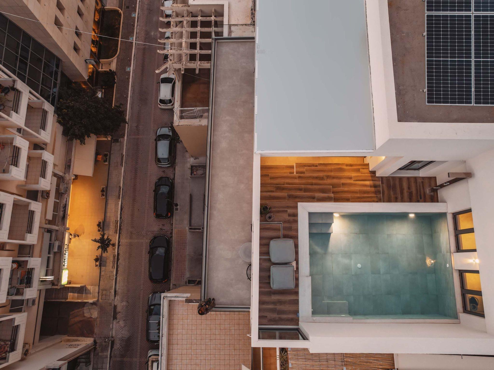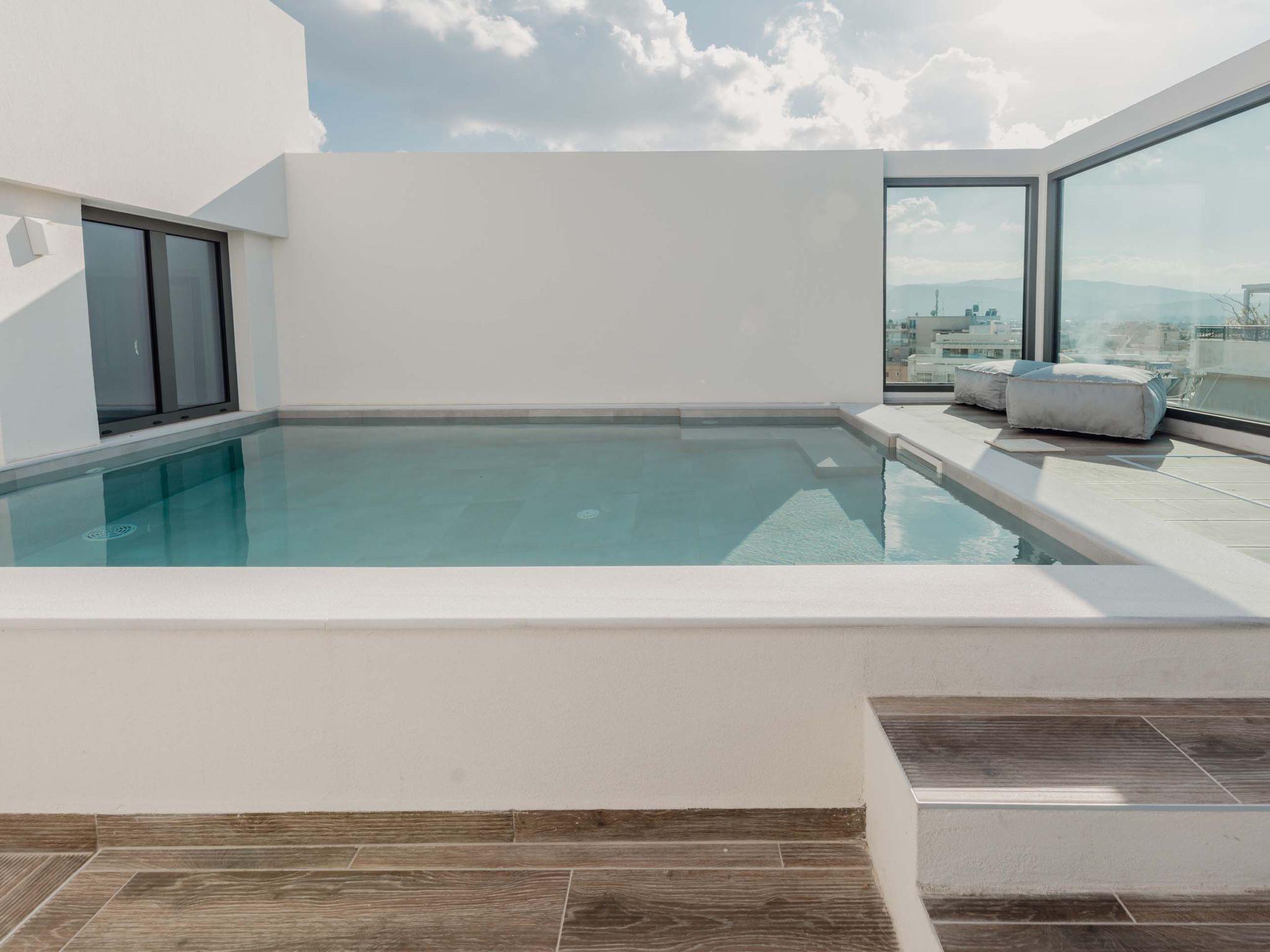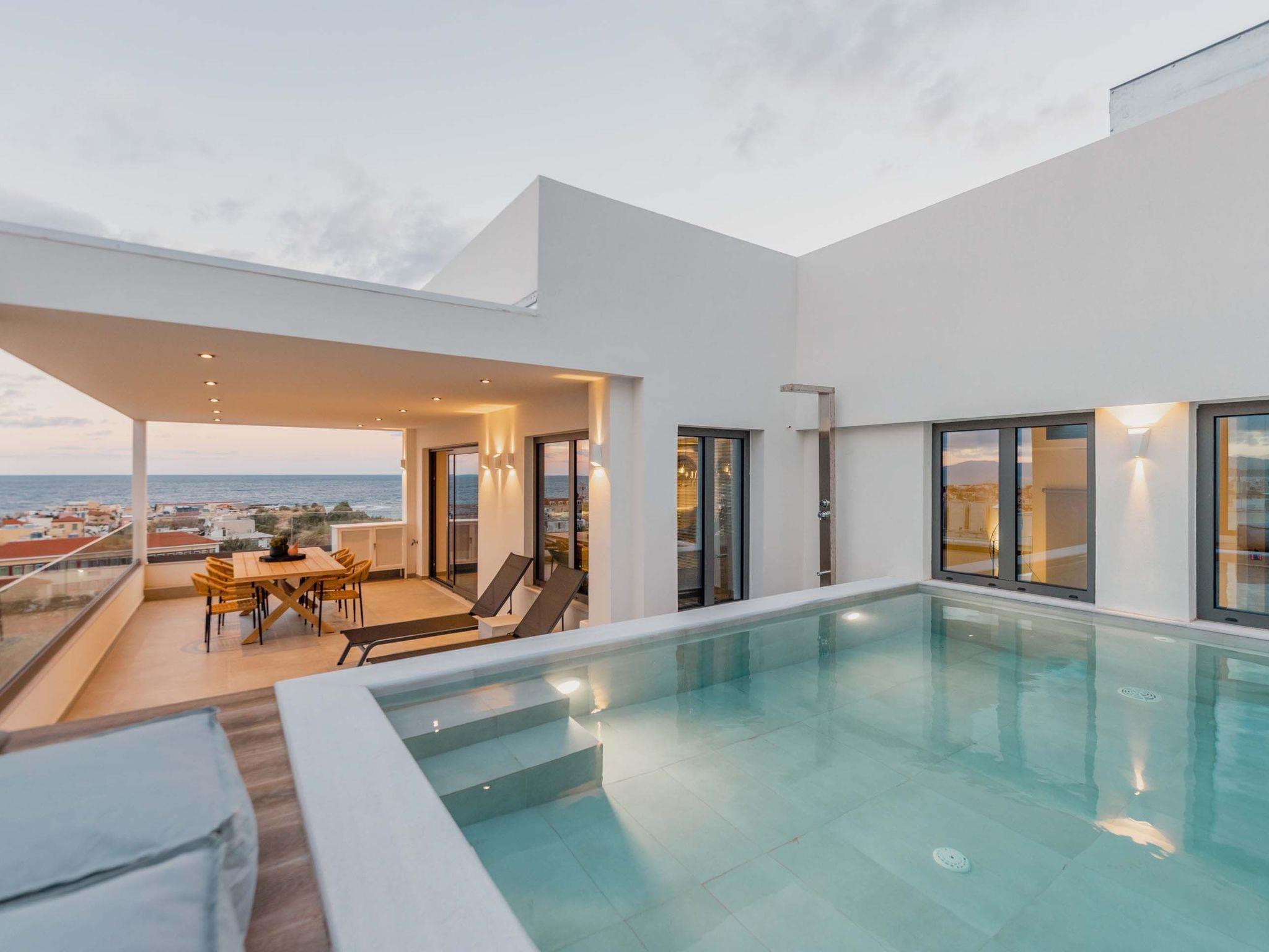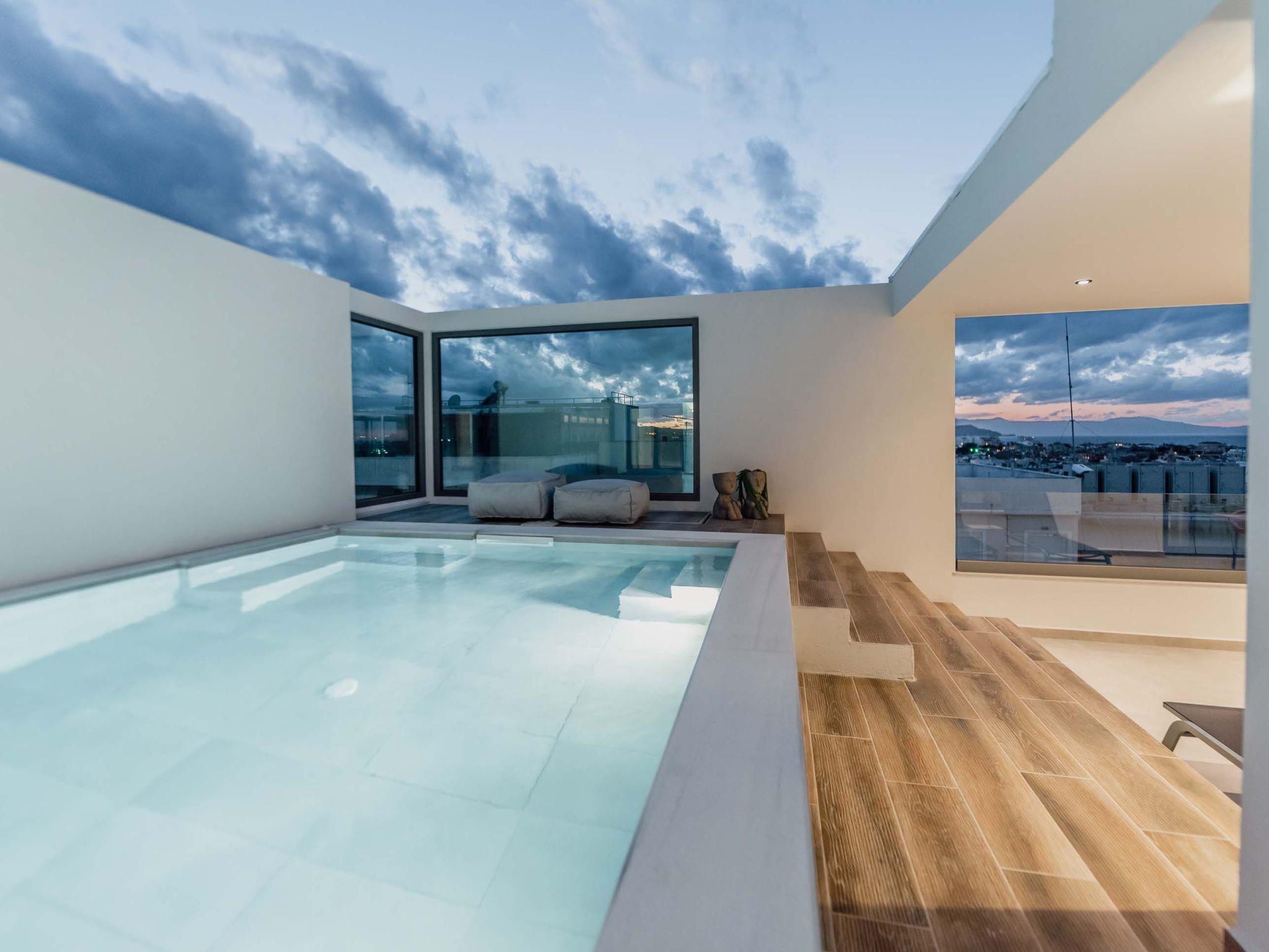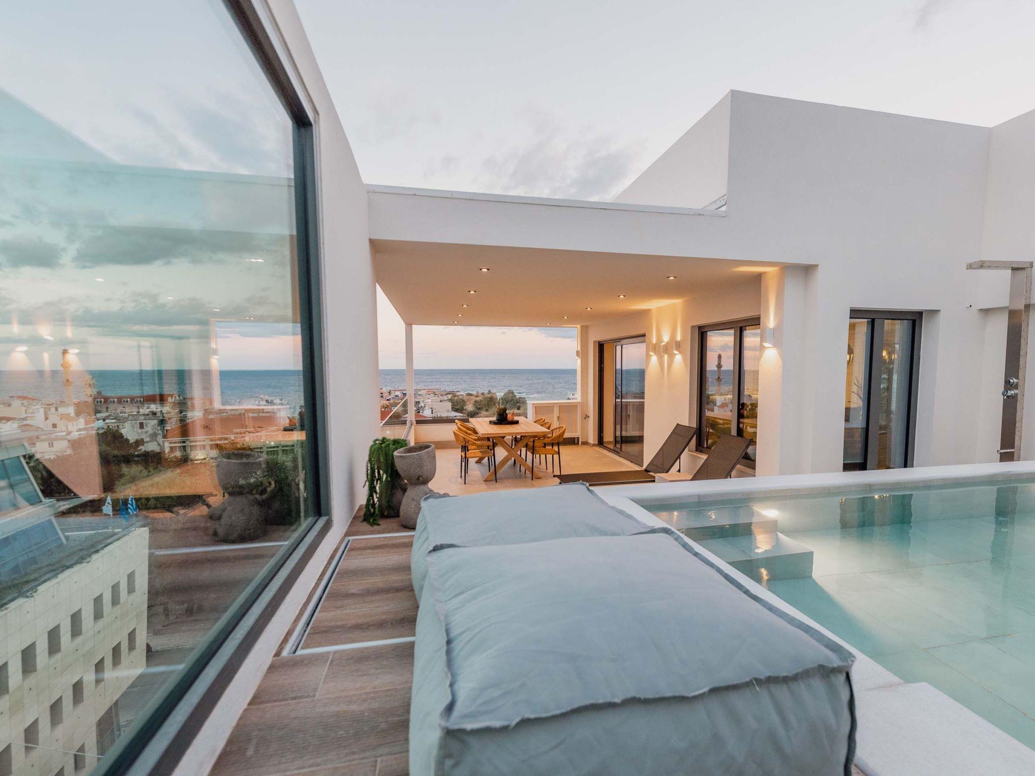 The refreshing outdoor private pool with the integrated jacuzzi is the best part of the residence where you can enjoy unspoiled moments of relaxation under the warm sun while blending harmoniously with the city view. The lounge and dining area for 6 guests is the perfect spot where residents can enjoy optimal habitation and a dazzling view from the sea, the town of Chania Town, and the White Mountains.