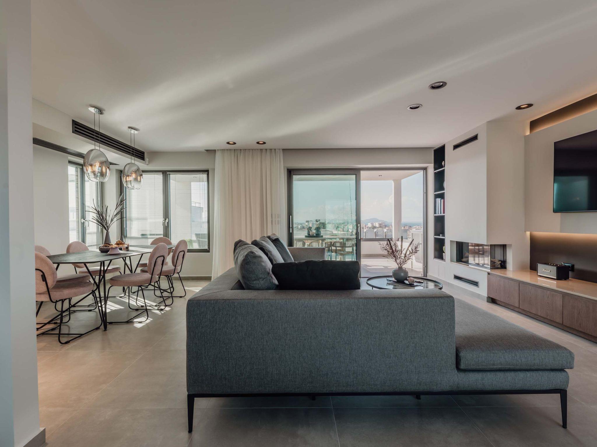Living room with a sofa, 65’’ Smart Satellite TV, Bluetooth speaker Marschall, fireplace with gas, access to the pool terrace, sea & city view via large windows