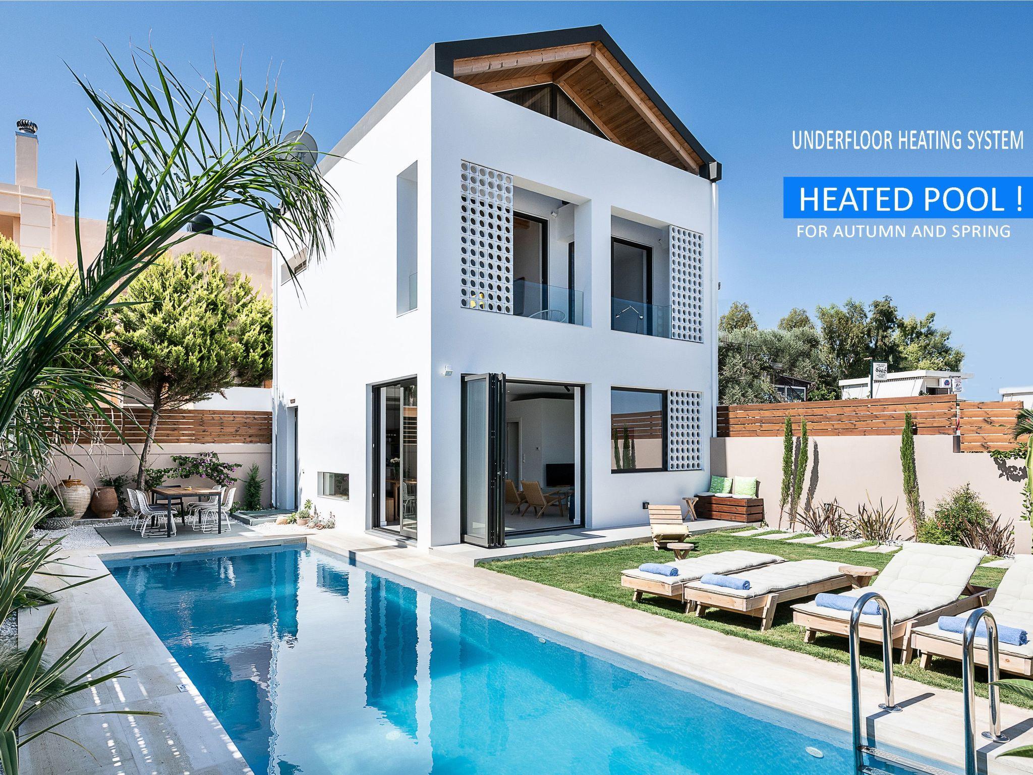 Fos Villa is a brand new house located at the entrance of Galatas village and enjoys views of the Mediterranean sea, Ag. Theodori island and Chania town. The villa is designed and decorated by the owner and architect Christini Polatou. The Villa consists of a basement looking in a patio, a ground floor, a first floor and a top floor a total of 185m2. Also, the outdoor space includes a 150m2 free space and garden with a 30m2 swimming pool.