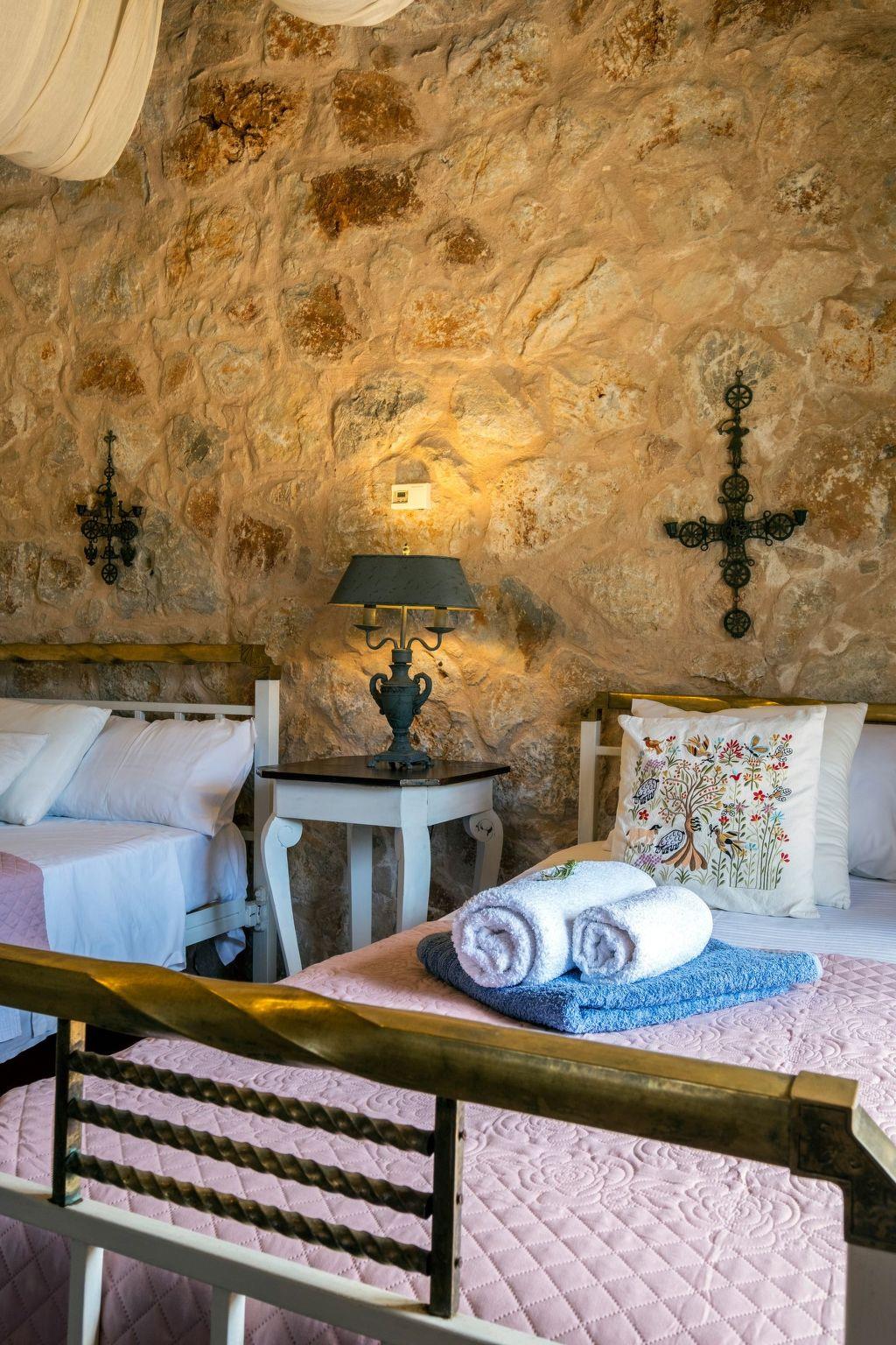 The holiday villa is a double floor stone built traditional Cretan village house of 140 square metres. Big windows on all the sides of holiday villa provide plenty of day light. It features three bedrooms and can accomodate up to seven persons.