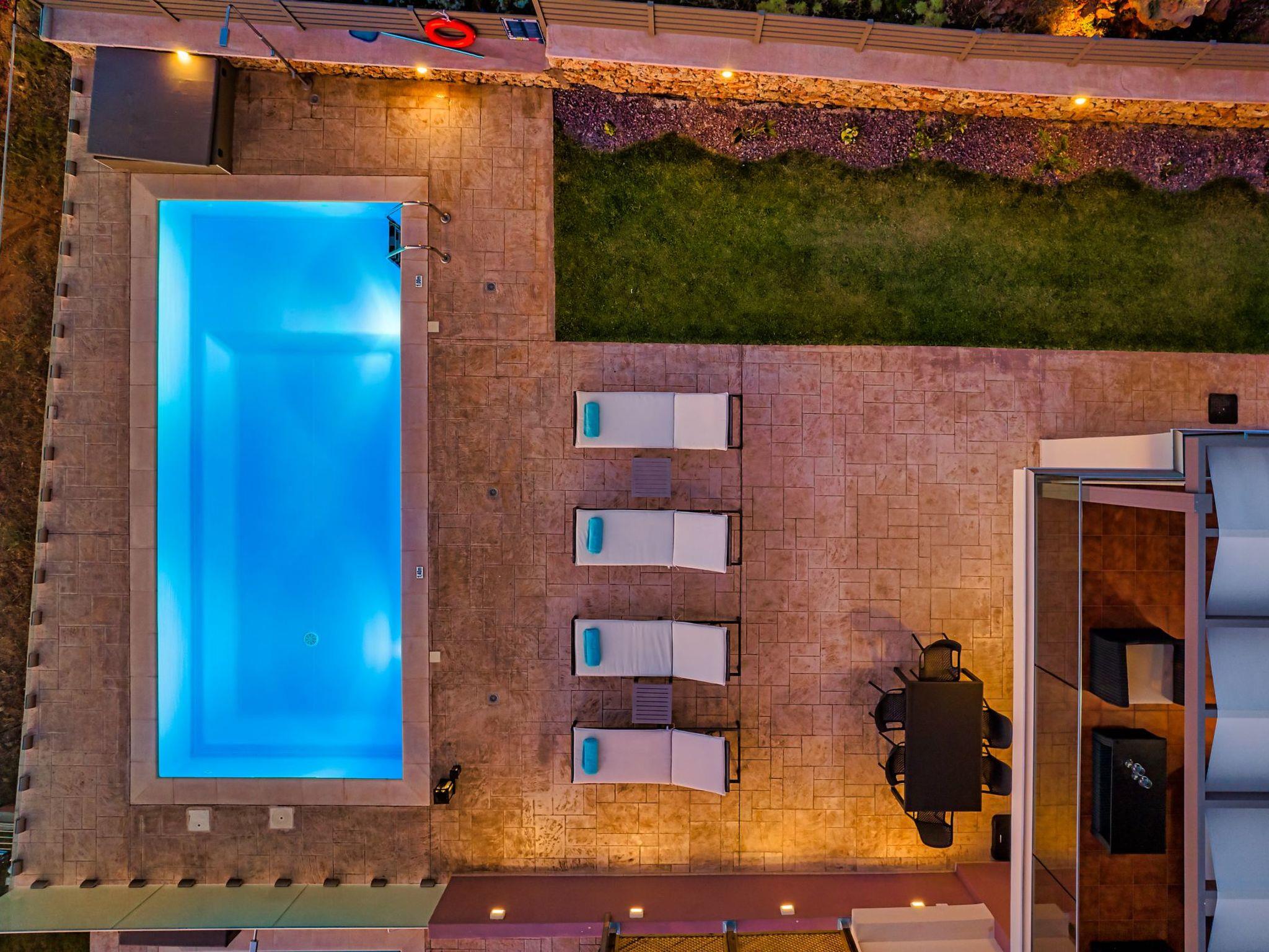 The highlight of the villa is the back, where the pool is located, providing an ideal spot to enjoy breathtaking sunsets. The pool utilizes saltwater electrolysis, known for being gentler on the eyes and skin compared to traditional chlorine. Outdoor amenities include four sunbeds with two small tables, an umbrella, a dining table for six, and an outdoor shower. The pool is for exclusive use, and pool towels are provided.