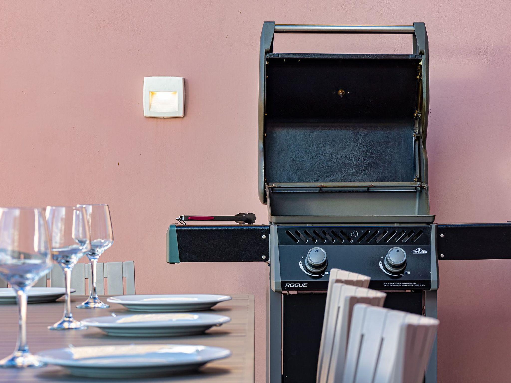 At the back of the villa, there's a private pool waiting for you. It's a great spot to watch the sky change colors at sunset. The pool utilizes saltwater electrolysis, known for being gentler on the eyes and skin compared to traditional chlorine. We've got everything you need outside: six sunbeds, tables, an umbrella for shade, a dining area that seats ten, an outdoor shower, and a BBQ grill.