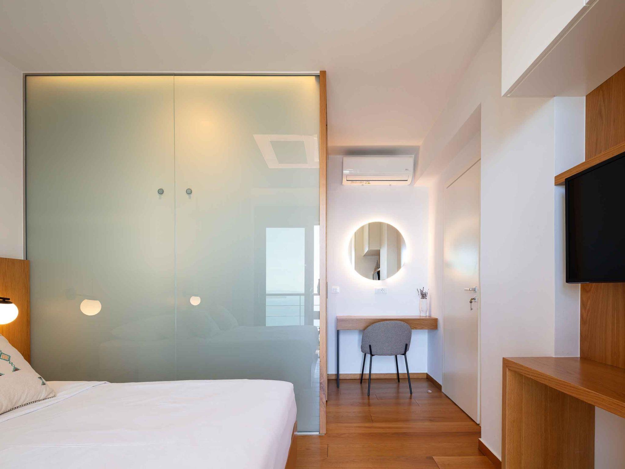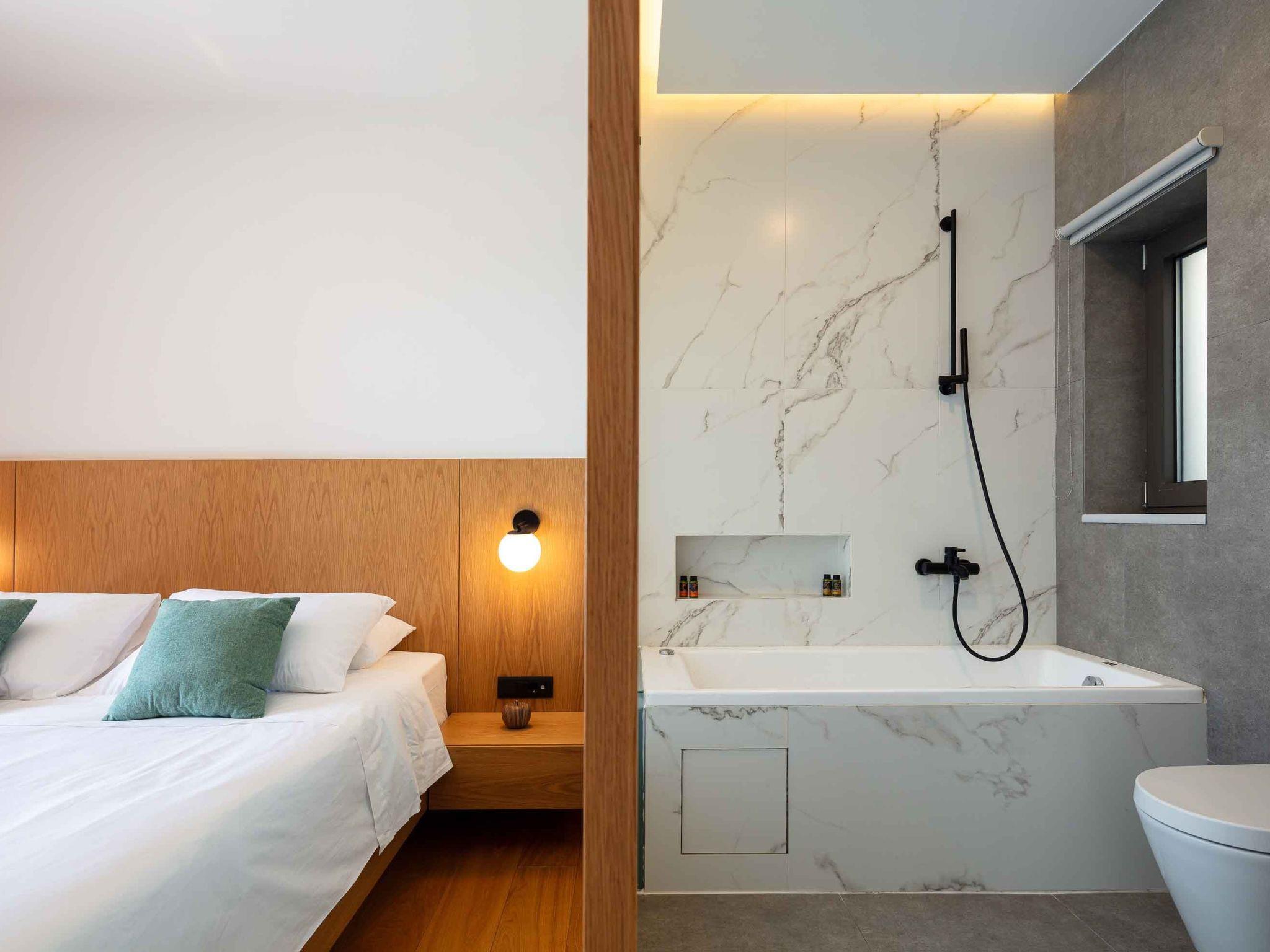 Bedroom 1: Double size bed (1.60x2.00), A/C, 32’’ Smart Satellite TV, ensuite bathroom with bathtub, hairdryer, safe box, private balcony, seaview