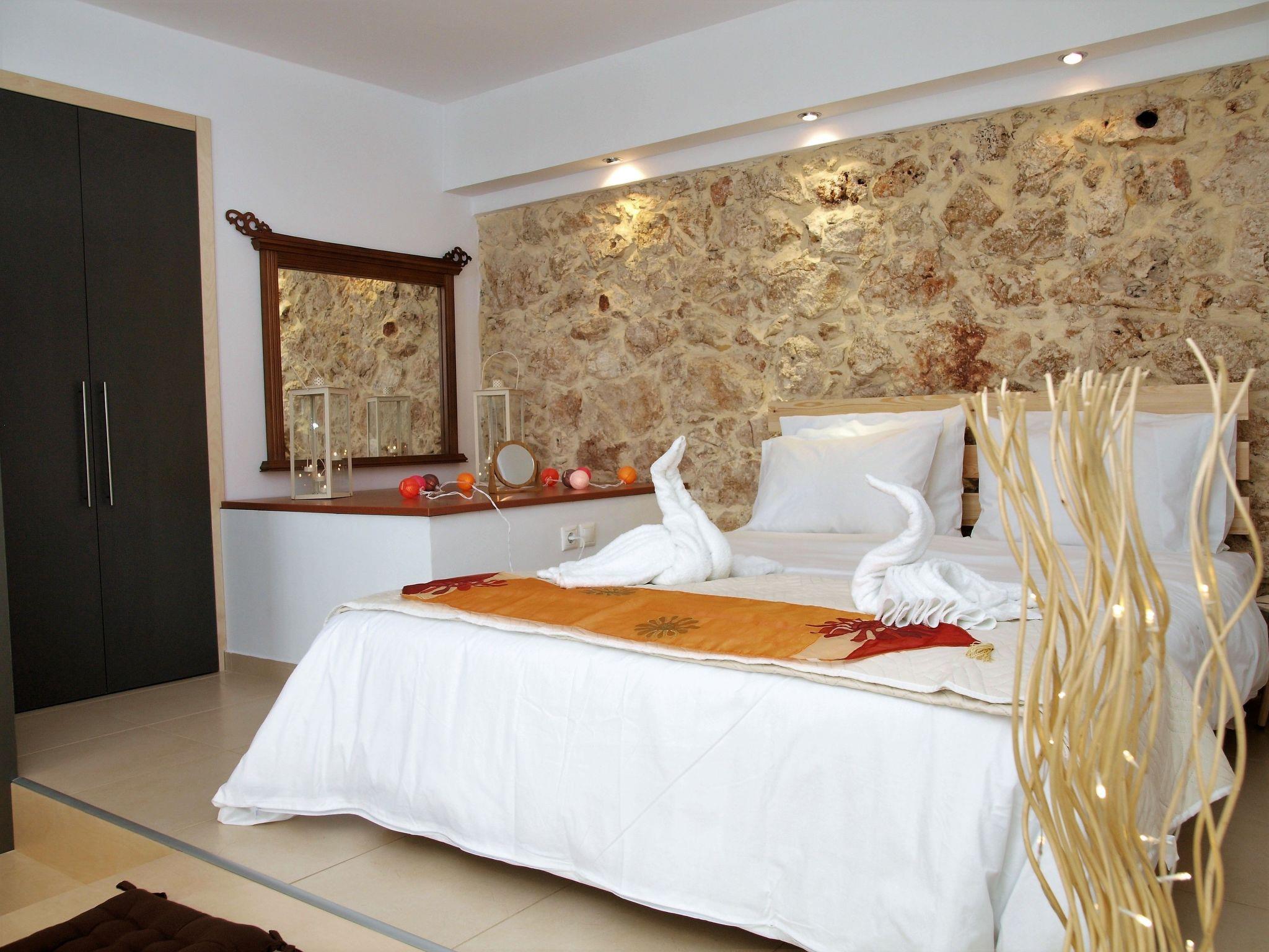 A traditional Cretan treat is welcoming you while the home is equipped with everything that includes a full house as well as everything you may need for your personal care. A full kitchen with filter and espresso coffee makers, a desk to touch your laptop, a comfortable living room and a double handmade bed, dominating the highest level of the house, from which one can enjoy day and night the stunning sea and mountain view from the large windows.The view is even better than the balcony of the studio, which "sees" also towards the rock garden and the small pine forest. From here, you can watch the most beautiful sunrise: You'll have to sucrifice your lie-in, but it will be unforgettable!