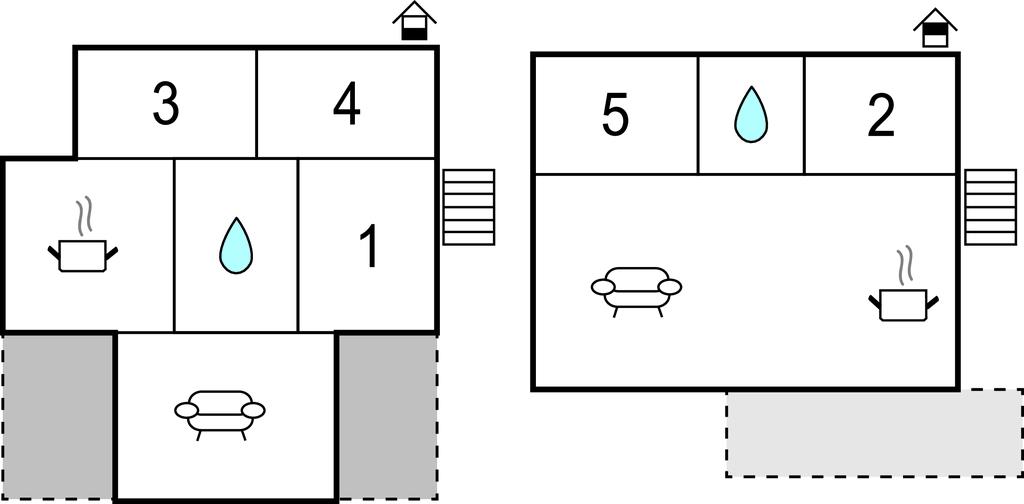 Huset er fordelt over to etager med forskellige indgange, forbundet af en ydre trappe. De 5 soveværelser, 2 stuer, 2 badeværelser og to køkkener giver god plads til op til 10 personer, der vil holde ferie sammen. Køkkenet er udstyret med alt, hvad I behøver.