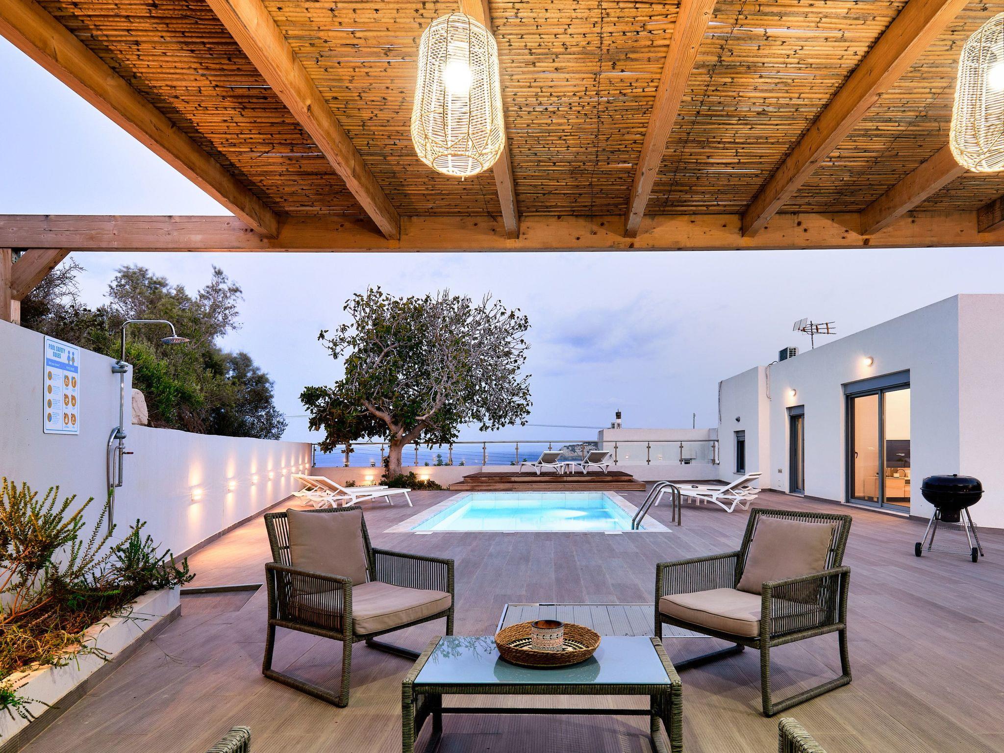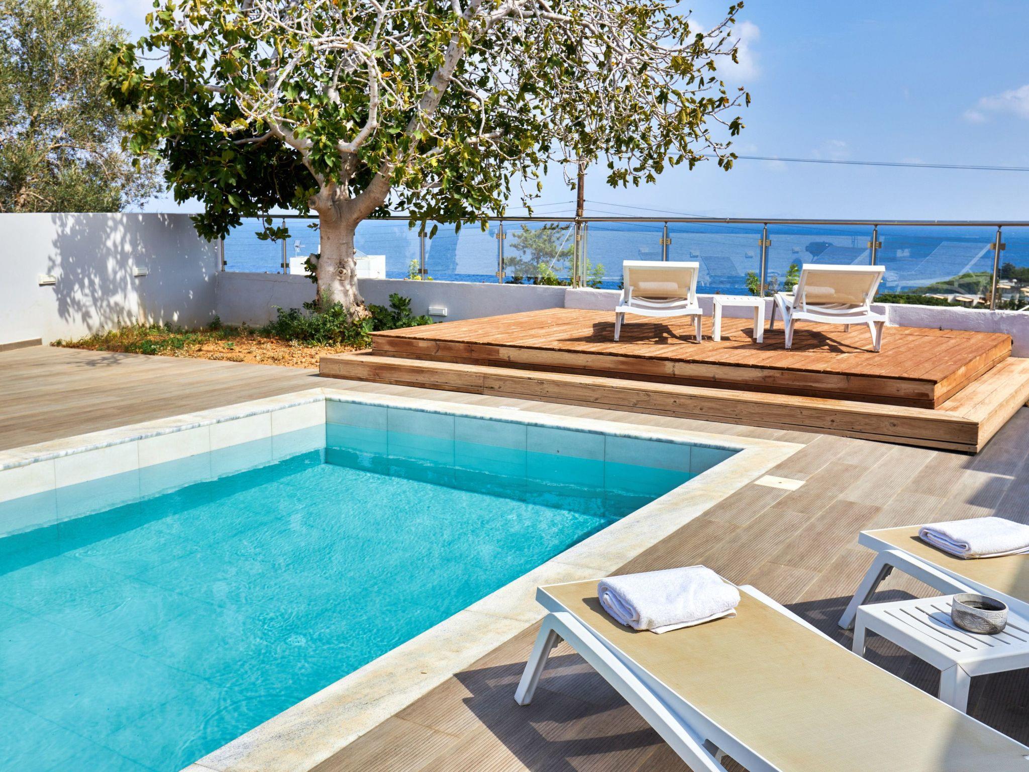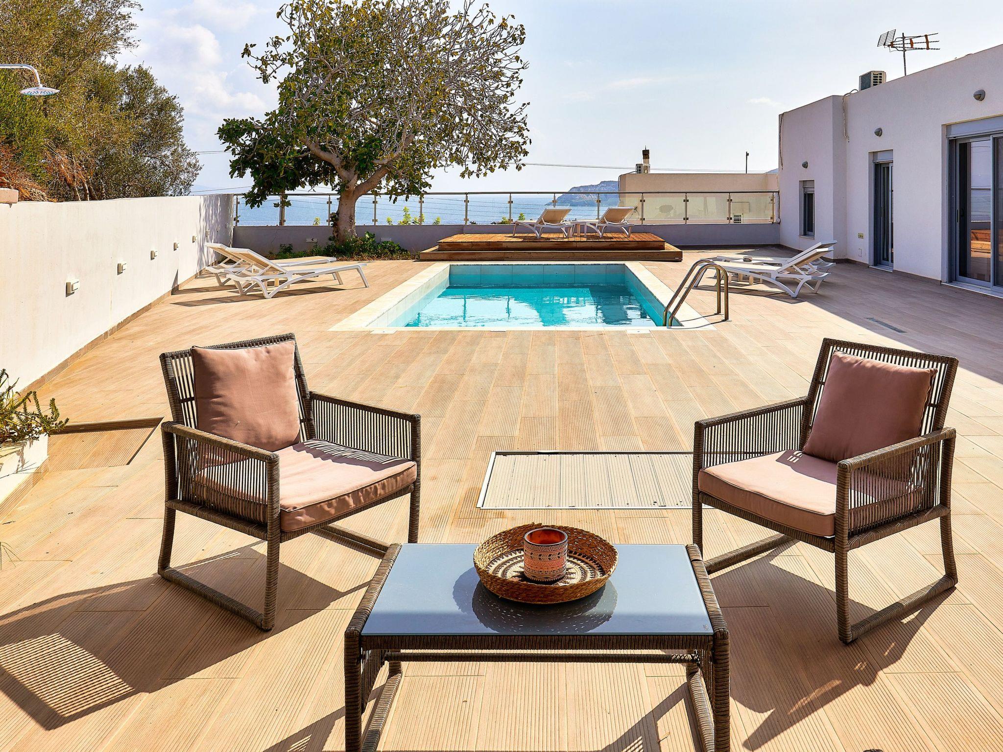 Situated on a hill 350m from the sea , the complex consists of two separate villas sharing a 4000sqm yard with magnificent views of the sea and surrounding area. The Modern Villa Emilia (107sqm) features a spacious garden, minimal style and comfortable setting with 3 en-suite bedrooms. and a private swimming pool (32sqm, 1.5m deep). The sea-view sun deck offers great views of the Cretan sea!