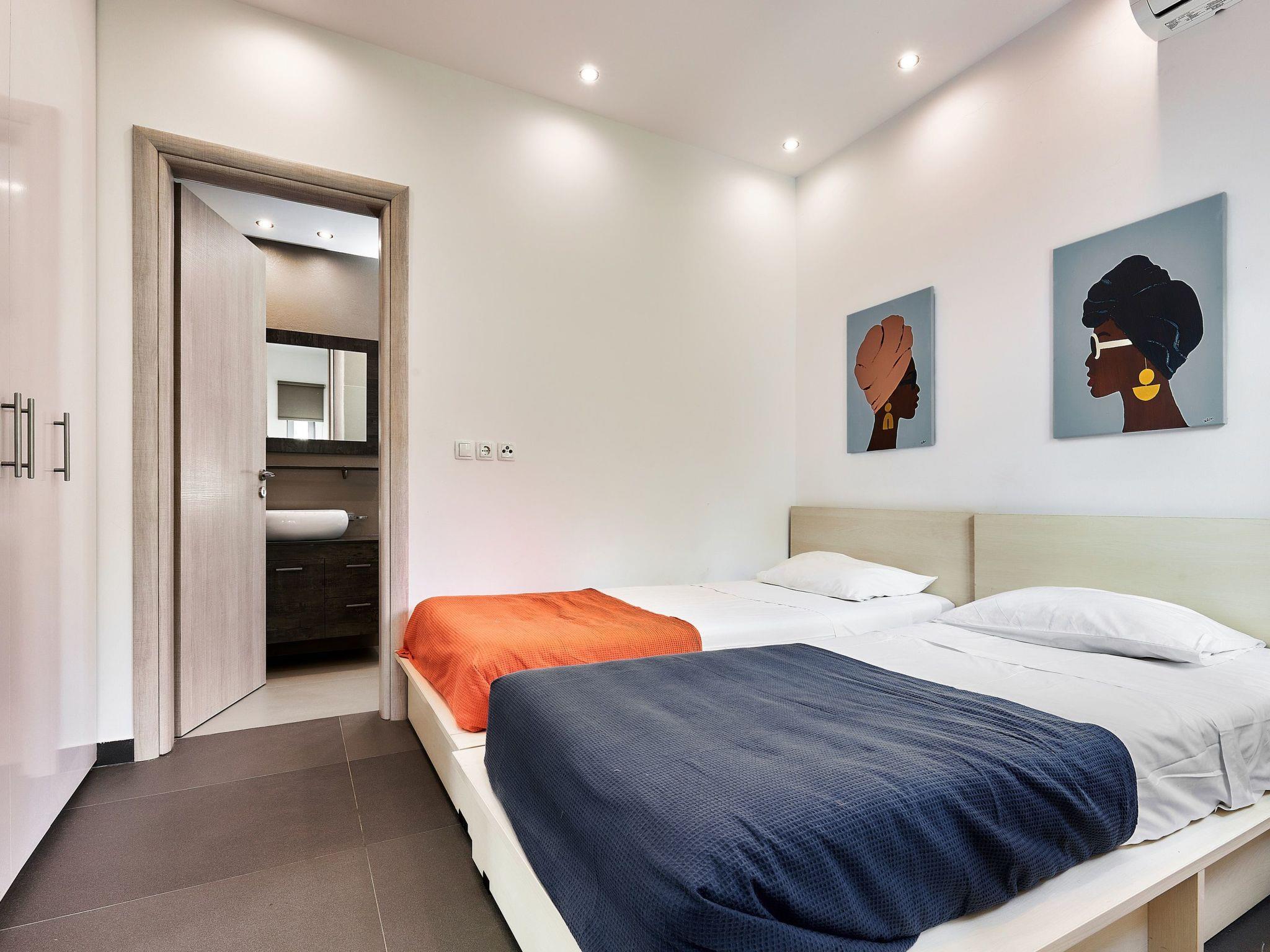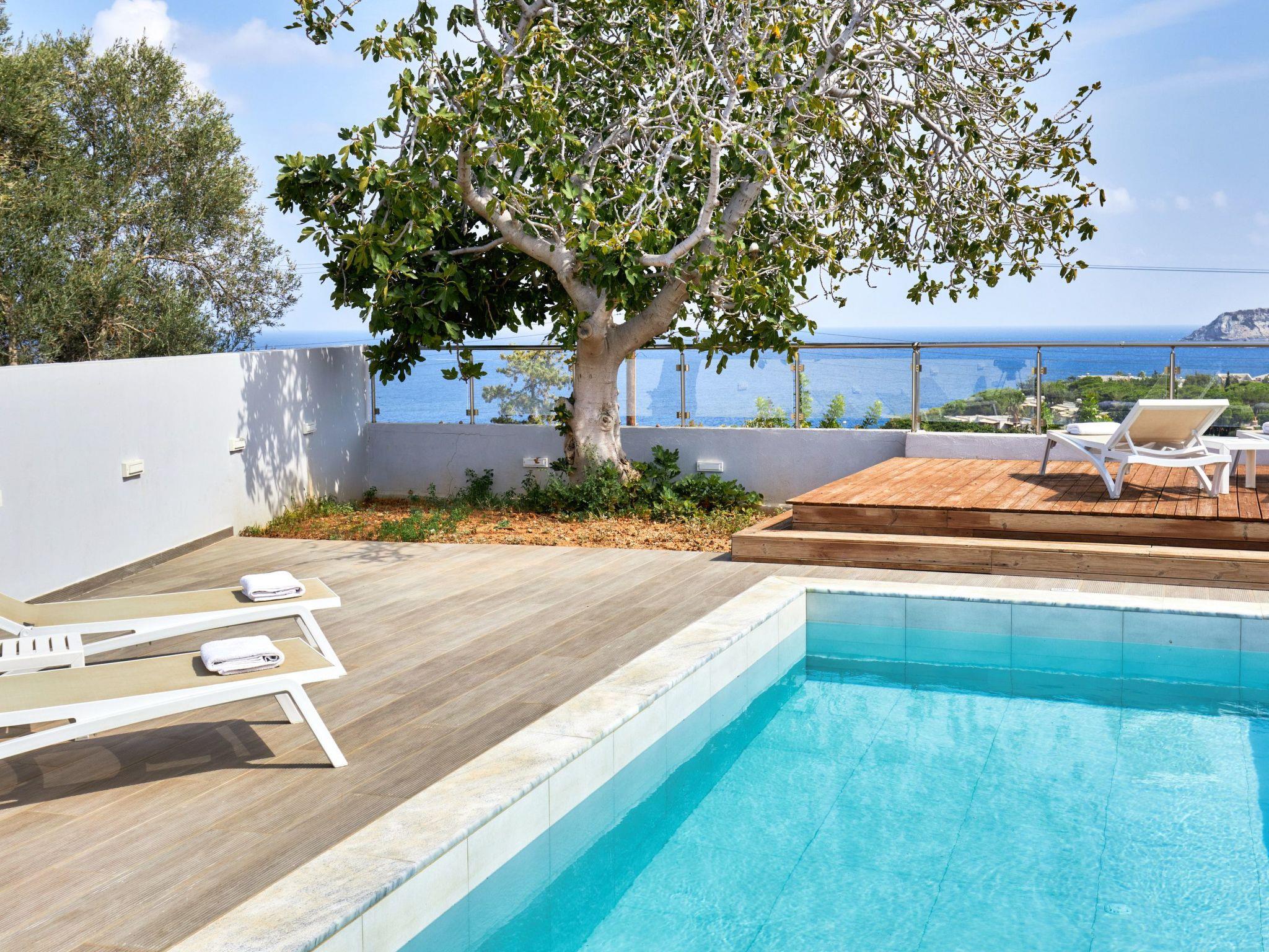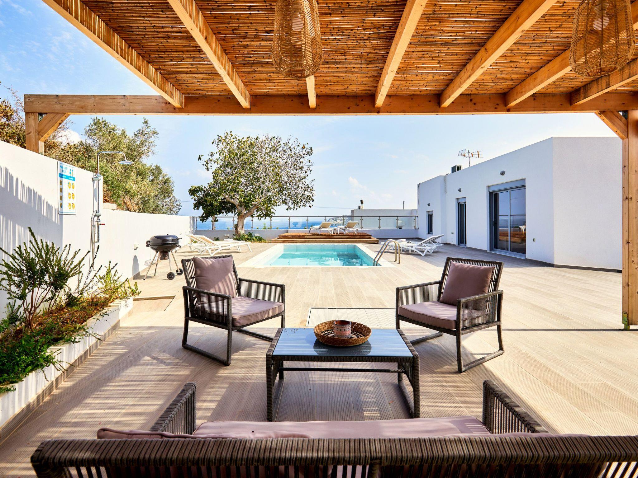 Situated on a hill 350m from the sea , the complex consists of two separate villas sharing a 4000sqm yard with magnificent views of the sea and surrounding area. The Modern Villa Emilia (107sqm) features a spacious garden, minimal style and comfortable setting with 3 en-suite bedrooms. and a private swimming pool (32sqm, 1.5m deep). The sea-view sun deck offers great views of the Cretan sea!