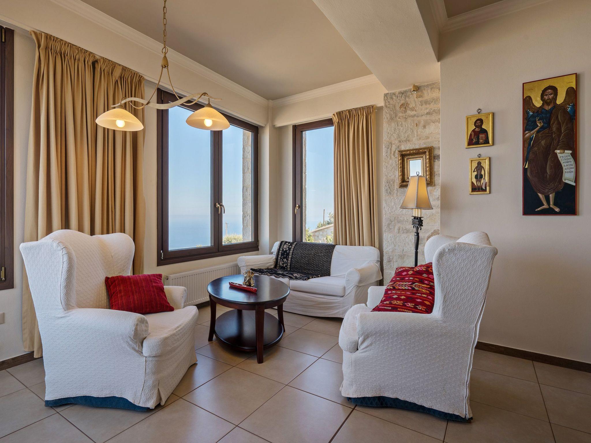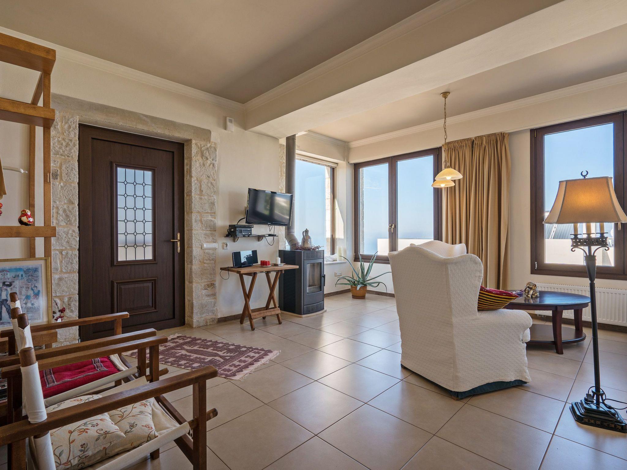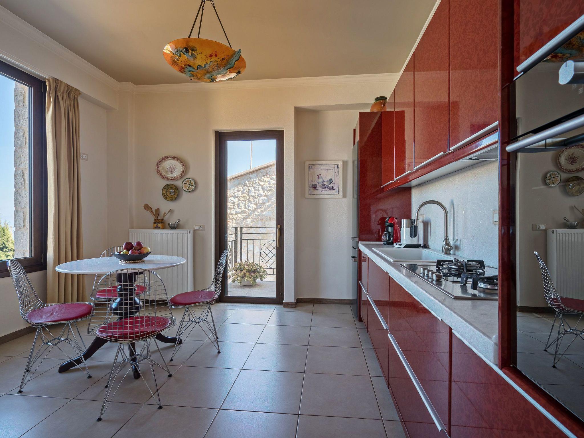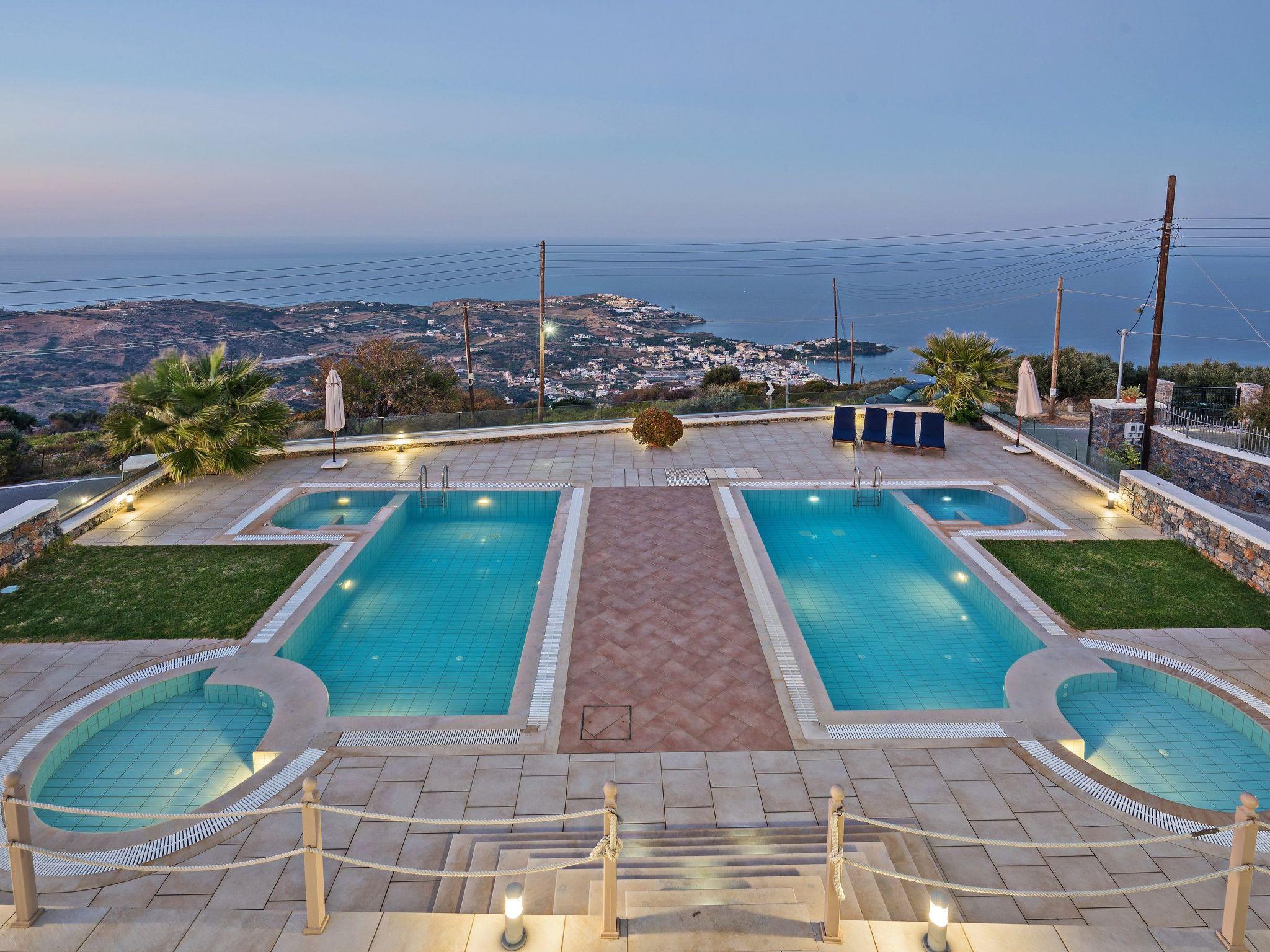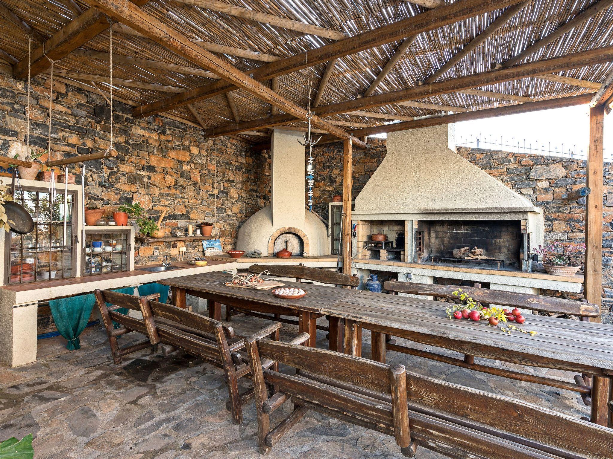 Anemomylos villas are located in a marvelous place with breathtaking uninterrupted views of the sea. It has 2 large private pools which are heated and with a jacuzzi. The closest beach is only 5 km away, where you can also find restaurants, taverns, cafes bars, and intense nightlife. Only 18 km away is the biggest city of Crete, Heraklion where you can find everything you like. ?Distances? nearest beach 5km nearest grocery 5km nearest restaurant 5km Heraklion airport 18km Chania airport 145km An unforgettable experience awaits you at these traditionally wooden-stone-built villas, natural beauty combined with interior comforts can satisfy even the most demanding guest. This property is a combination of 4 different apartments. There are 2 apartments of 100sqm each, where there is one double bedroom and one bedroom with 3 single beds in each one of them. Total 5 persons in each of these 2 apartments. Moreover, there is a veranda with amazing views of the landscape and sea. Then there is another studio with one bedroom with a double bed and two single beds. Lastly, on the back side of the property, there is another maisonette apartment with 1 double bedroom and one more bedroom with a double bed and a single bed. All 4 apartments are fully equipped since they all have their own kitchen, living room, dining area, and bathrooms. A communal play area of 100 sqm where you can also have dinner or lunch. So each one has their own privacy but yet again you will all be sharing the same grounds and 2 pools. At the back side of each villa, one can find a barbeque with a dining table and a parking area. Every apartment has an elegant living room with a fireplace, television, and air conditioning. The kitchen is fully equipped with electric appliances such as a cooker, fridge, coffee maker, microwave oven, dishwasher, washing machine, etc. Outside Area: a protected BBQ area from the wind along with a kitchen and a dining table. Check out is 11:00 latest and check-in is at 15:00 earliest.
