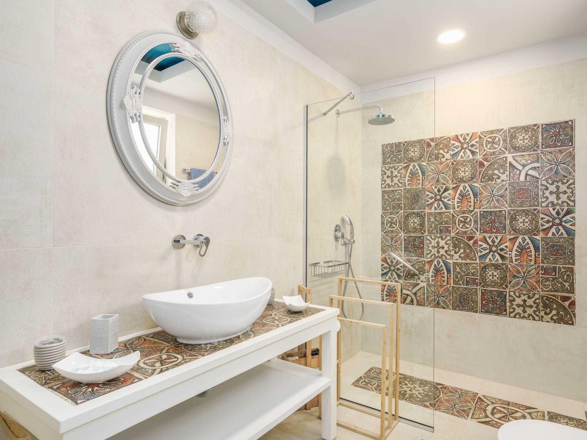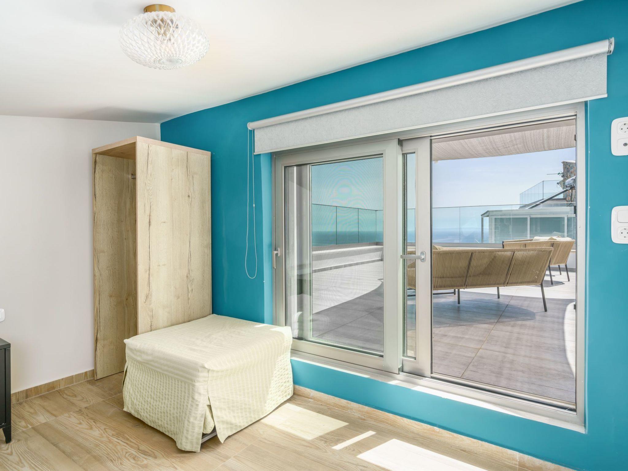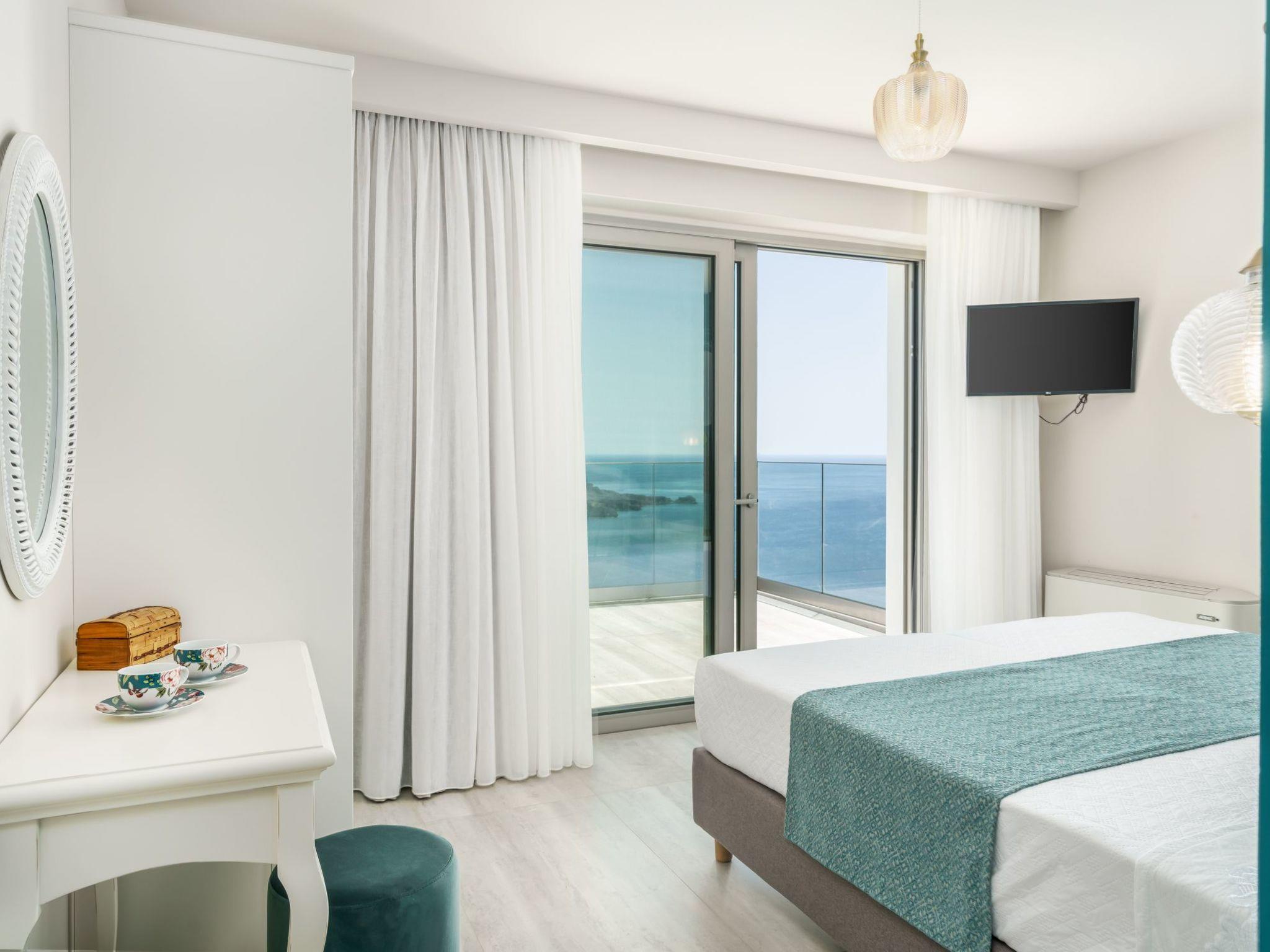 The villa includes two beautifully furnished double bedrooms, each with satellite TV and terrace access that offers breathtaking sea views. Modern bathrooms are equipped with hair dryers, toiletries, and plush towels for added comfort. The 2nd-floor loft houses the villa's second bathroom and additional bedding for a fifth guest, while modern heat pumps provide eco-friendly temperature control.