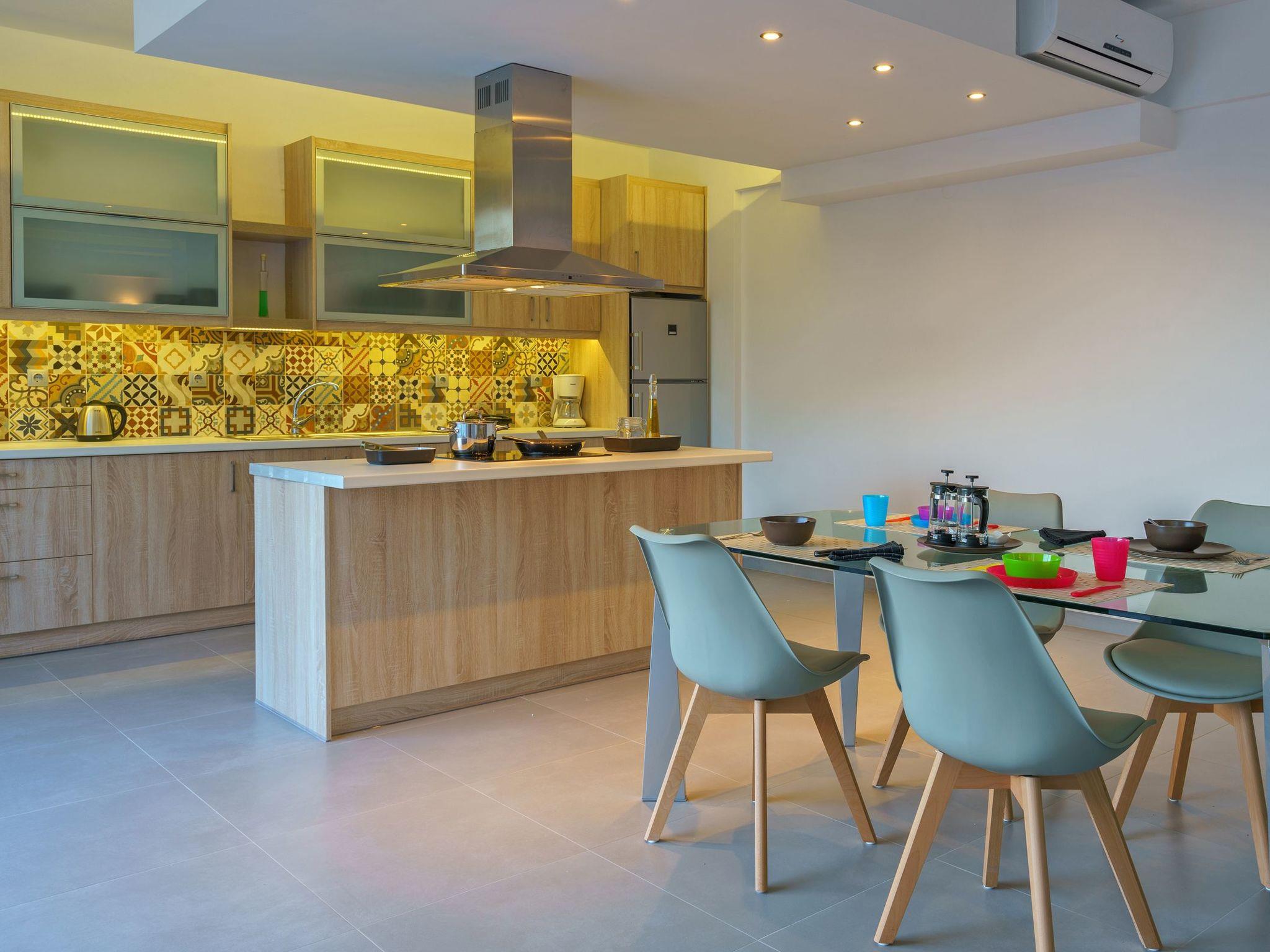 Iakinthos residence consists of two floors with a total area of 170 sq m., and it can host up to six (6) people +1 sofa bed. At the ground floor, there is a large, fully equipped kitchen with a dining table, a spacious living room with comfortable sofas, and a large satellite TV. On the same floor, there is also a master bedroom with an ensuite bathroom. A staircase leads to the first floor, where there are two more master bedrooms with ensuite bathrooms and a large balcony where you can enjoy the unobstructed view of the sea. All bedrooms are equipped with king-size beds and closets. All bathrooms in the residence have a modern design and are equipped with high-quality bathroom amenities. A washing machine is also provided. Outdoors, there is a 28 sq m. private swimming pool with deck chairs where you can relax under the Cretan sun and prepare a meal in the stone barbecue. The pool is surrounded by a beautiful garden with local plants. A parking space for your car is also available. Housekeeping is provided twice a week (or upon request). A baby cot and high chair are available on request without charge. Check out is 11:00 latest, and check in is 15:00.