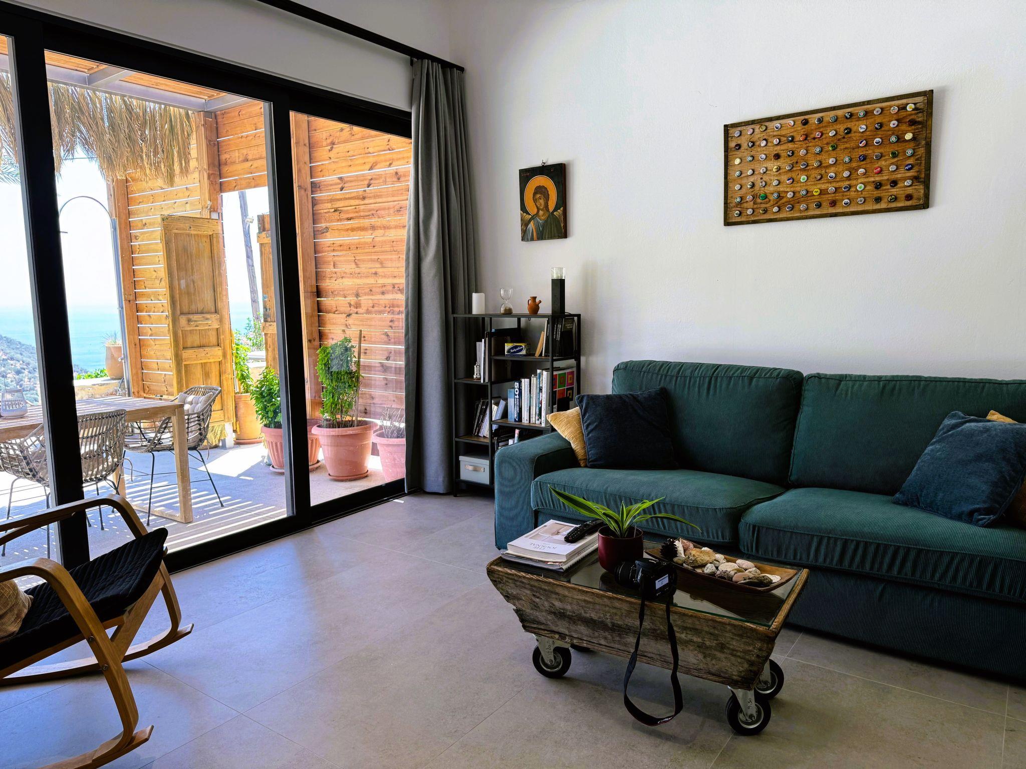The allure of South Palms extends to its captivating outdoor area. Here, a private garden awaits guests, offering an exclusive oasis for unwinding amidst the beauty of Crete. The garden's standout feature, a modern pool, offers a refreshing respite from the warm sun and a chance to relax while taking in the serene views. The entire outdoor space is fully fenced and tailored to ensure privacy and security, providing a peaceful dog-proof haven for guests and their furry friends.