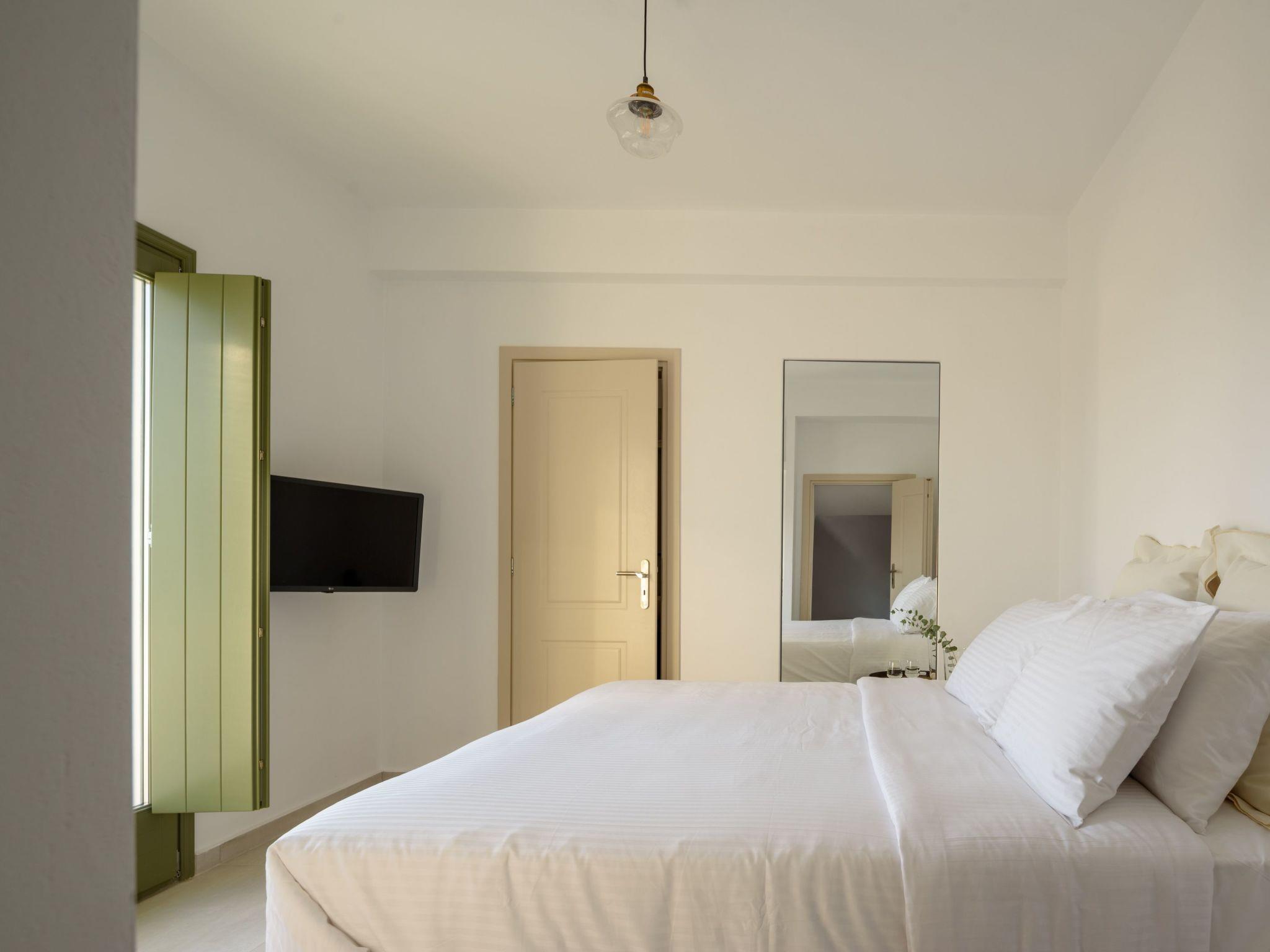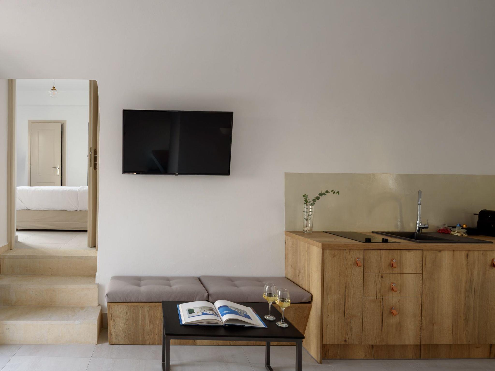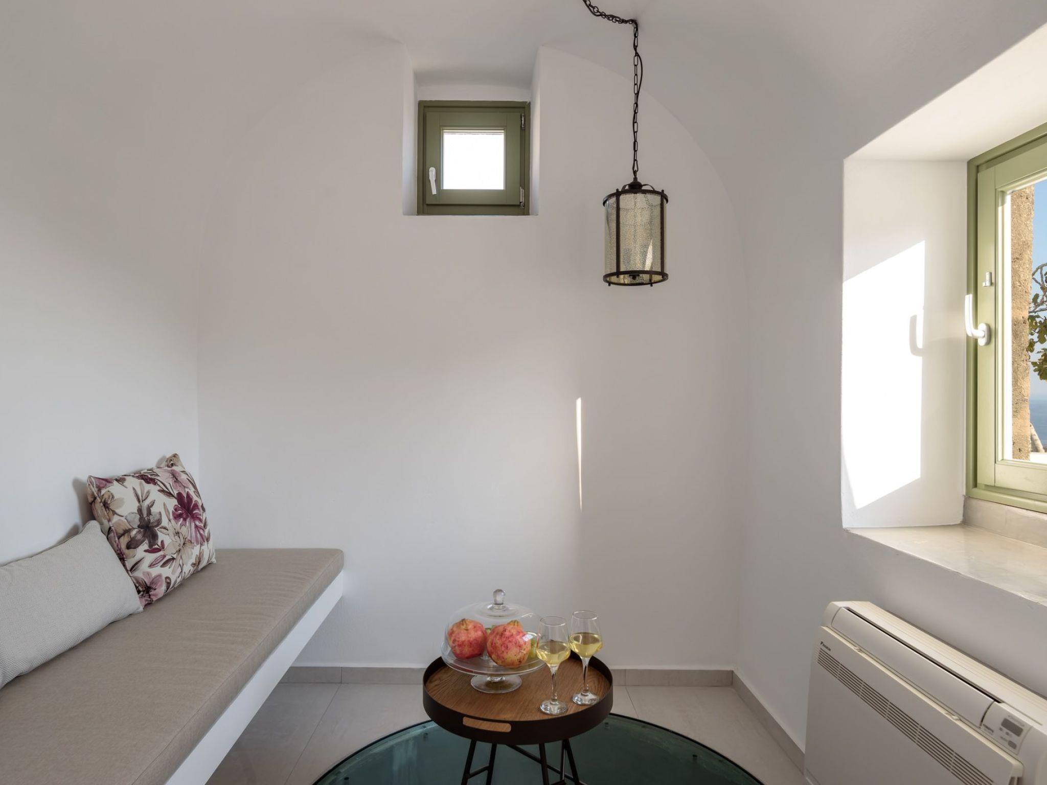 Inside, Villa Maria presents a haven of luxury, extending across 60m2 with a design that accommodates up to 2 adults and a child. The villa is an epitome of sophisticated living, featuring a bedroom that is a masterclass in elegance and comfort. The living spaces boast tastefully selected furnishings and meticulously crafted artwork that accentuate its Santorinian-inspired architecture. Modern amenities such as a 42' flat screen TV with satellite channels and Netflix, VDSL internet, and a safe, ensure every need is met with the highest standard of quality.