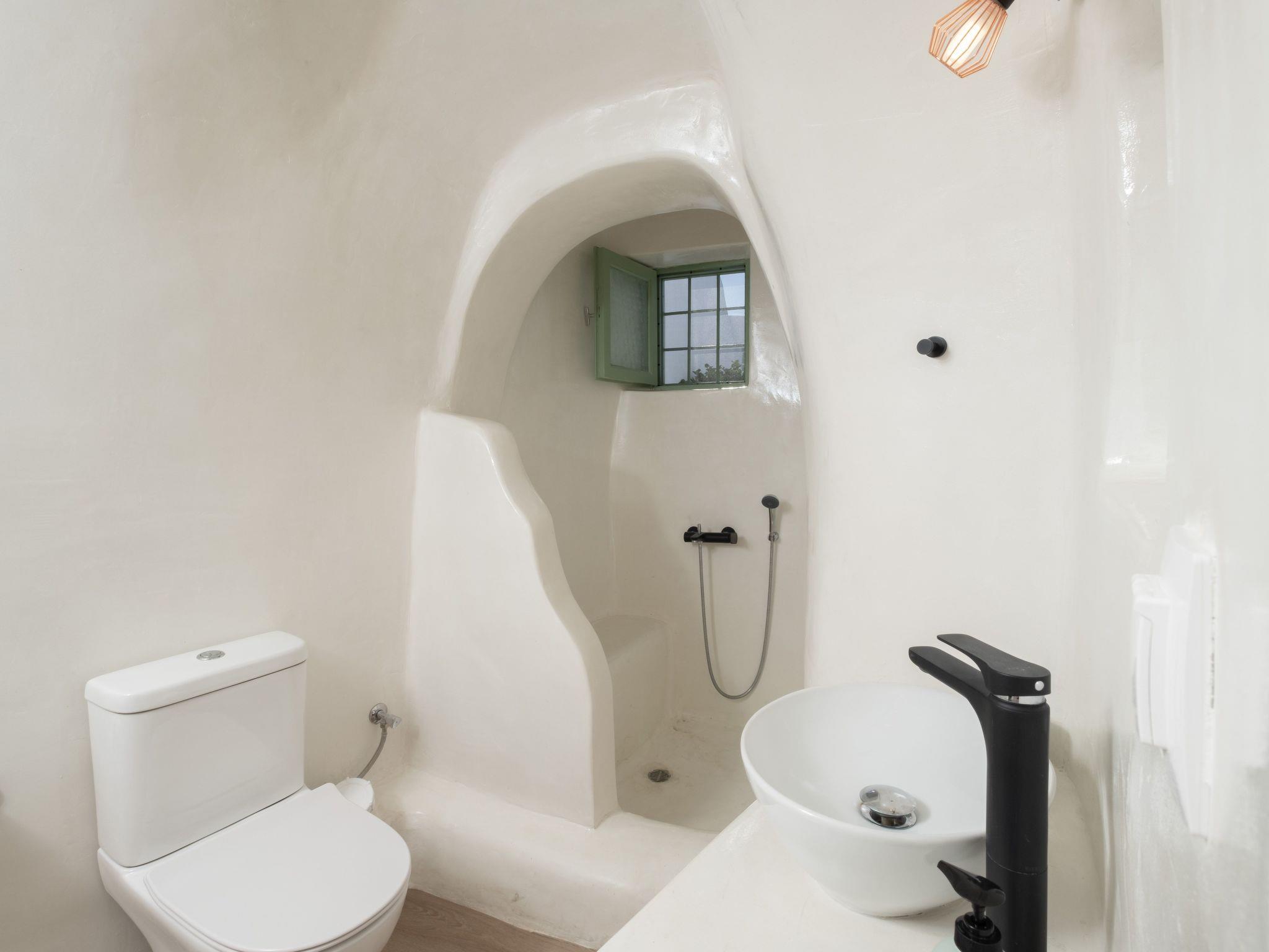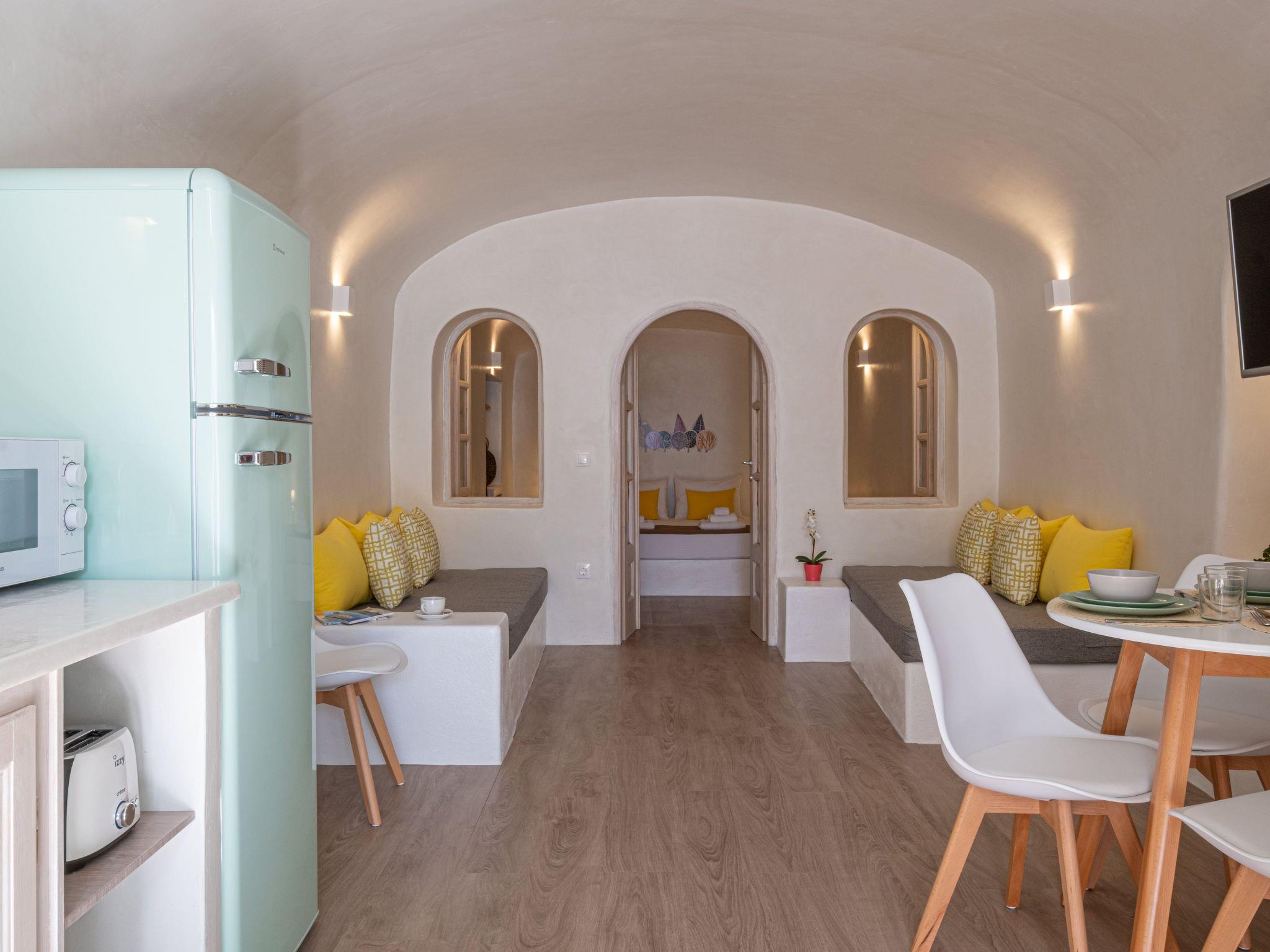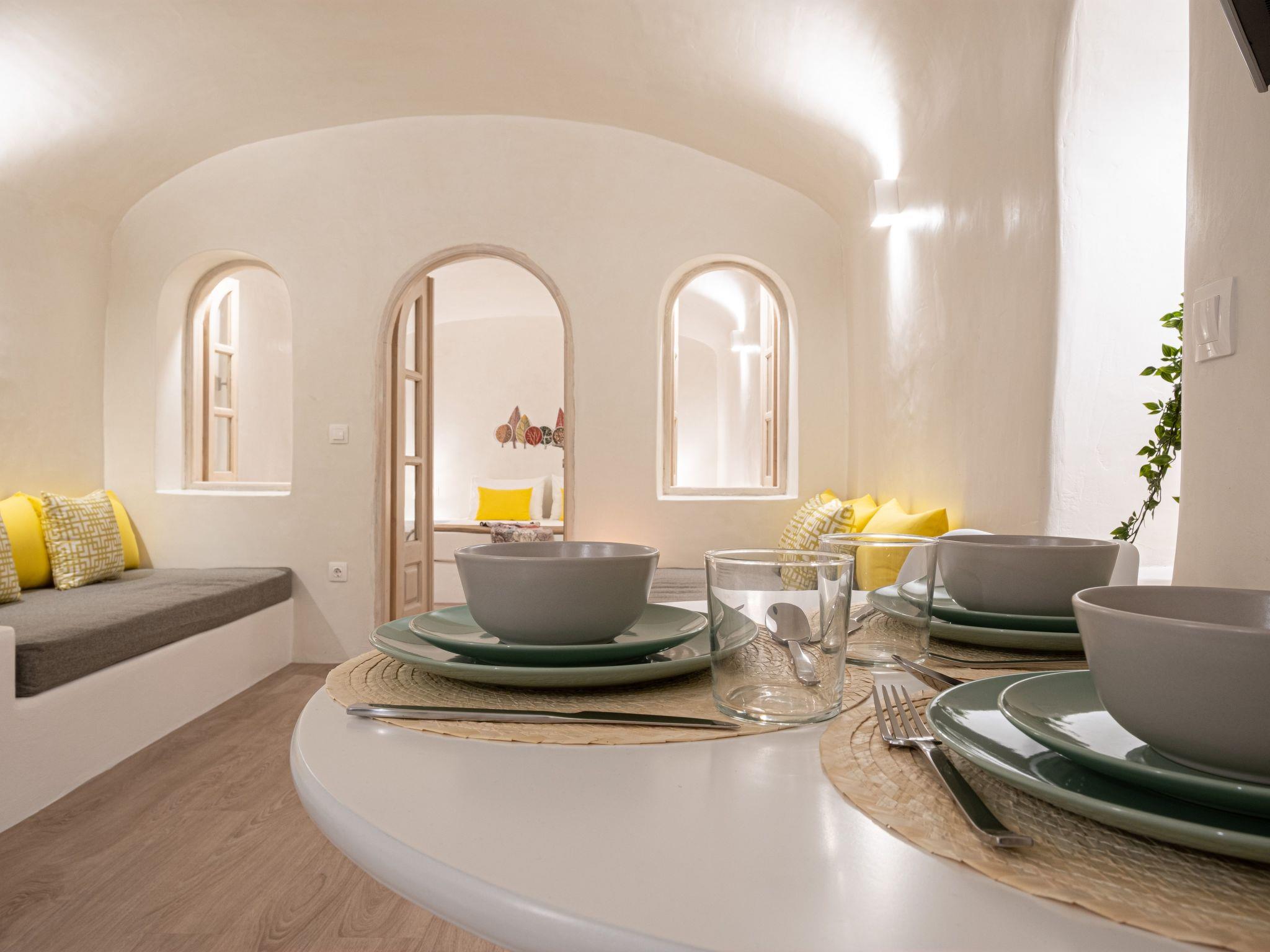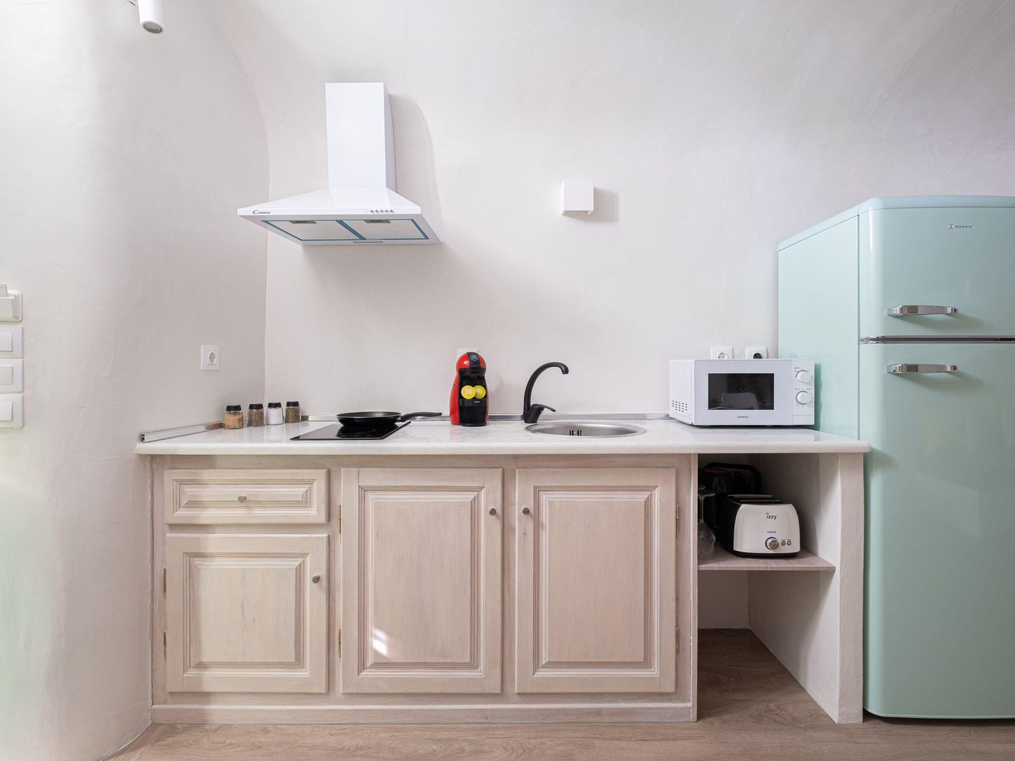 The main cave bedroom includes a king-sized bed with reading lights and an open mini closet. The fully equipped kitchen provides a warm and homely atmosphere, perfect for preparing meals or enjoying local cuisine. The dining table is ideal for meals with friends and family. The living room, furnished with sofa beds that convert into two single beds, offers space for relaxation and entertainment. It includes a flat-screen TV, air conditioning, Wi-Fi access, and connectivity to Netflix and YouTube. The small outdoor yard is a charming spot to savor authentic mornings or unwind during serene evenings.