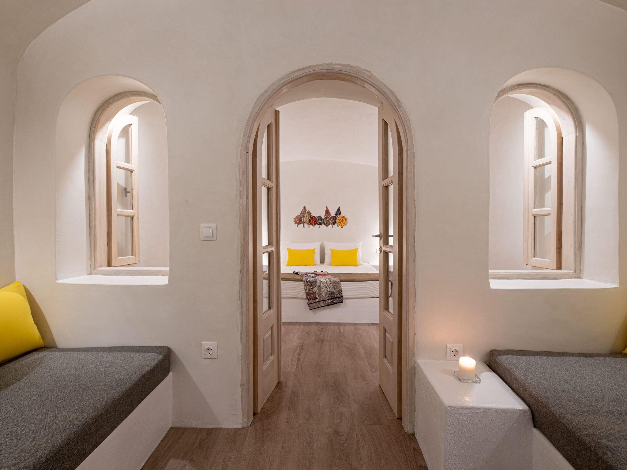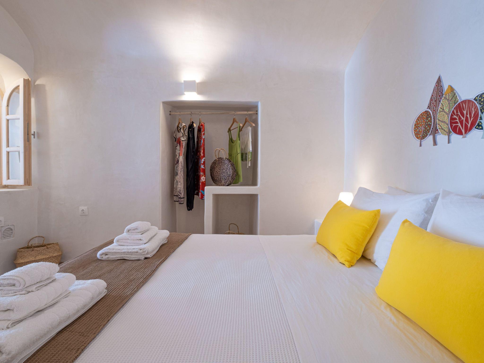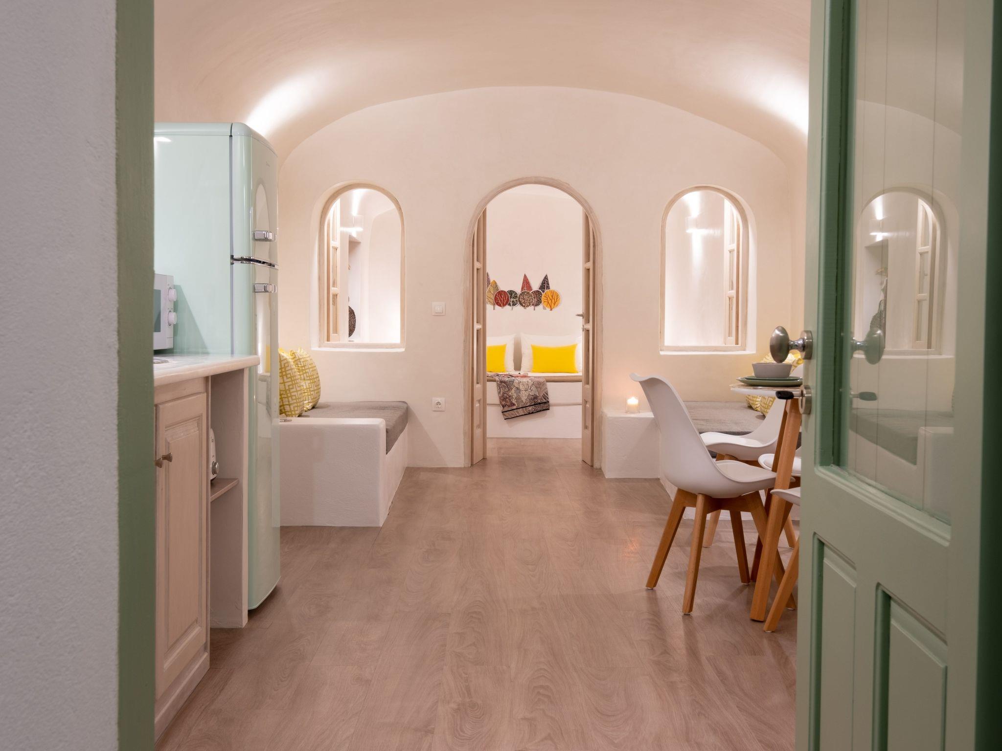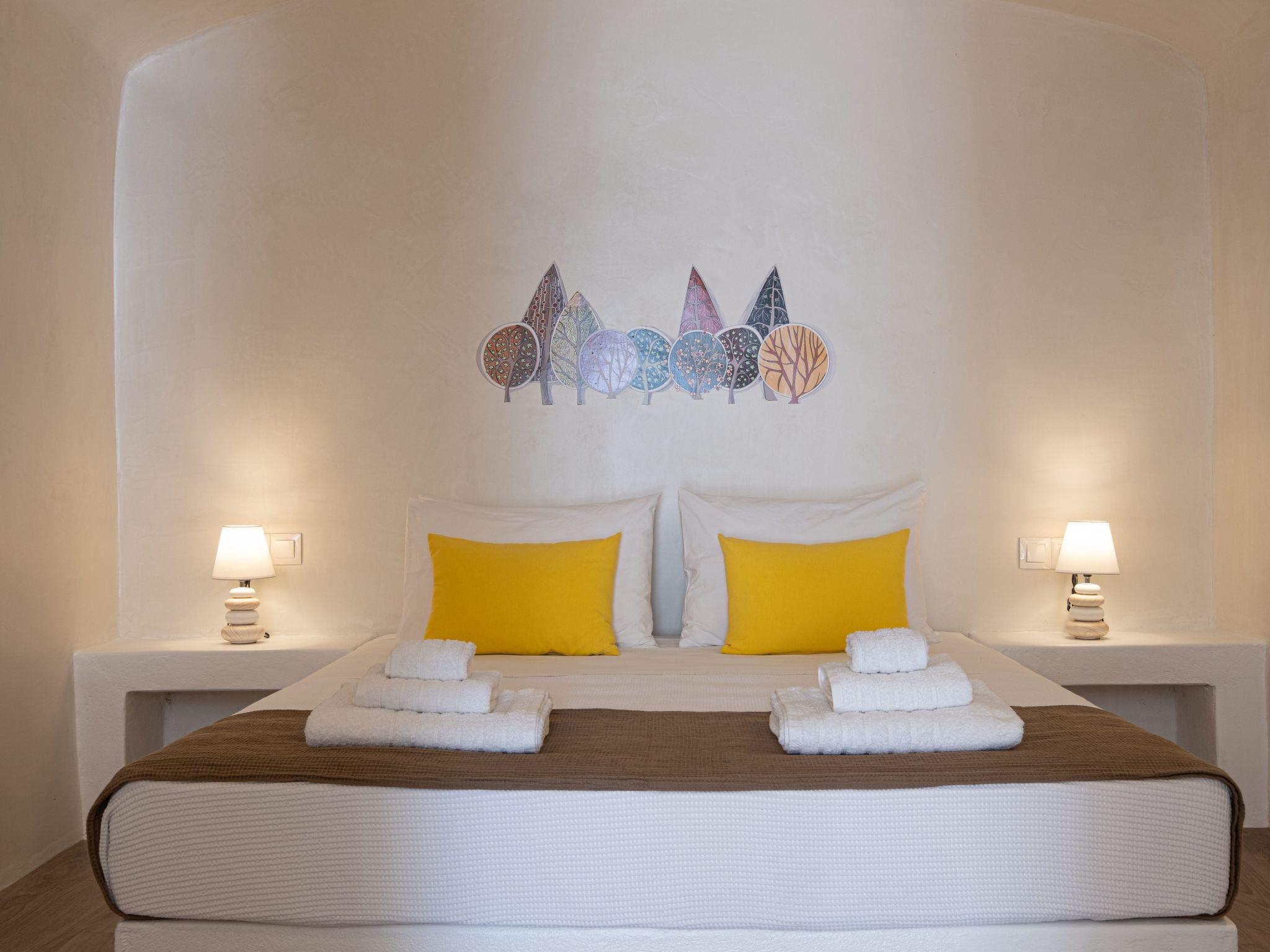 The main cave bedroom includes a king-sized bed with reading lights and an open mini closet. The fully equipped kitchen provides a warm and homely atmosphere, perfect for preparing meals or enjoying local cuisine. The dining table is ideal for meals with friends and family. The living room, furnished with sofa beds that convert into two single beds, offers space for relaxation and entertainment. It includes a flat-screen TV, air conditioning, Wi-Fi access, and connectivity to Netflix and YouTube. The small outdoor yard is a charming spot to savor authentic mornings or unwind during serene evenings.