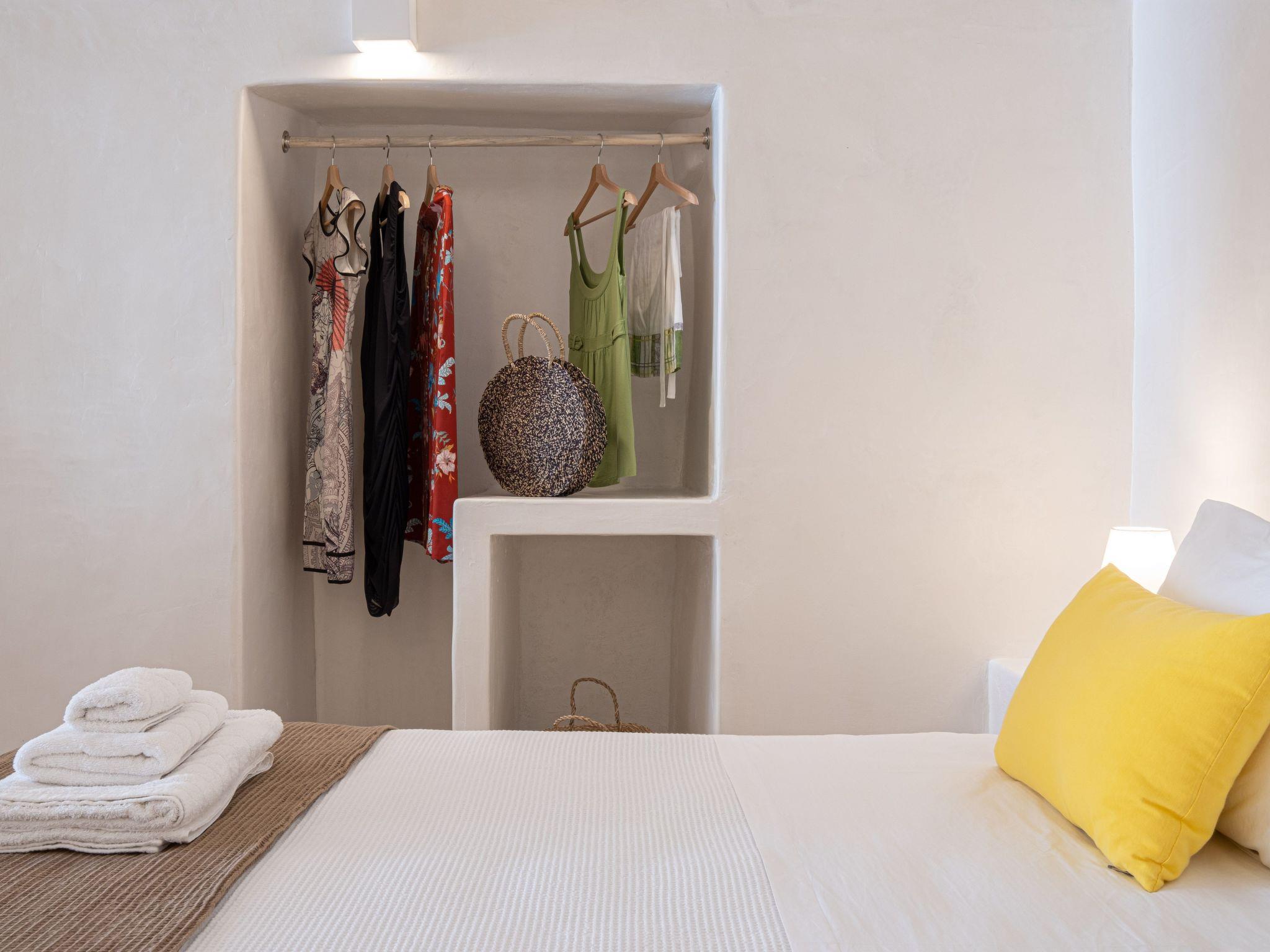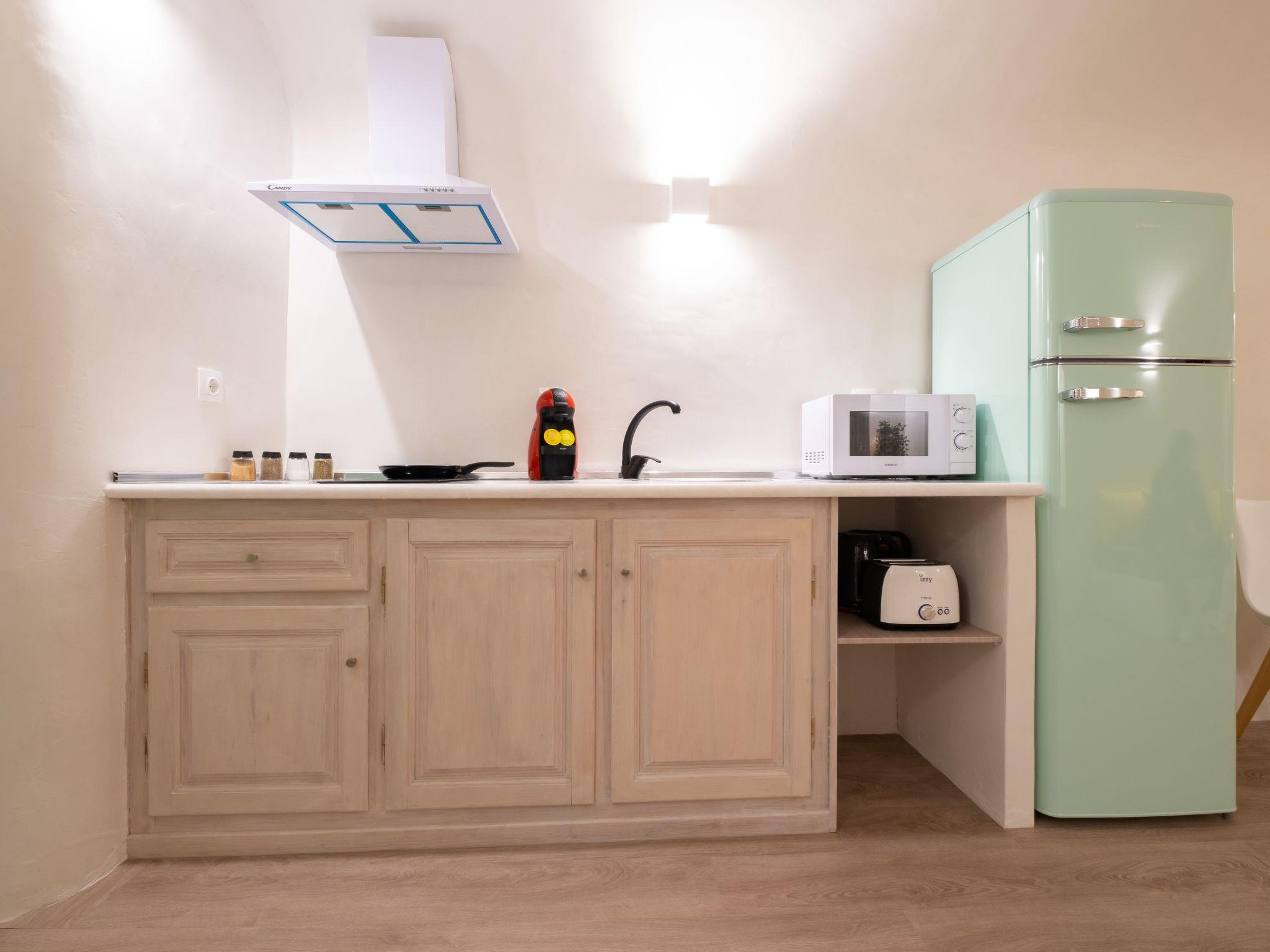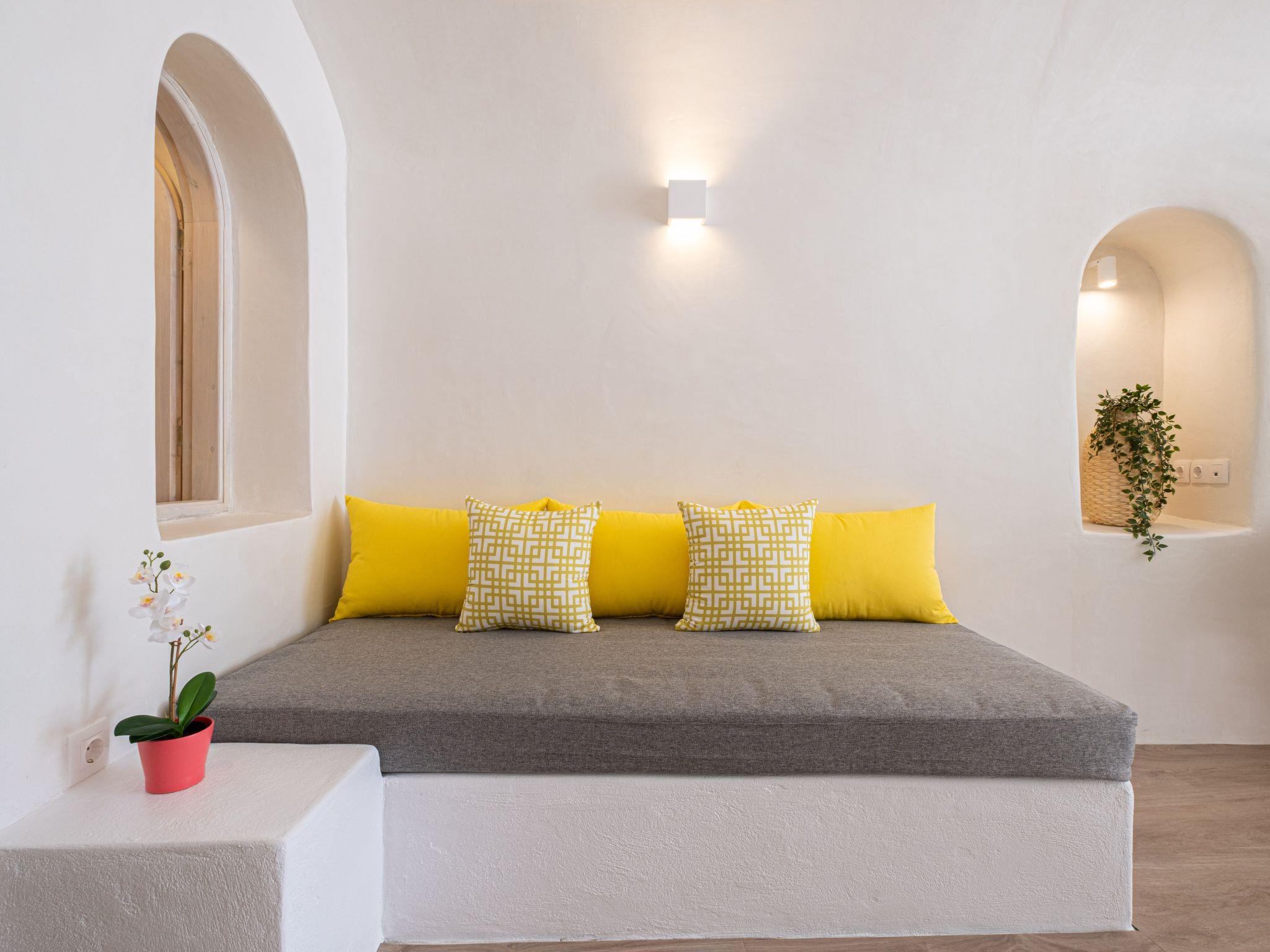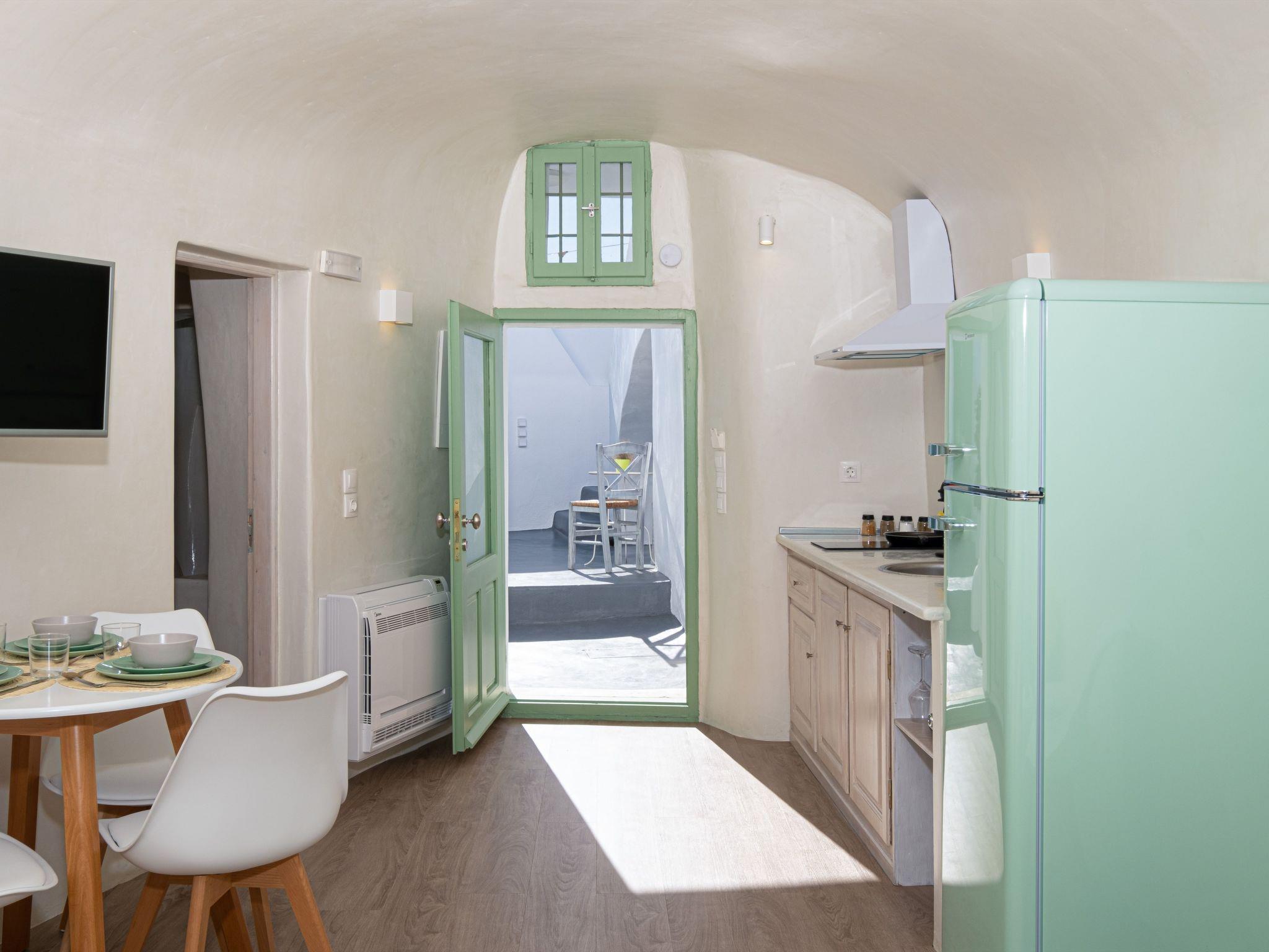The main cave bedroom includes a king-sized bed with reading lights and an open mini closet. The fully equipped kitchen provides a warm and homely atmosphere, perfect for preparing meals or enjoying local cuisine. The dining table is ideal for meals with friends and family. The living room, furnished with sofa beds that convert into two single beds, offers space for relaxation and entertainment. It includes a flat-screen TV, air conditioning, Wi-Fi access, and connectivity to Netflix and YouTube. The small outdoor yard is a charming spot to savor authentic mornings or unwind during serene evenings.