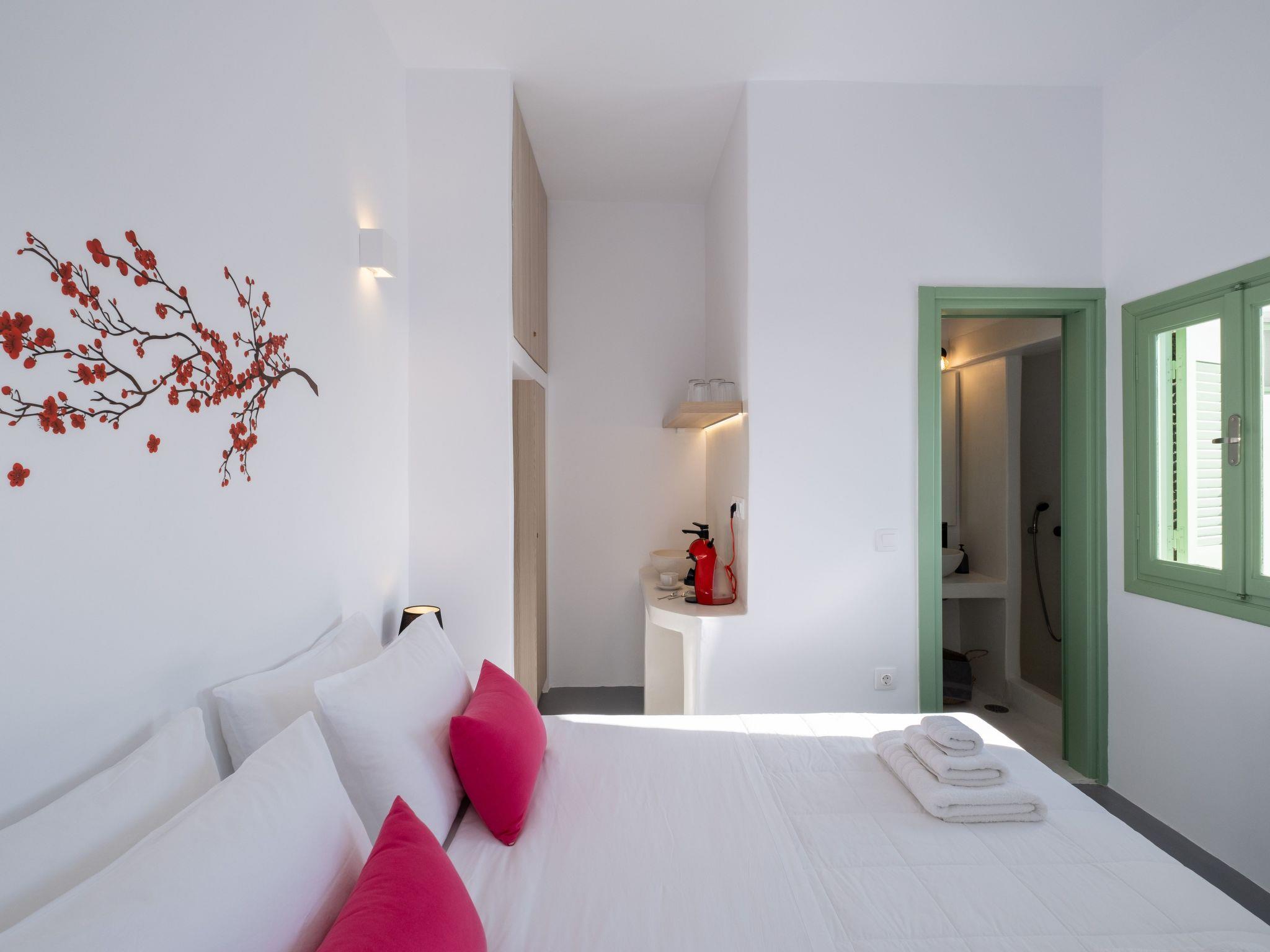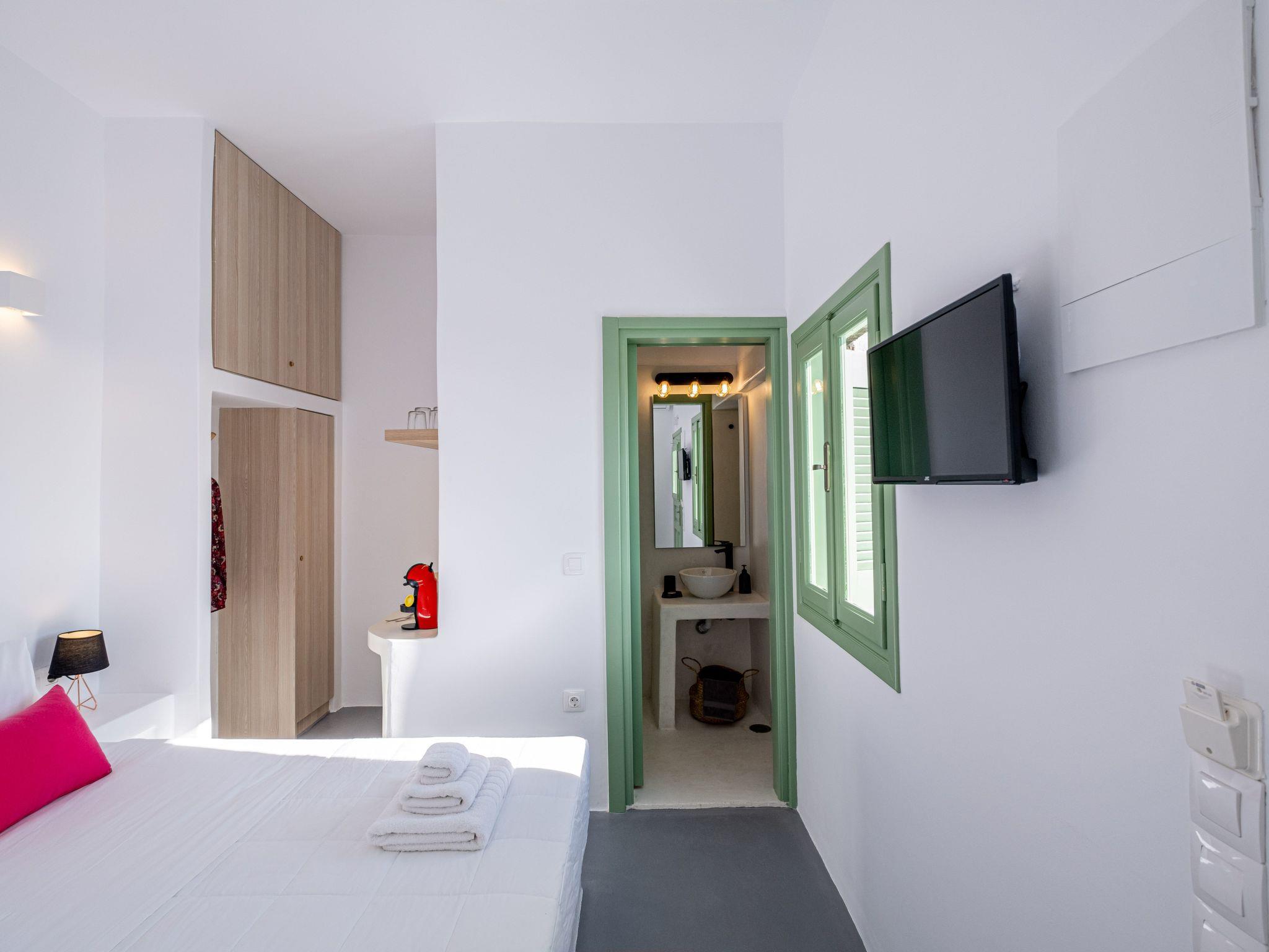 The 16m² studio is located on the upper floor of a two-story semi-detached private property. It features a private entrance and a balcony with a coffee table and chairs. Inside, you'll find a king-sized bed with reading lights, air conditioning, a flat-screen TV with satellite channels, WiFi access, a kitchenette, and an en-suite bathroom with a shower. The studio offers stunning views of Medieval Pyrgos Village, Akrotiri, the Aegean Sea, and spectacular sunsets.