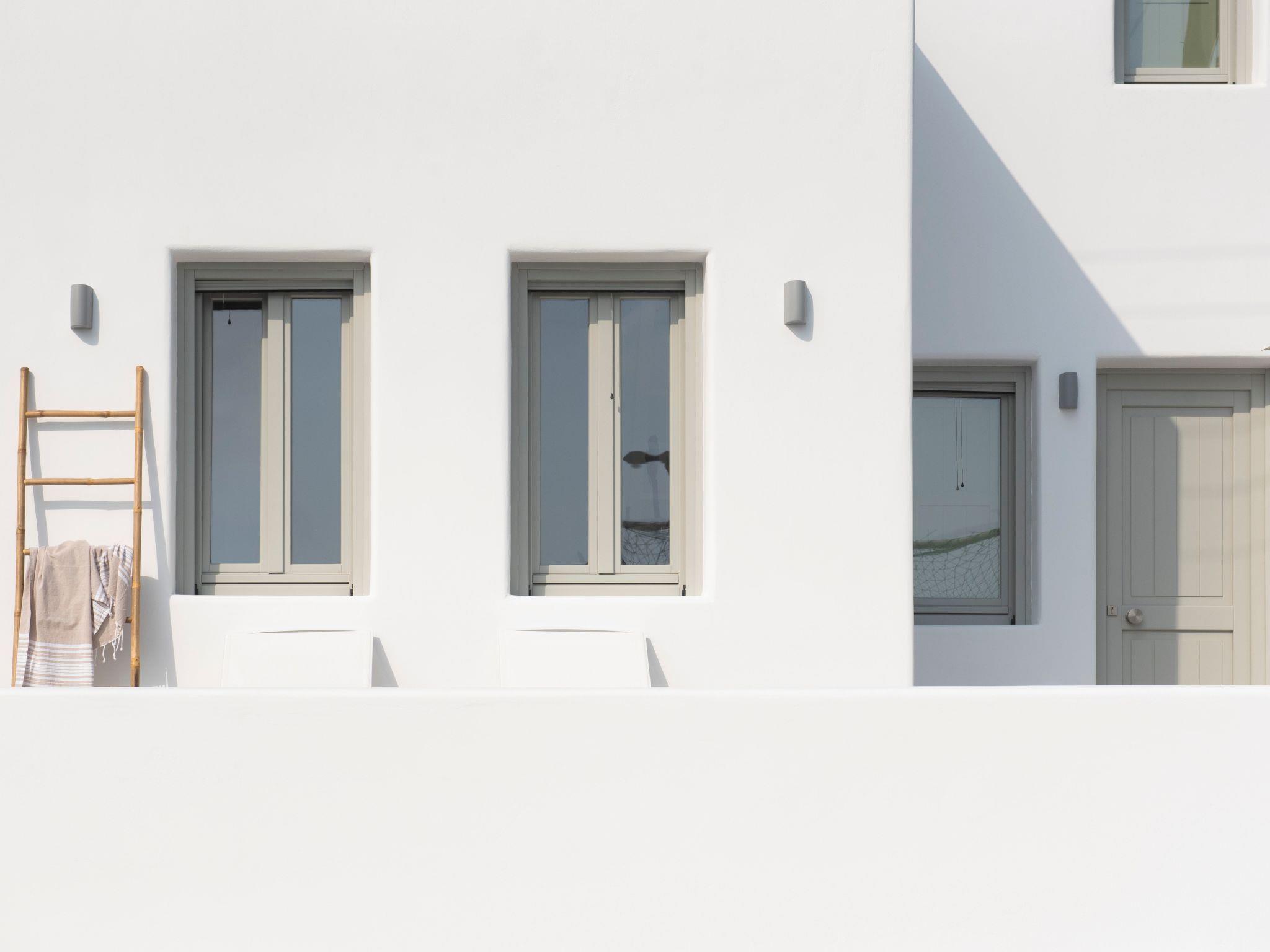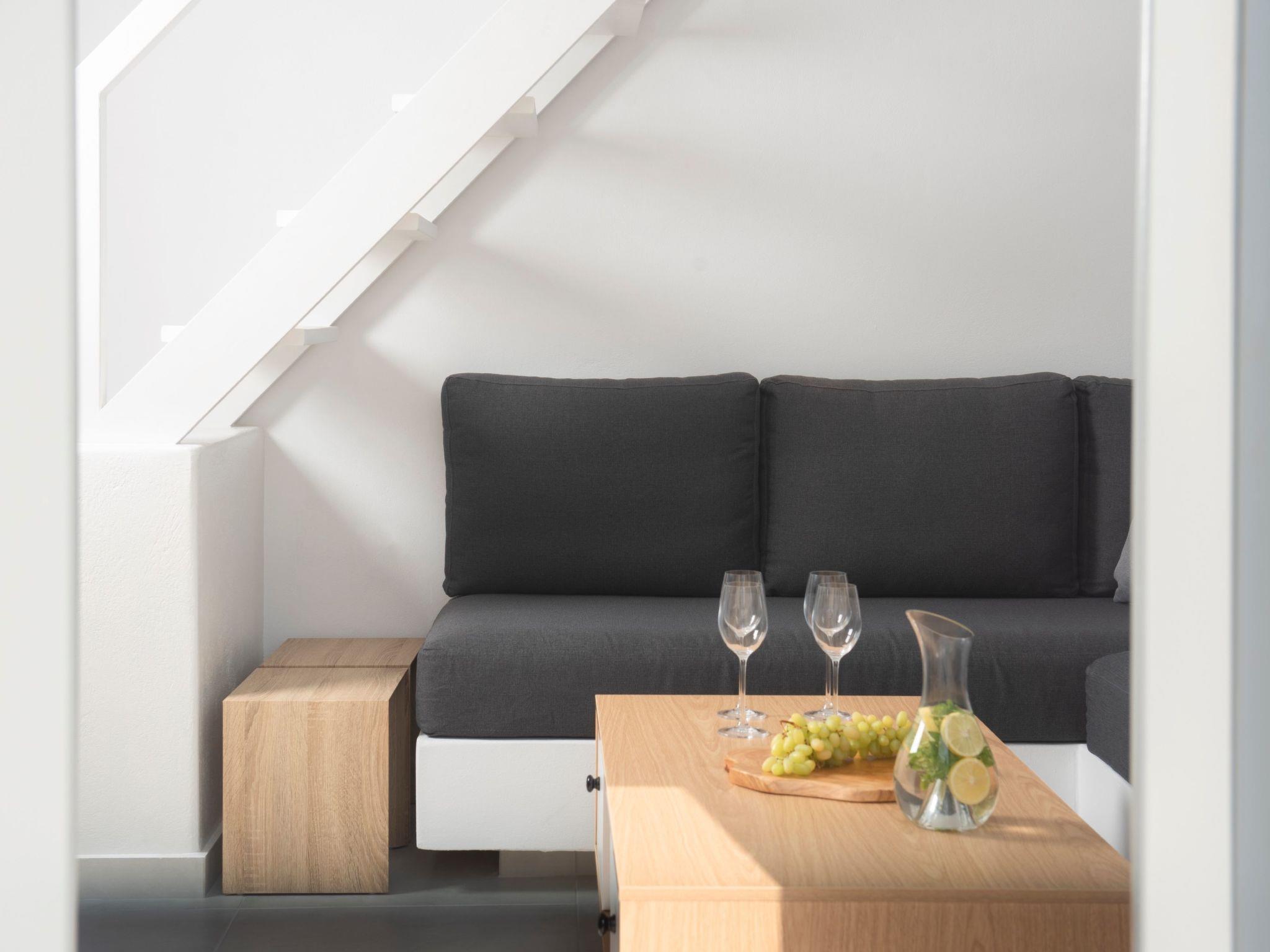 Our beautifully appointed suite features a spacious bedroom, a stylish bathroom, a fully equipped kitchen perfect for preparing light meals, and a comfortable living area with two built-in sofa-single beds. Relax and unwind in your private outdoor space, complete with comfortable furniture, sunbeds for soaking up the Aegean sun, a cozy sofa with a coffee table, and your own private hot tub – the perfect spot to unwind after a day of exploring.