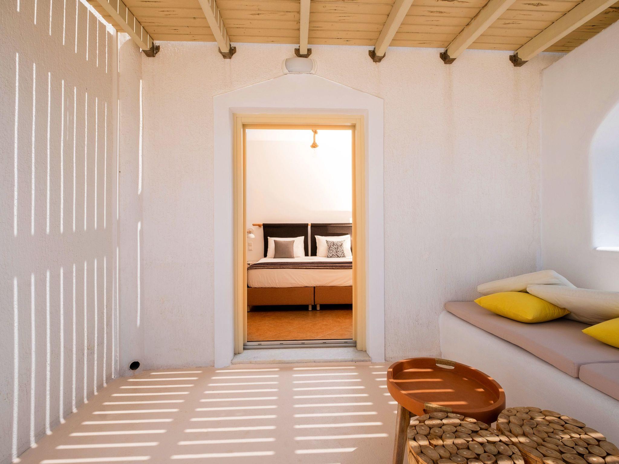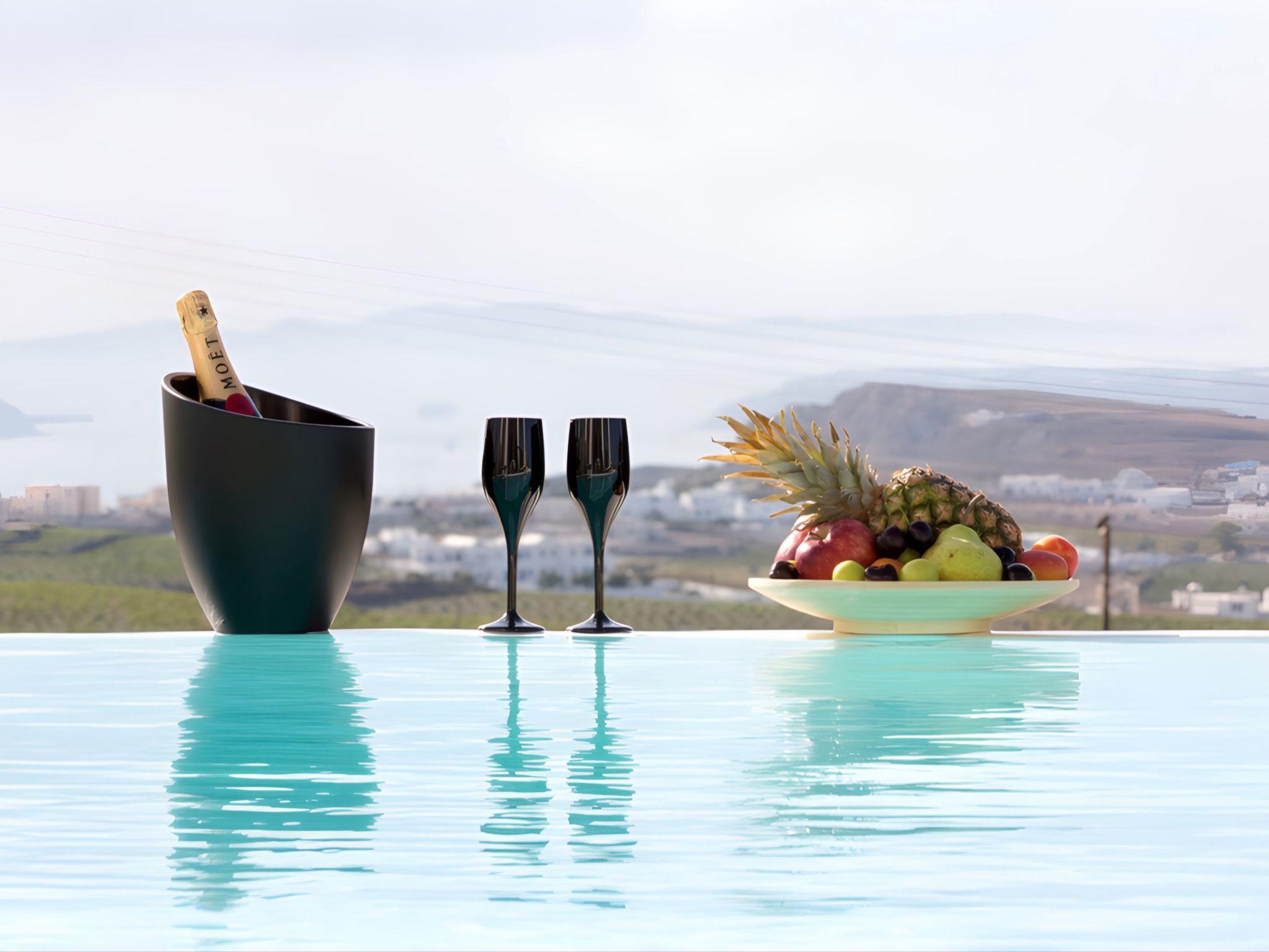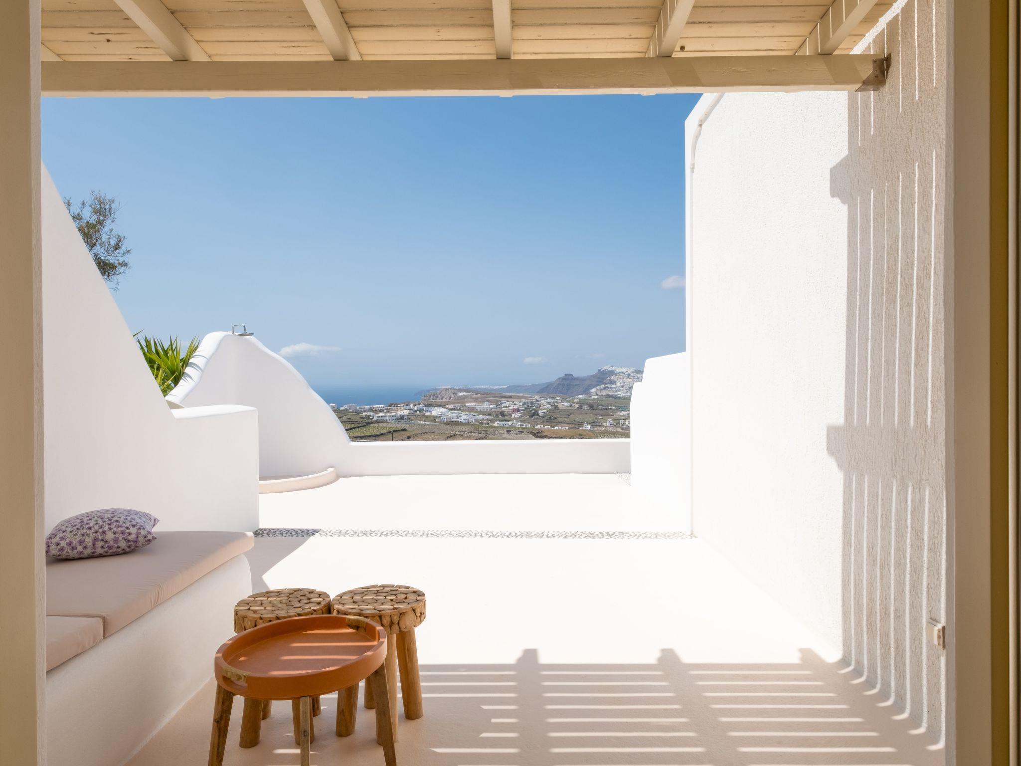 The Third Bedroom also has an en-suite bathroom and comes with two single beds (which can be joined to form a king-sized bed). This room showcases elegant lightwood furniture, has direct access to the pool, and offers its own private veranda with outdoor seating, boasting spectacular views of the Caldera and the Aegean Sea.