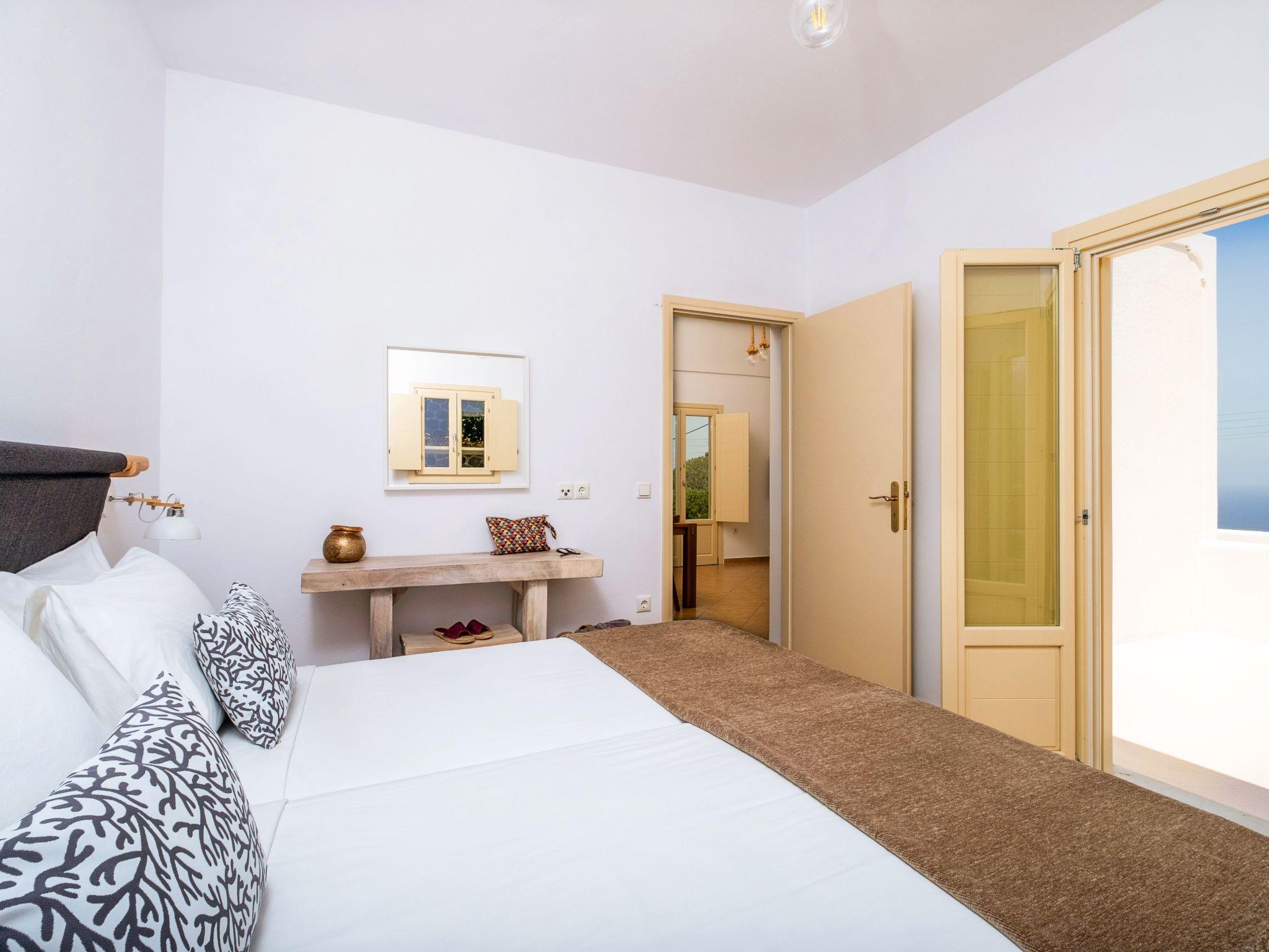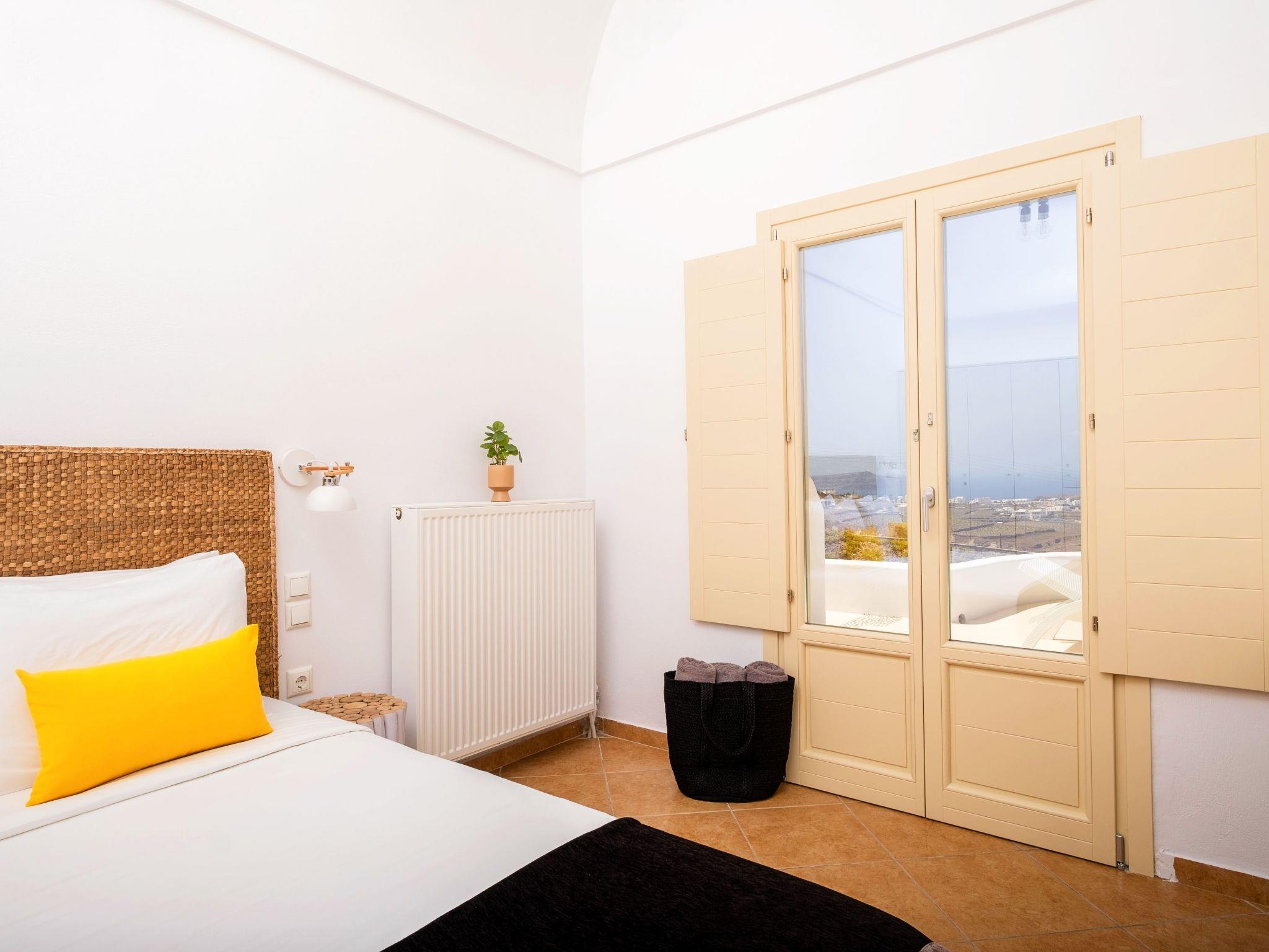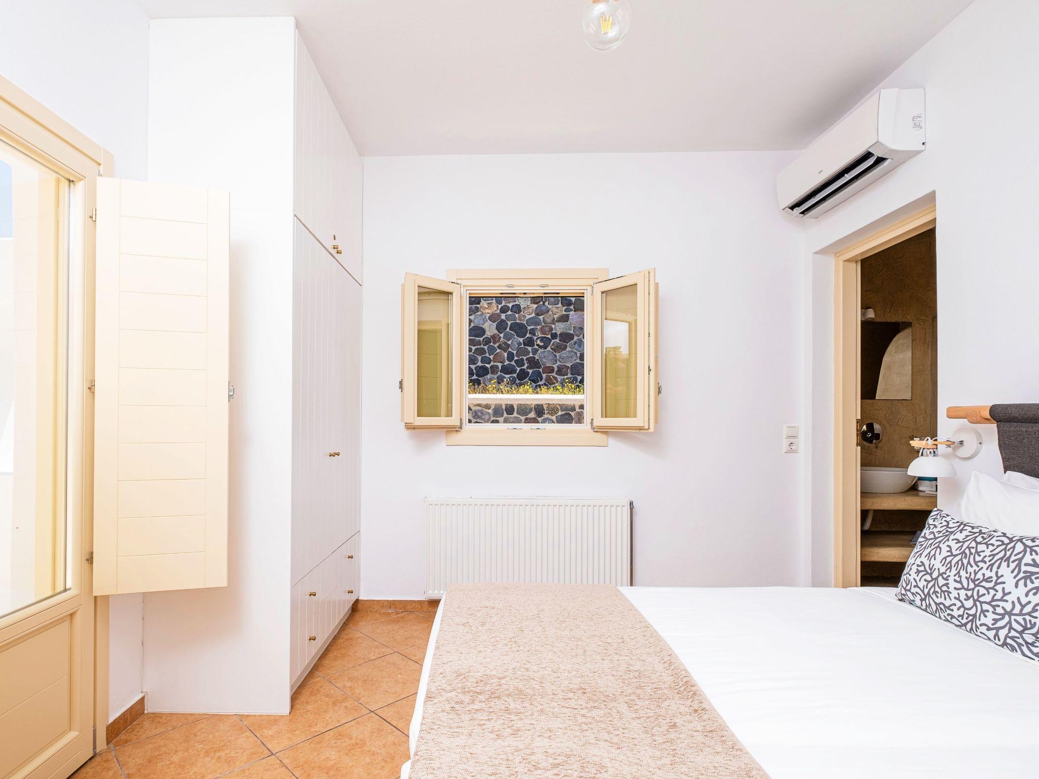 The Master Bedroom boasts a king-sized bed, elegantly crafted furniture, a dresser with a matching mirror, air conditioning, a spacious closet, and direct access to the pool. You'll also enjoy stunning views of both the Caldera and the Aegean Sea from this room.