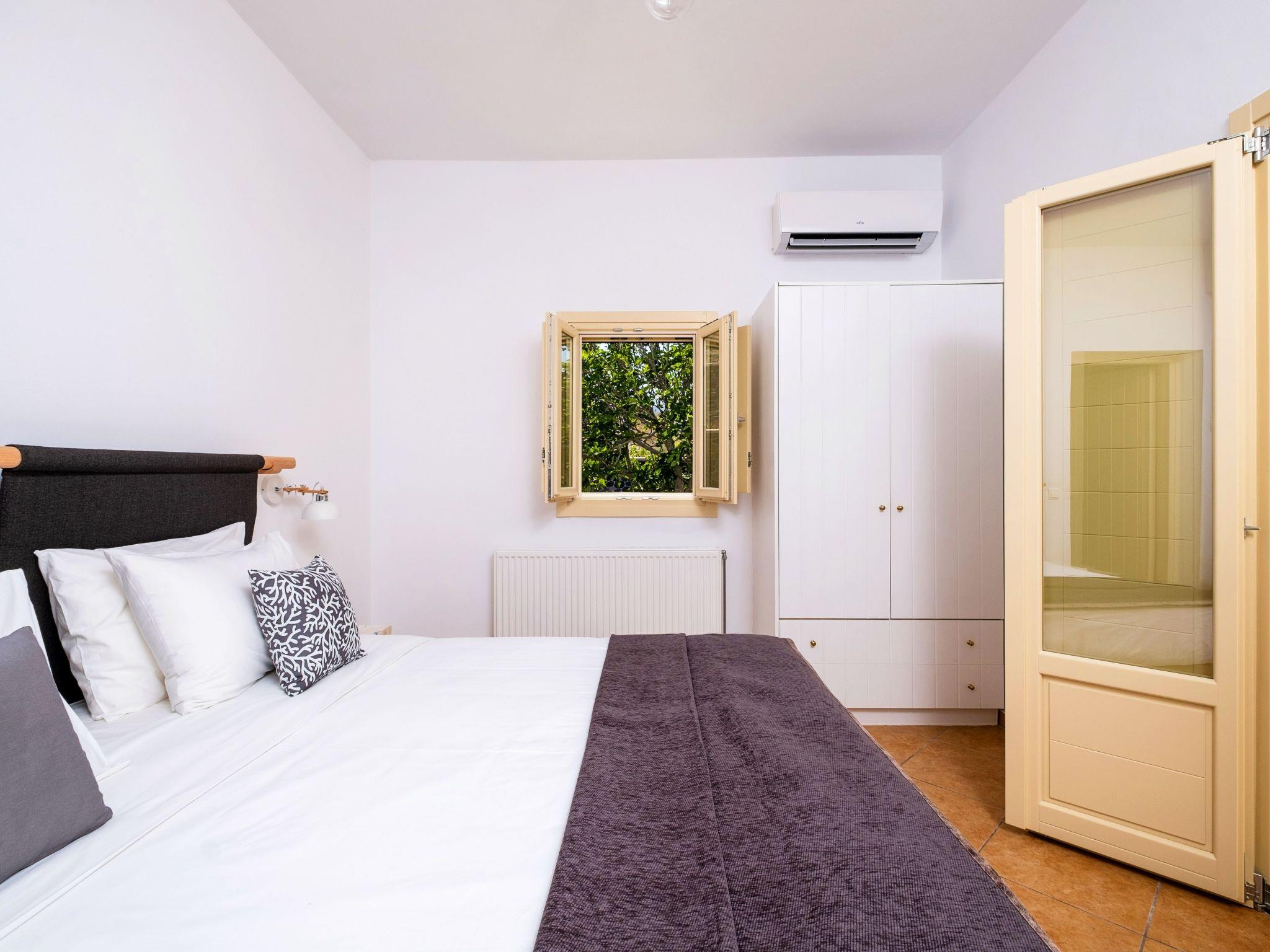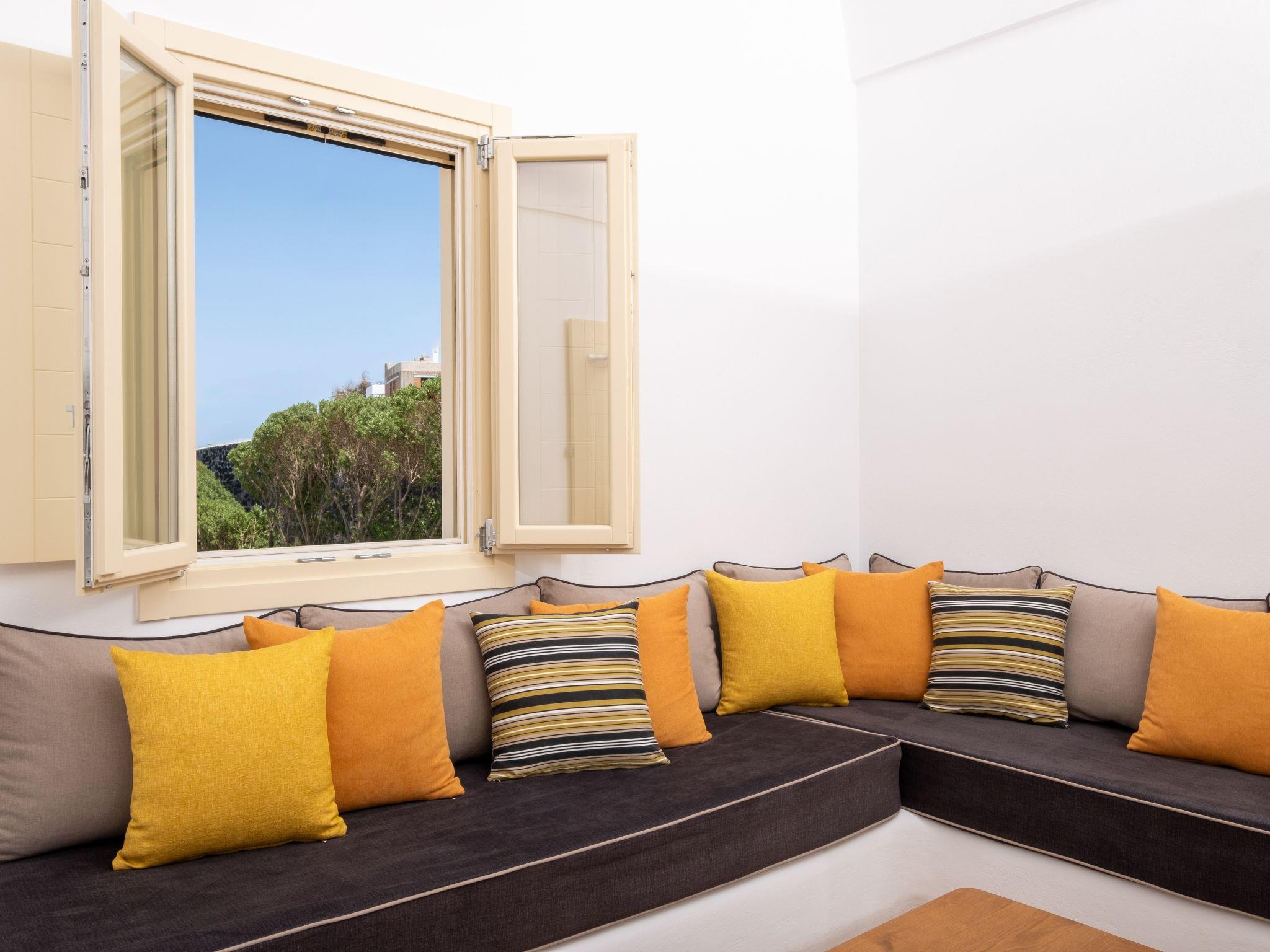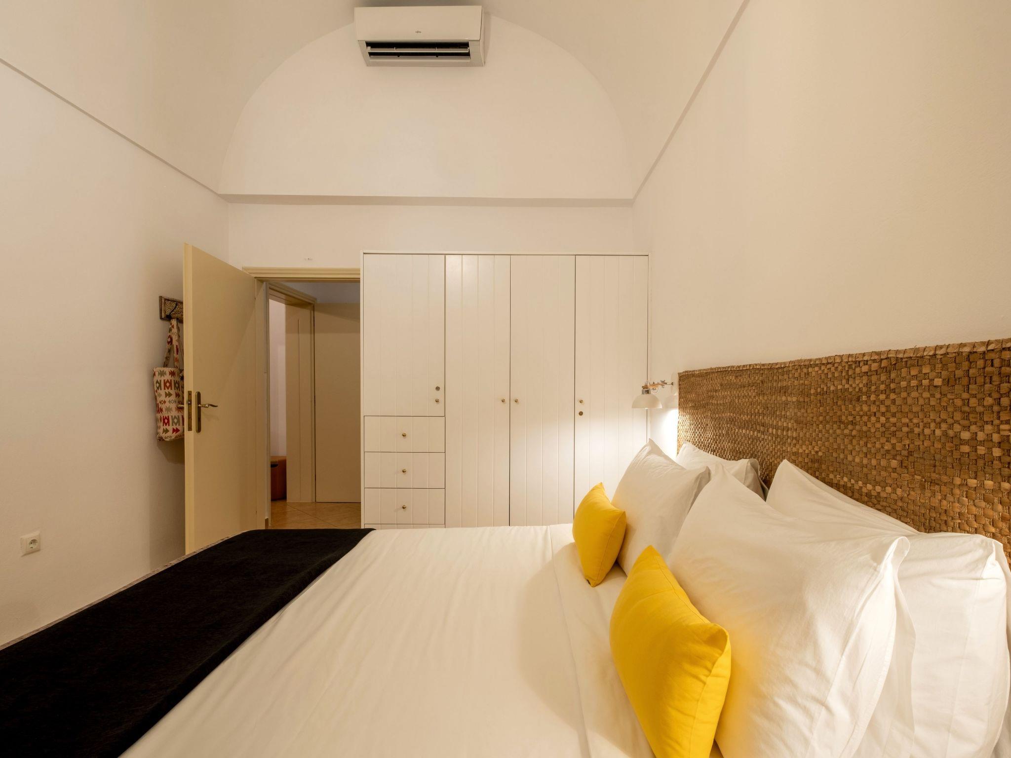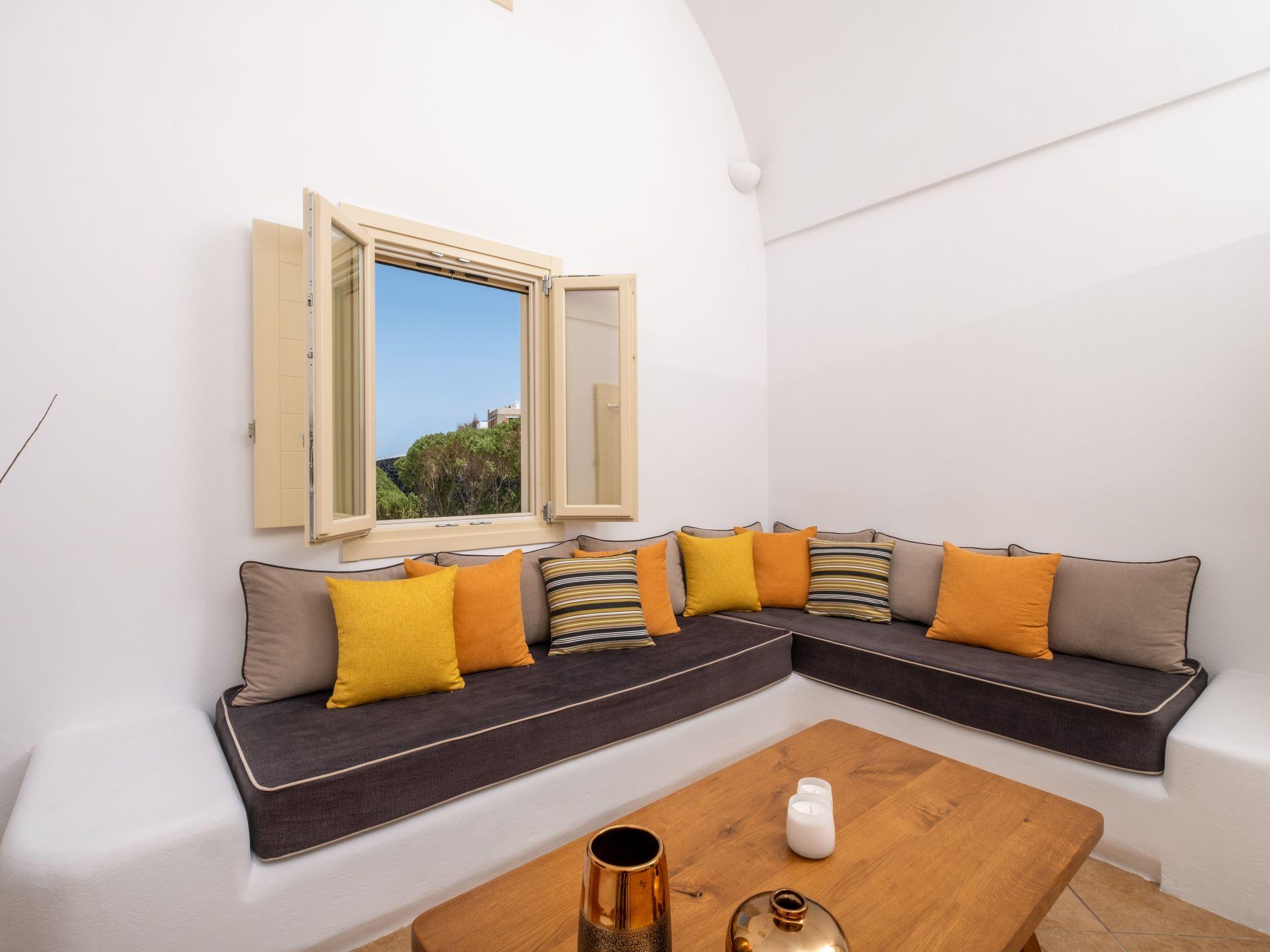 The Master Bedroom boasts a king-sized bed, elegantly crafted furniture, a dresser with a matching mirror, air conditioning, a spacious closet, and direct access to the pool. You'll also enjoy stunning views of both the Caldera and the Aegean Sea from this room.