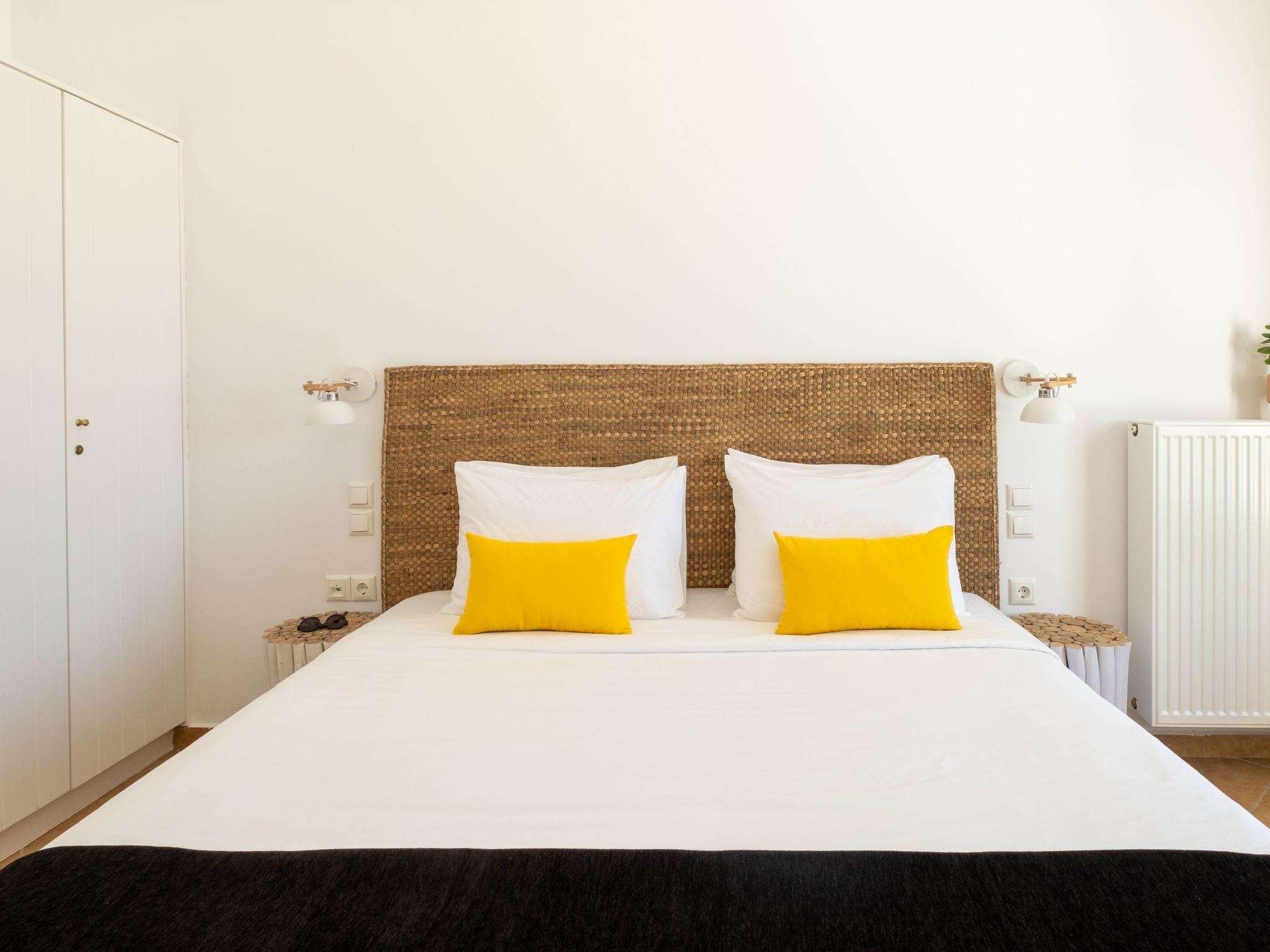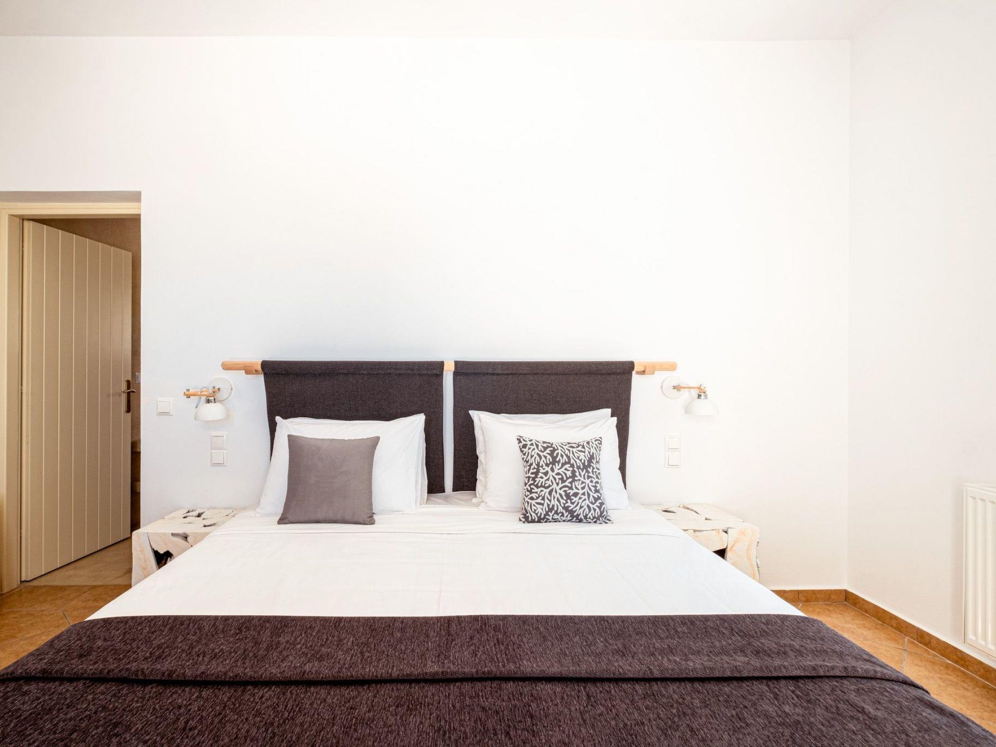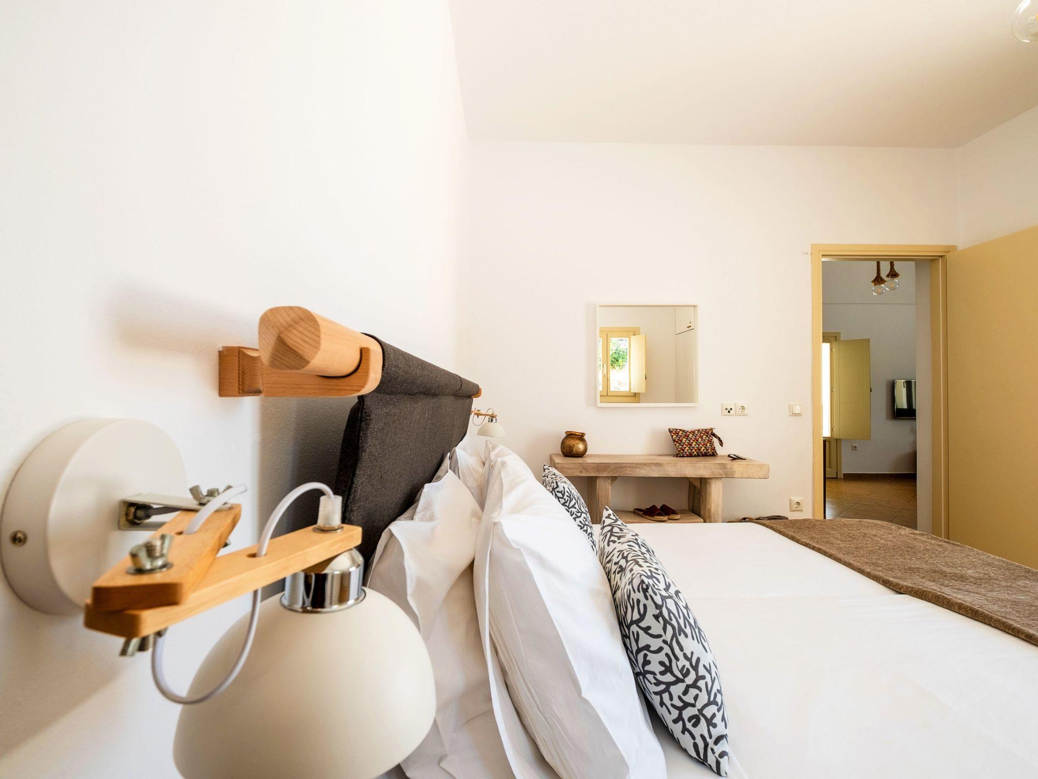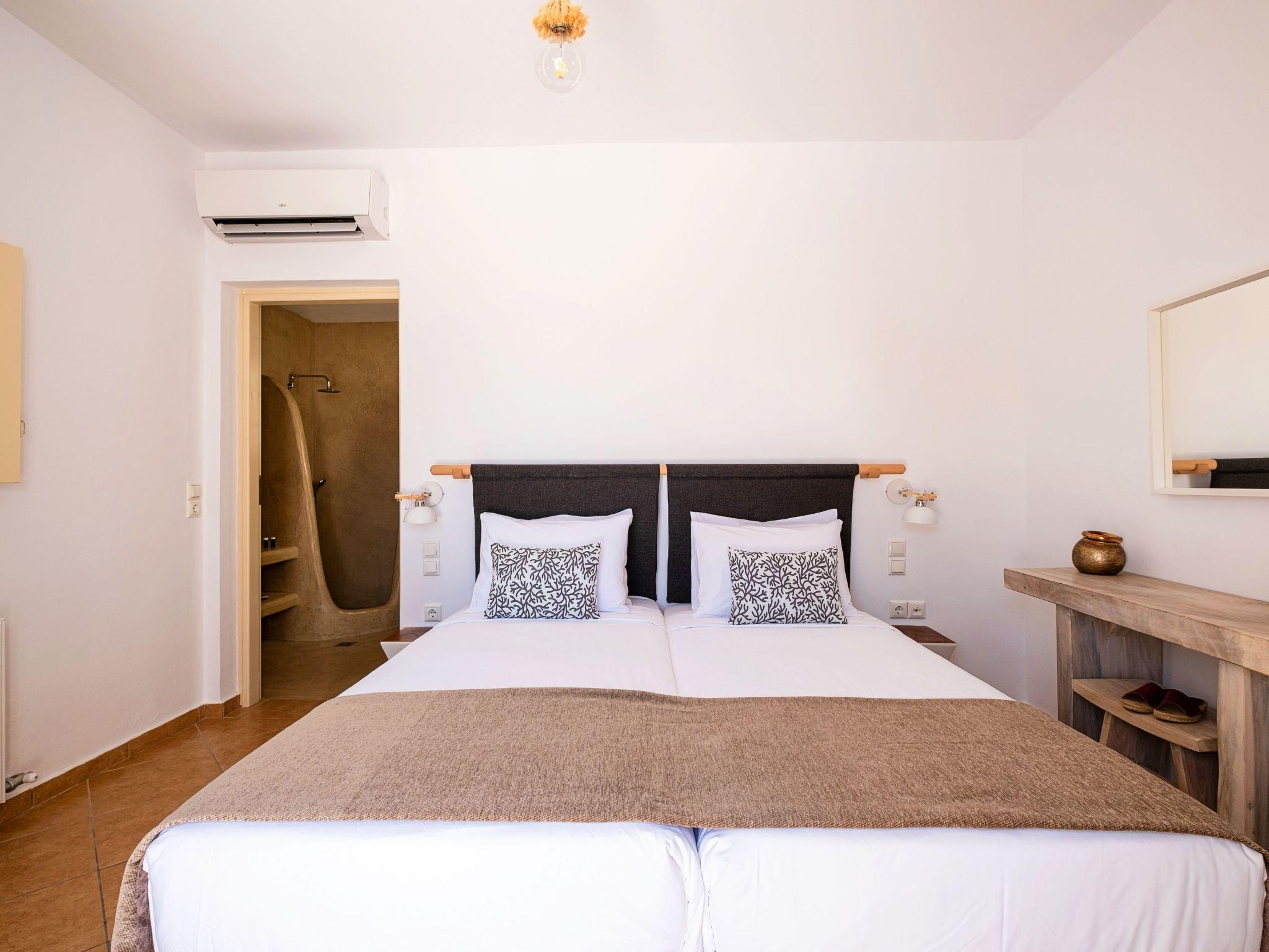 The Second Bedroom, complete with an en-suite bathroom and shower, offers two single beds that can be joined to create a king-sized bed. It features modern lightwood furniture and shares similar amenities as the Master Bedroom, along with lovely views of the Aegean Sea and the historic Medieval Pyrgos Village.