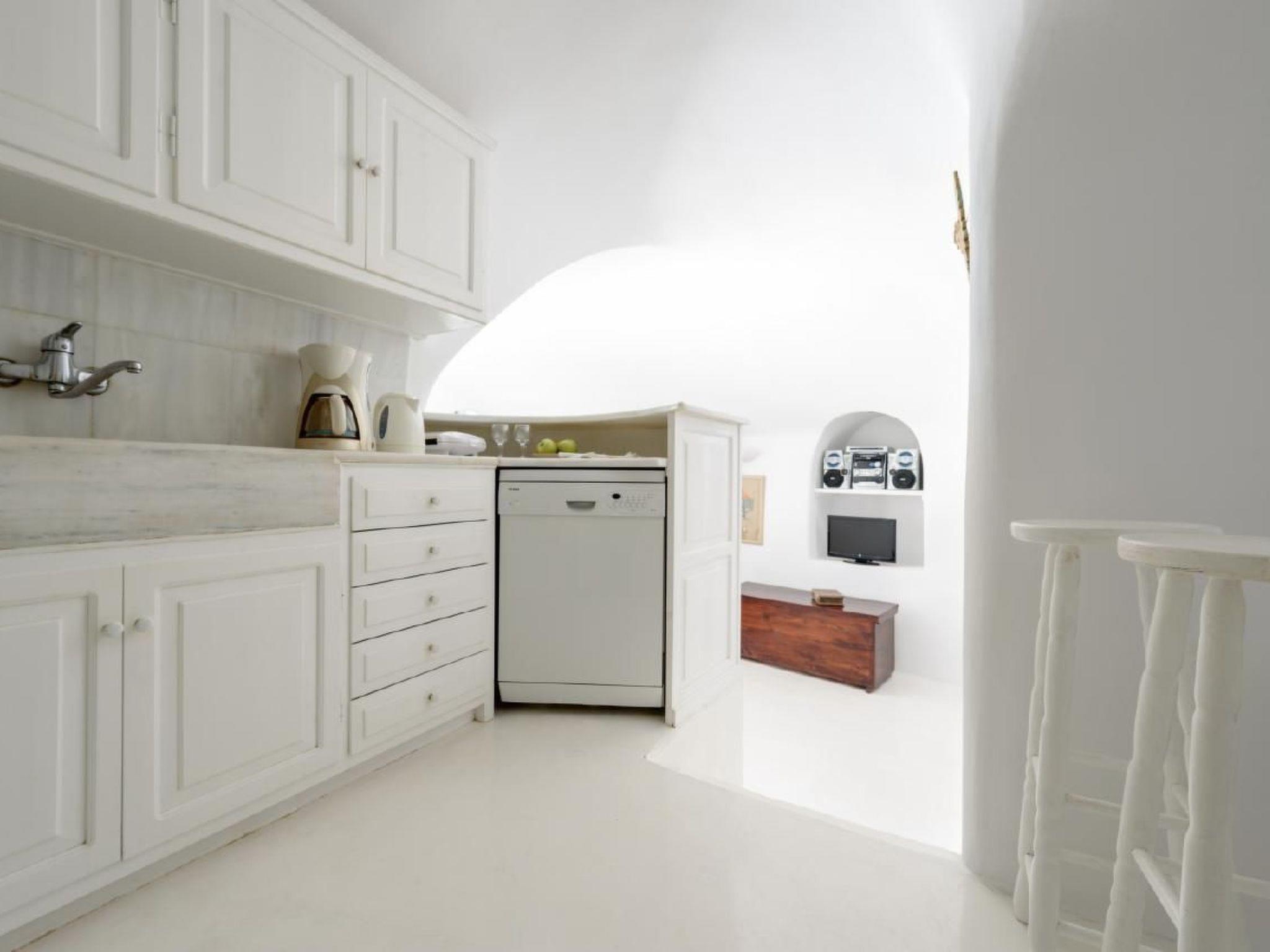 On the upper level there is a large traditional cave house furnished with antiques. It consists of a luxury master bedroom with double bed , en suite vanity marble bathroom curved into the rock with Jacuzzi bathtub , a living room with built sofas and an antique wooden table, a separate dining area with an antique massive wooden table and sitting corner and a fully equipped kitchen with all modern appliances. From the living area a few stairs take you up to an attic room with double sofa bed and window with fantastic sea views.