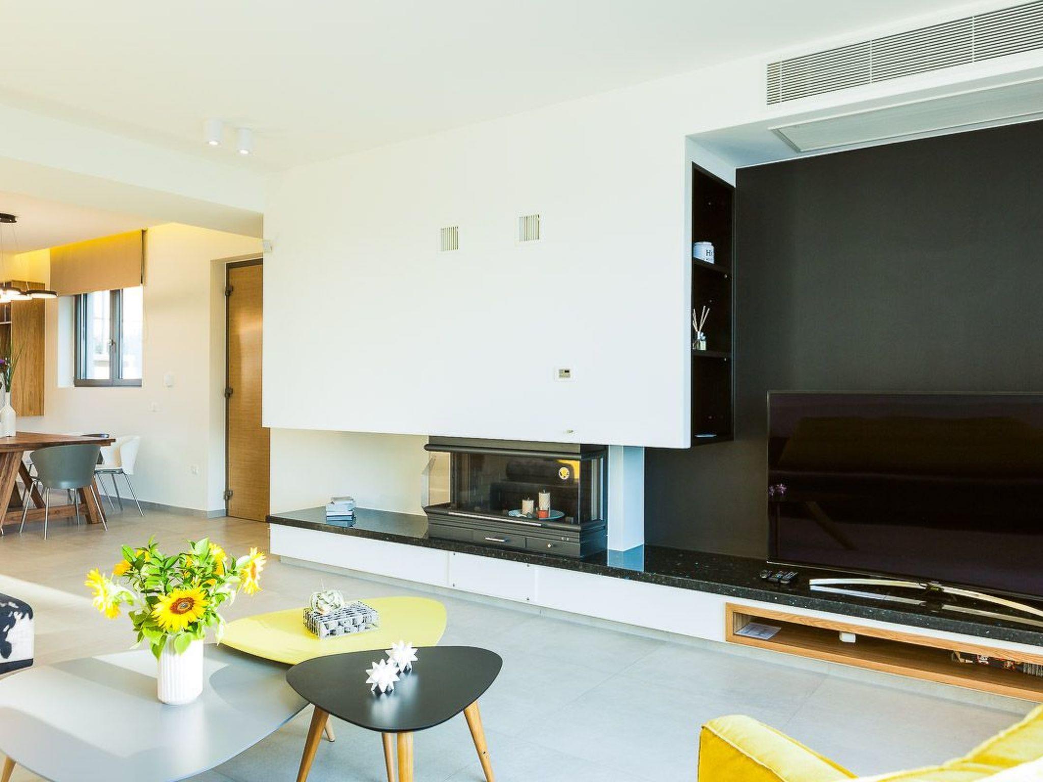 Living area with sofa, 60’’ satellite Smart TV, energy fireplace, access to the pool terrace