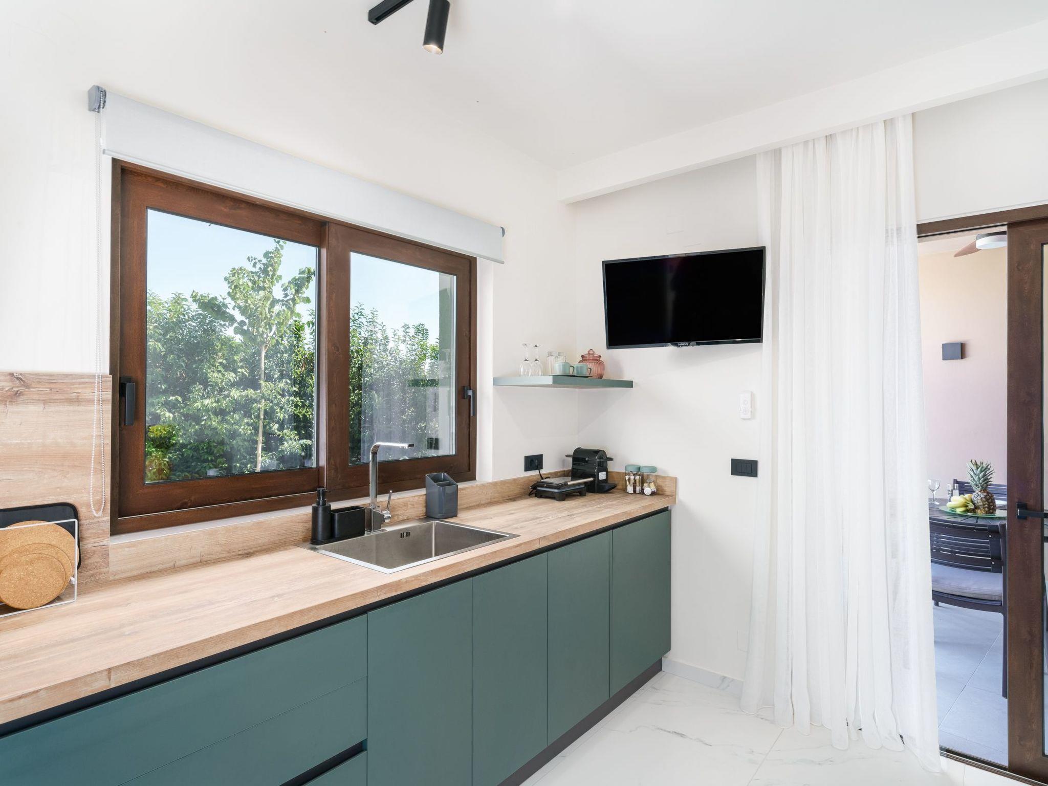 The villa’s open-plan living area is designed for relaxation and comfort. The space is furnished with a plush sofa and a 32’’ Smart TV, offering satellite channels for your entertainment. From here, guests can step outside directly to the pool terrace, which offers a seamless transition between indoor and outdoor living.