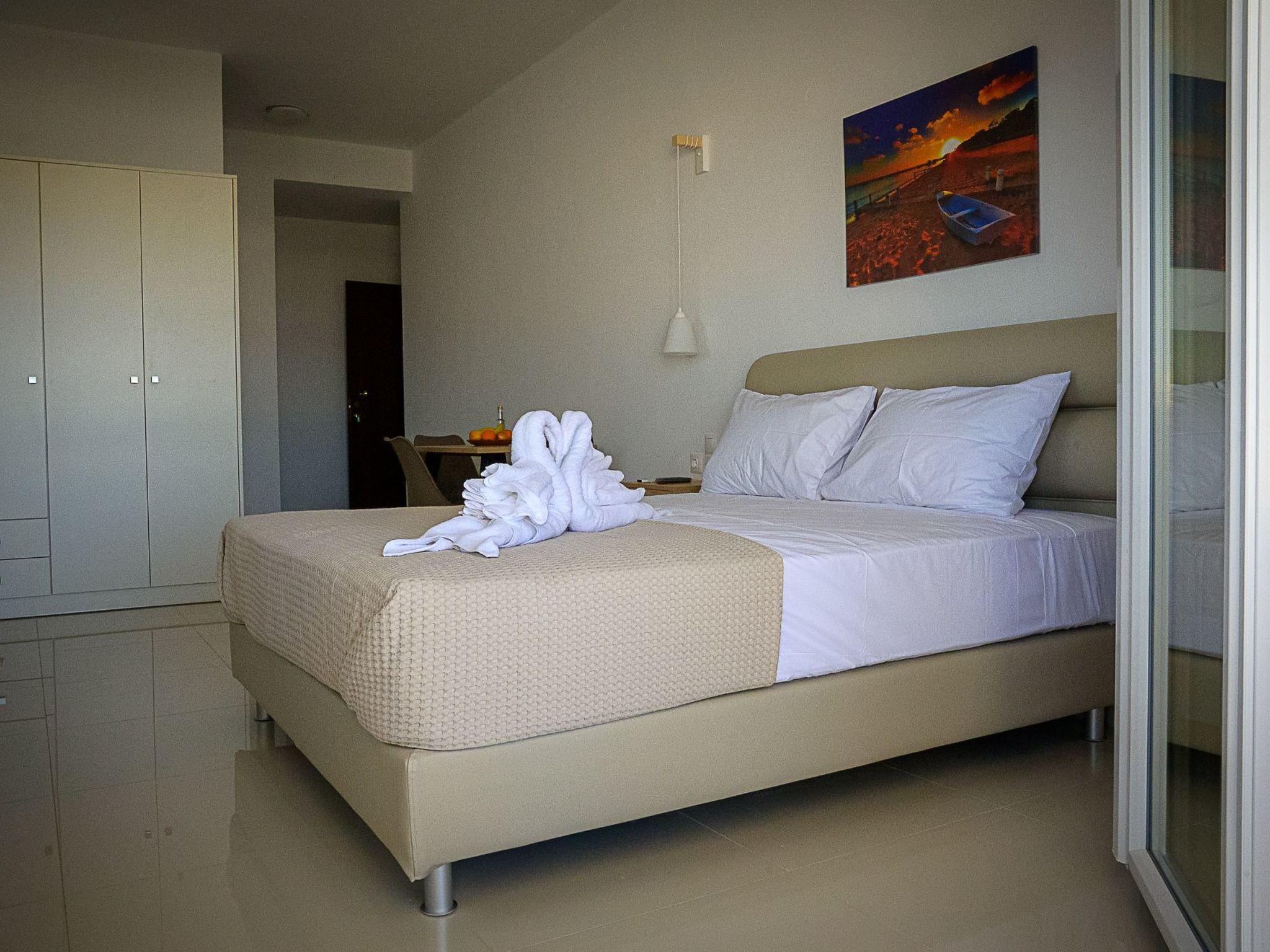Stepping outside, guests are greeted with a private balcony or terrace, creating the perfect spot to relax and admire the stunning sea views or enjoy a quiet moment in the fresh air. Despite the focus on tranquility and privacy, guests are never too far from a refreshing swim, as they have access to the pool at the Blue Sky hotel, located approximately 700 meters away, available from the 1st of May.