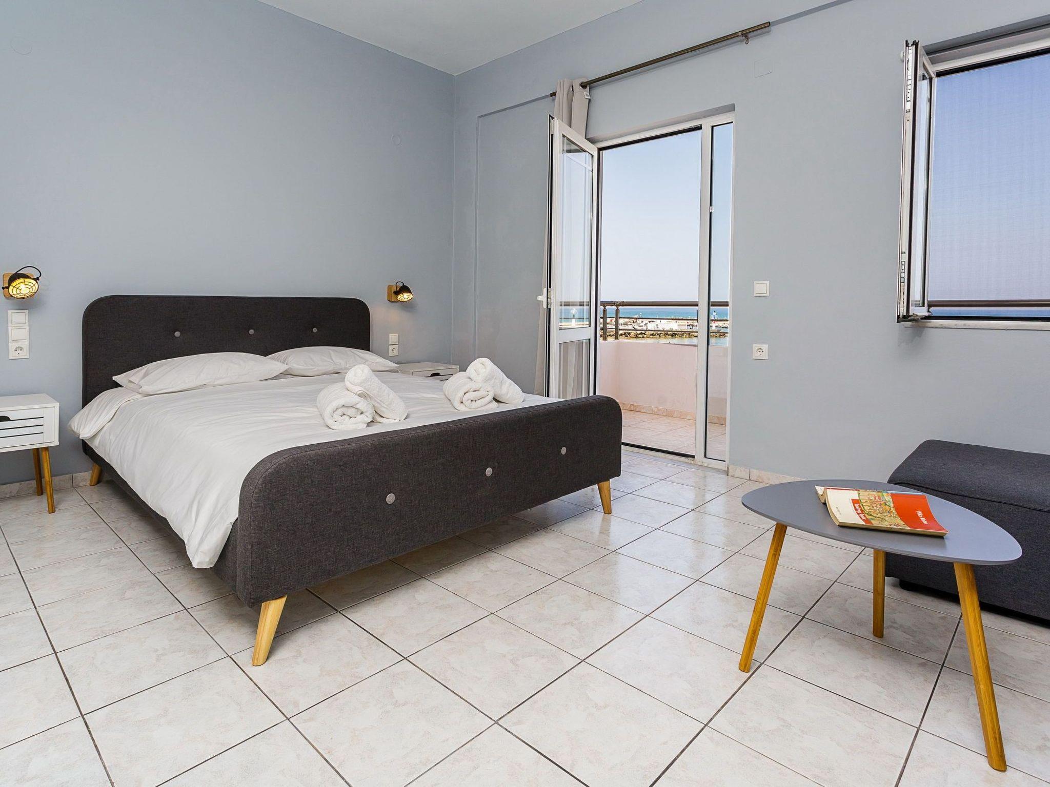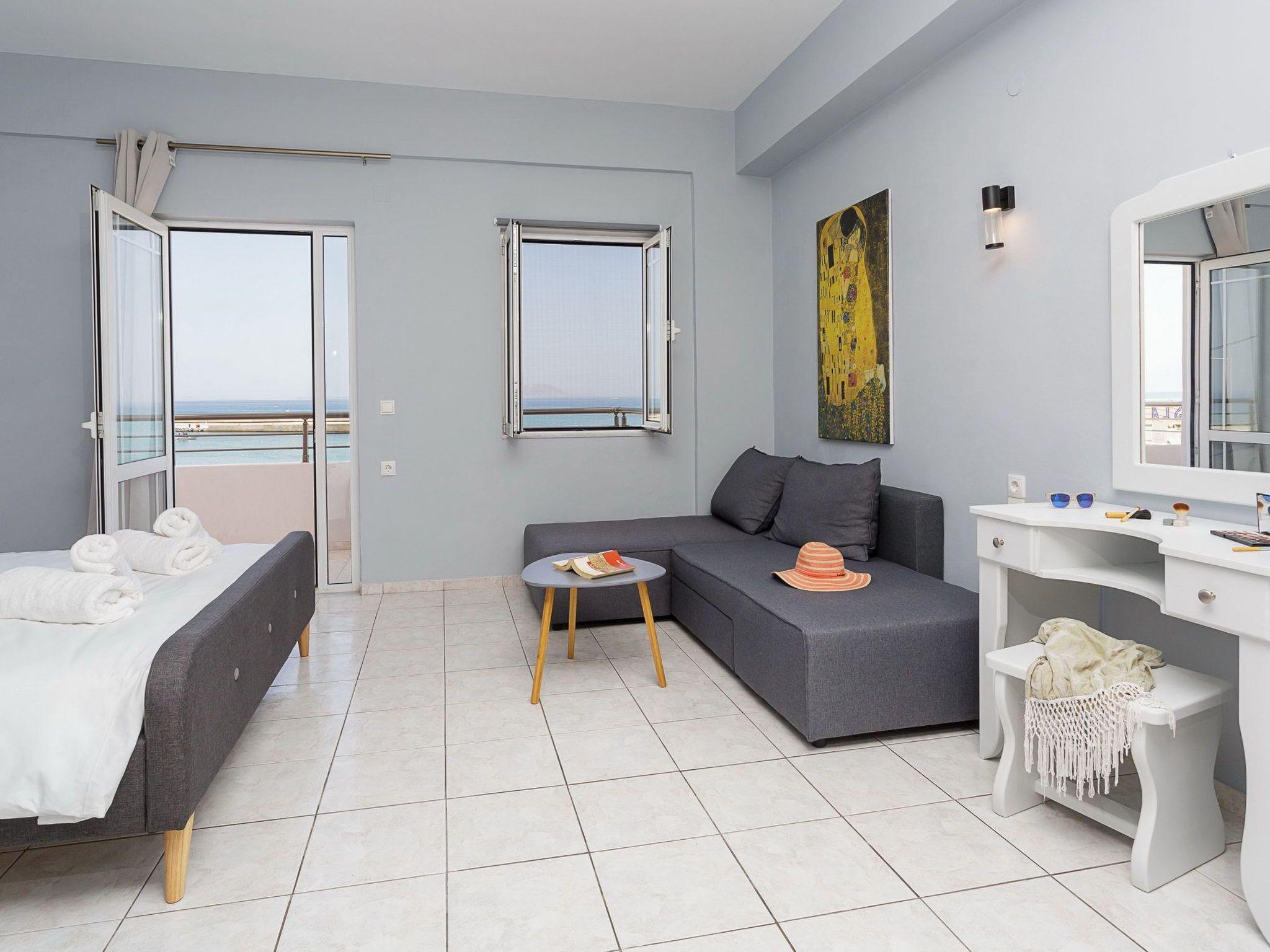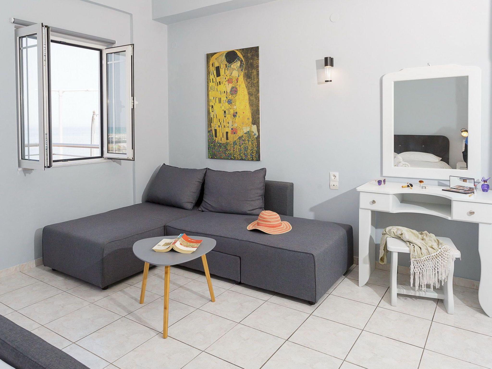 Sunset & sea view studio-2 was renovated on 2021 and consists of an open plan bedroom with kitchenette and a bathroom with shower. The studio offers its own balcony with marvelous views of the sea and the sunset. The studio offers a double bed (160*200) and a couch which can be converted to a double bed. The kitchenette is equipped with pots, pans, plates etc. There are also a mini fridge and a stove.
