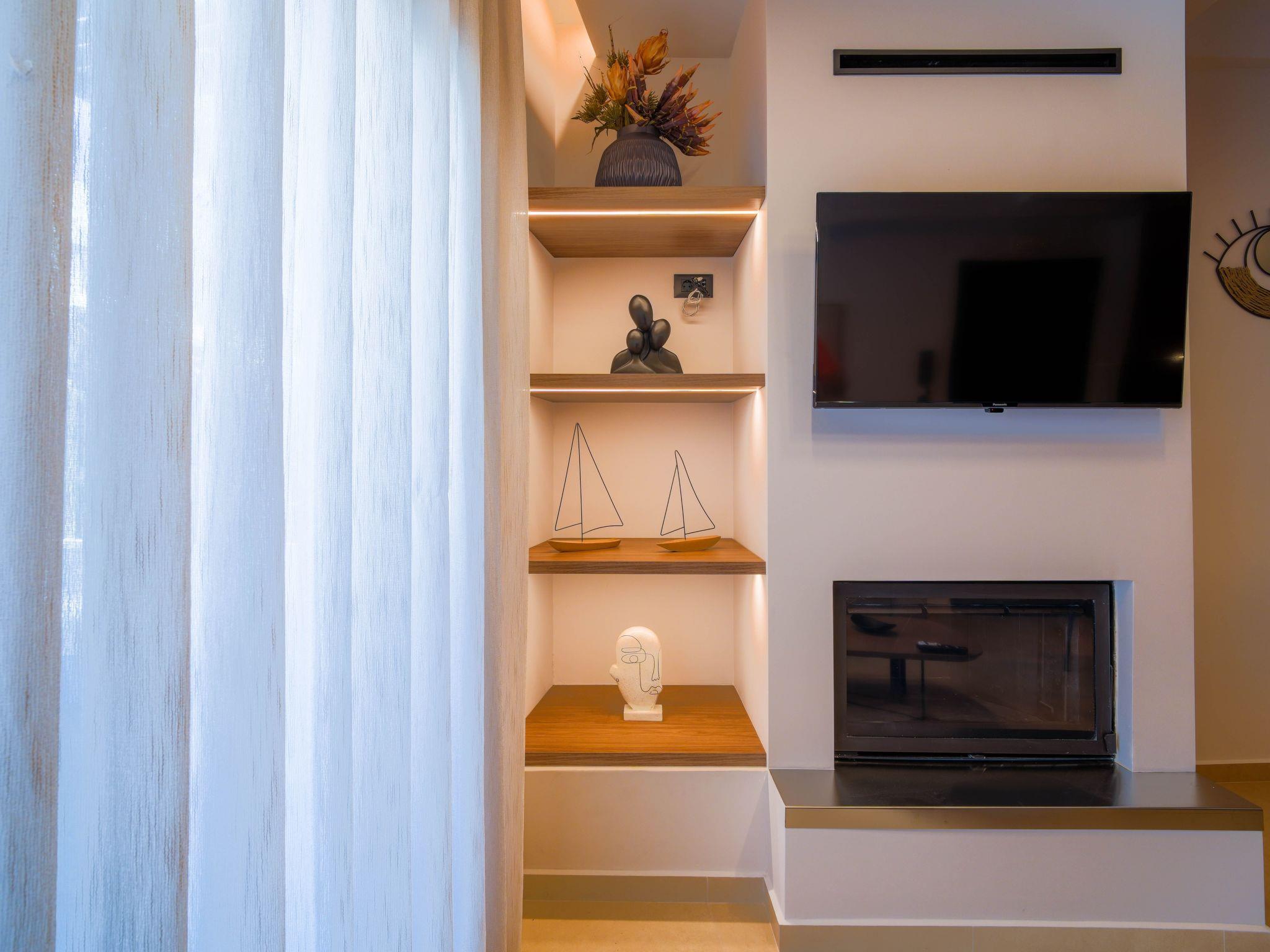 The interior of this holiday haven is designed for relaxation and convenience. It features two well-appointed bedrooms, each equipped with a king-size bed (the beds in one room can be split into two singles upon request), wardrobes stocked with extra pillows, air conditioning, and TVs for your entertainment. The living room boasts abundant natural light, a large sofa that doubles as a double bed, a cozy fireplace, and a modern dining table that seats 6. The fully-equipped kitchen satisfies any culinary need, with a fridge, oven, cooker, dishwasher, Nespresso machine, coffee filter machine, toaster, kettle, and more, ensuring a homely experience throughout your stay.