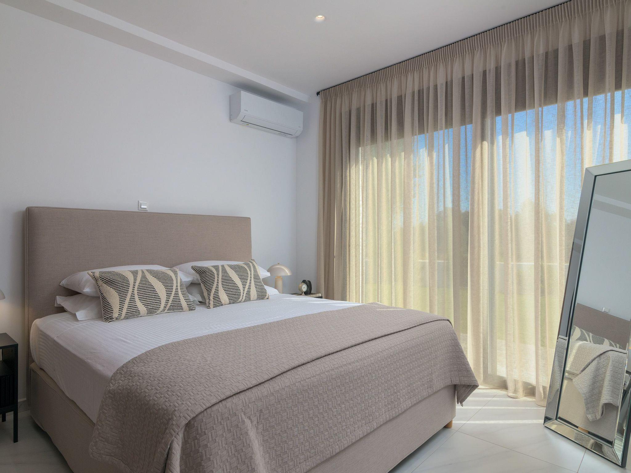 Villa Galini, a contemporary Greek Villa comprising 3 spacious bedrooms beautifully furnished with quality bed linen, plush mattresses, cosy pillows and fluffy towels. The main bedroom has its own ensuite bathroom and is furnished with a king size bed. The other 2 bedroom are also luxuriously appointed and contain queen size beds.