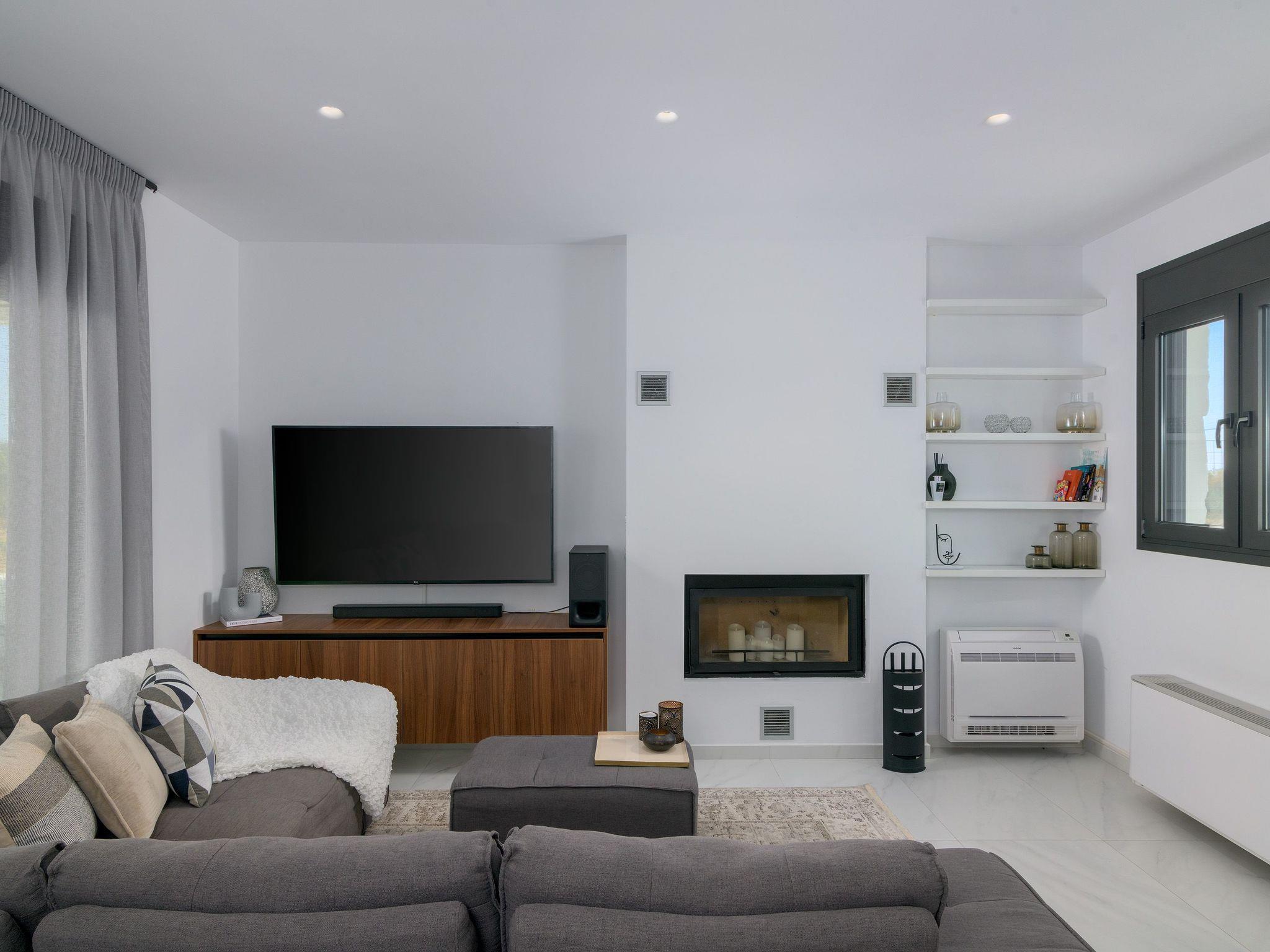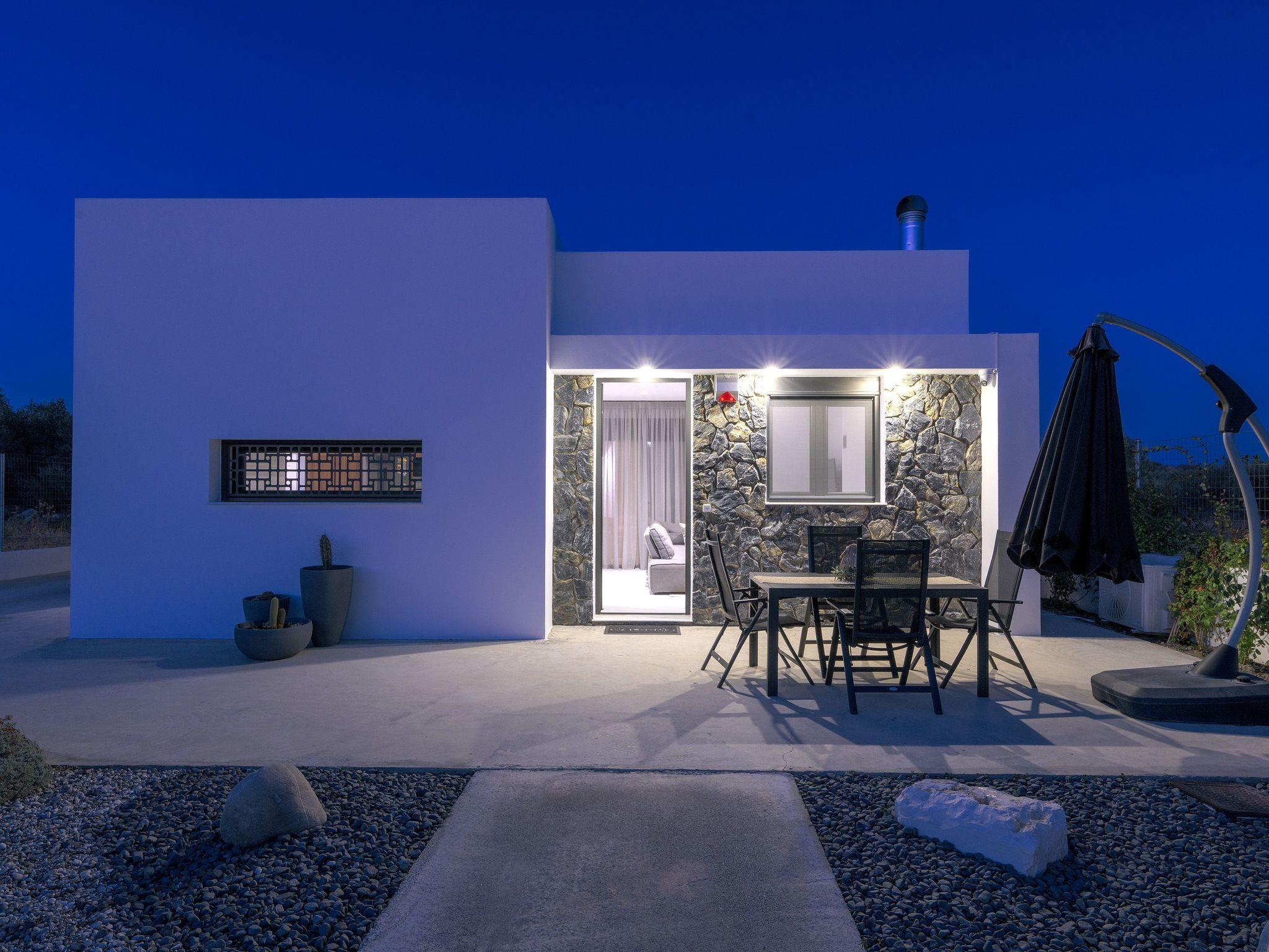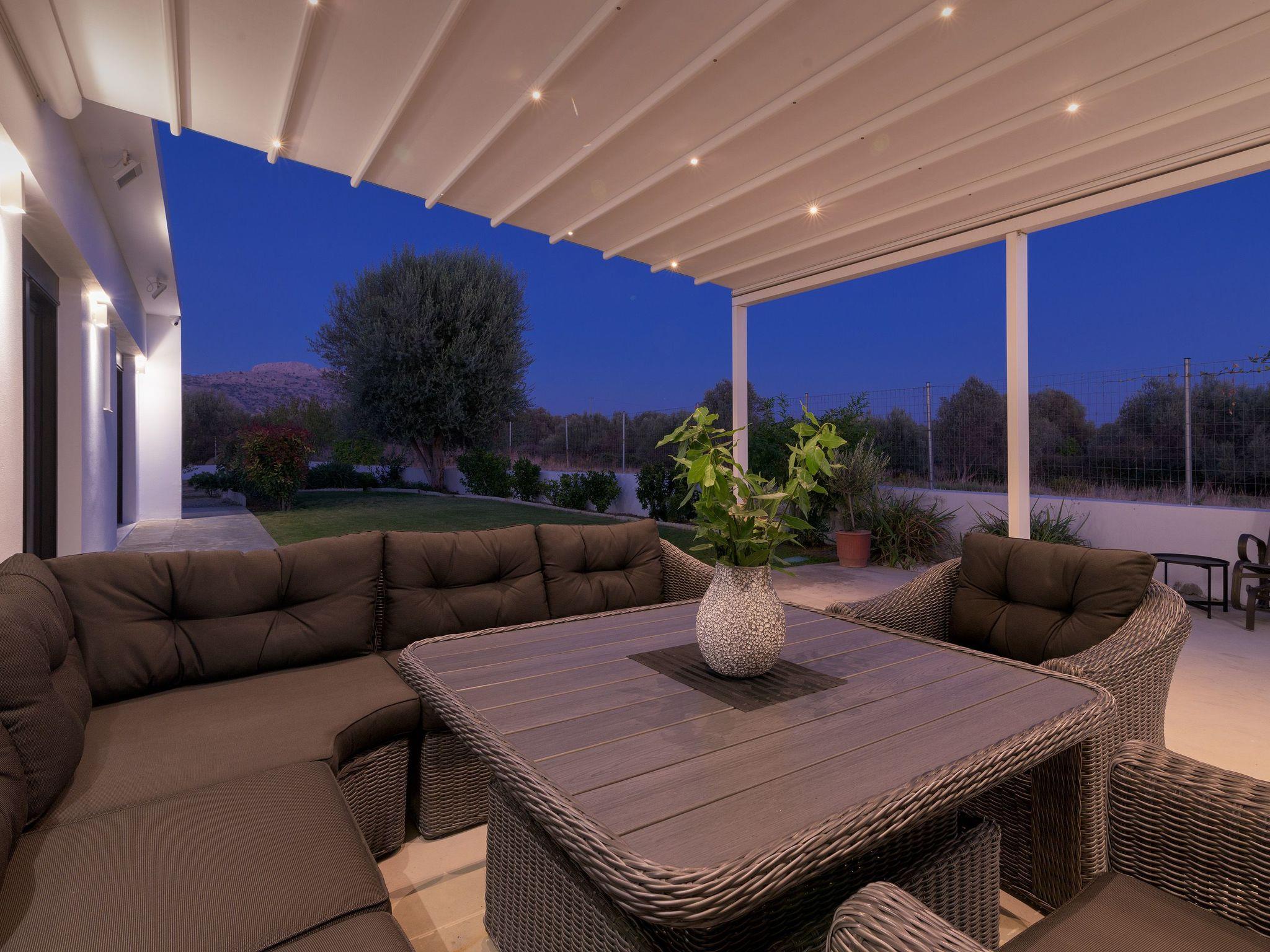 Our large modern kitchen/dining area is the perfect place to reflect on the day you have had over a cooked meal and a glass of wine, created in our fully equipped kitchen with all amenities, dish washer, nespresso coffee machine. Luxury and comfort abounds. The rear verandah is furnished with comfortable lounge chairs and table ideal for your outside dining and entertaining. The verandah is serene area as it adjoins the lawn and gardens with neighboring olive trees. In the evening enjoy the distant views of the stunningly lit Feraklos Castle in the distance.