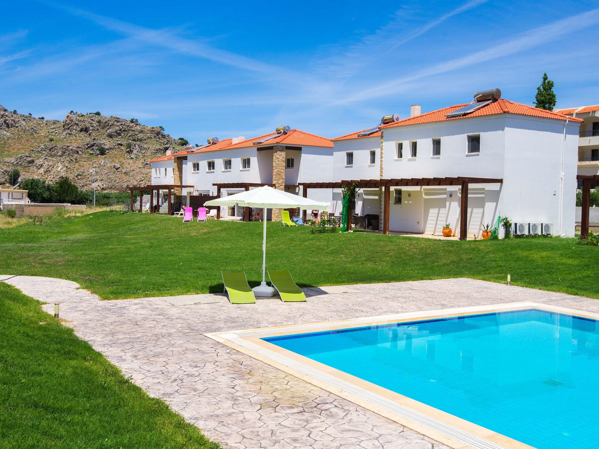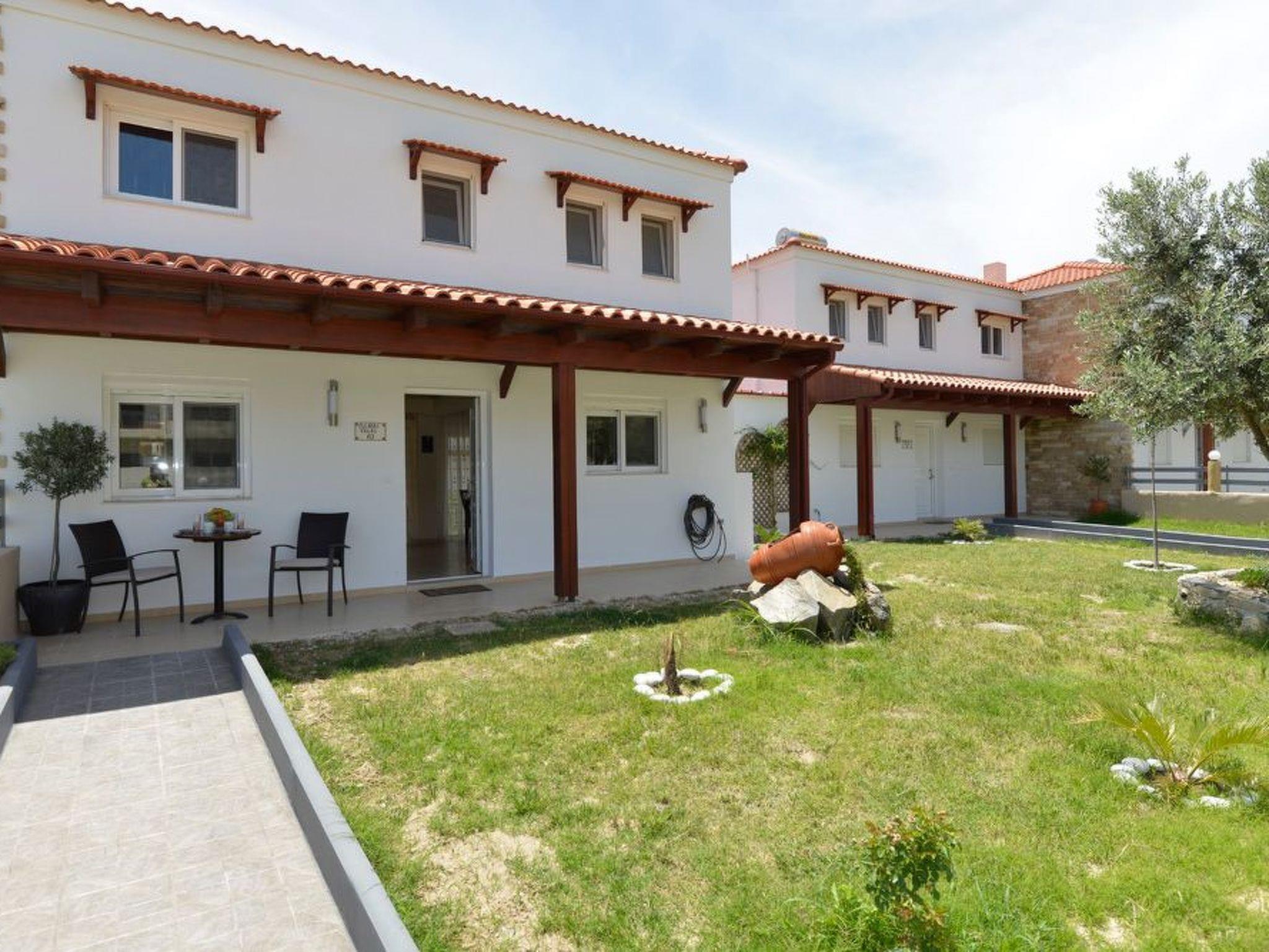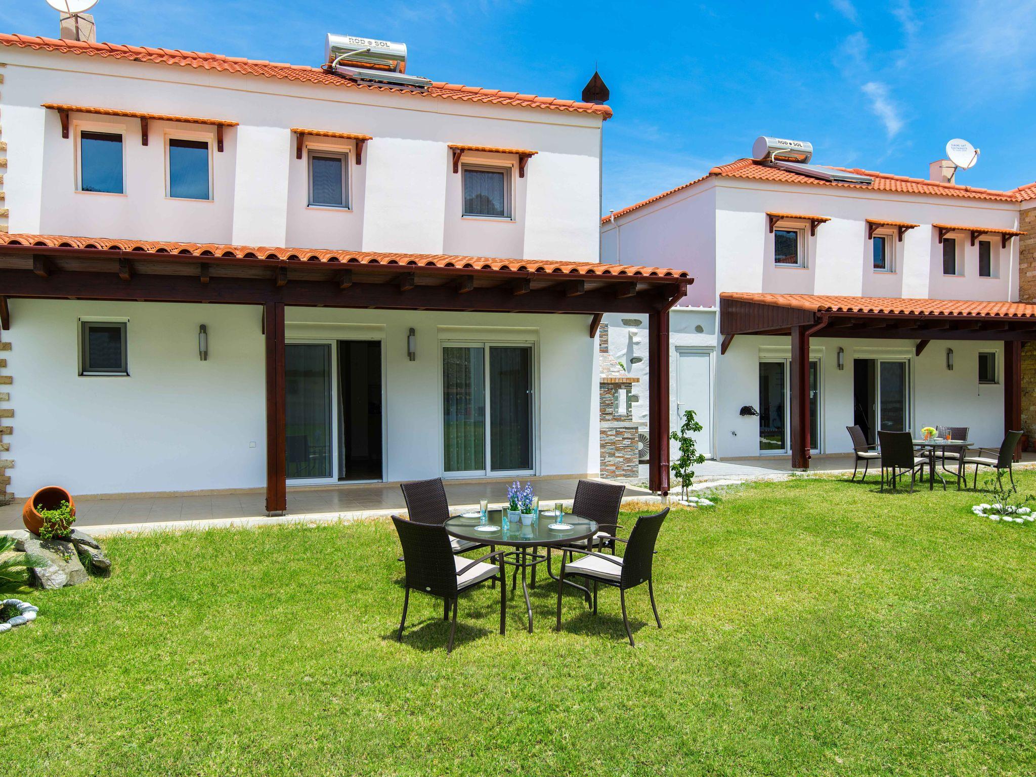 These modern Greek-style house is only 300m from the beach and with a beautiful view of the surrounding mountains. Cozy semi-detached house with modern comforts and a big common swimming pool. Everything you need is on a walking distance!