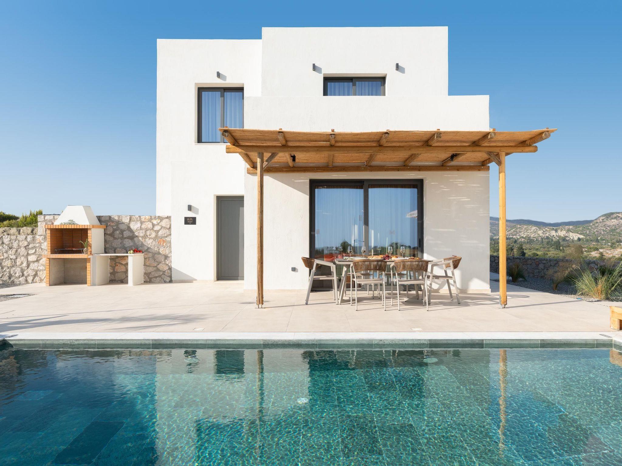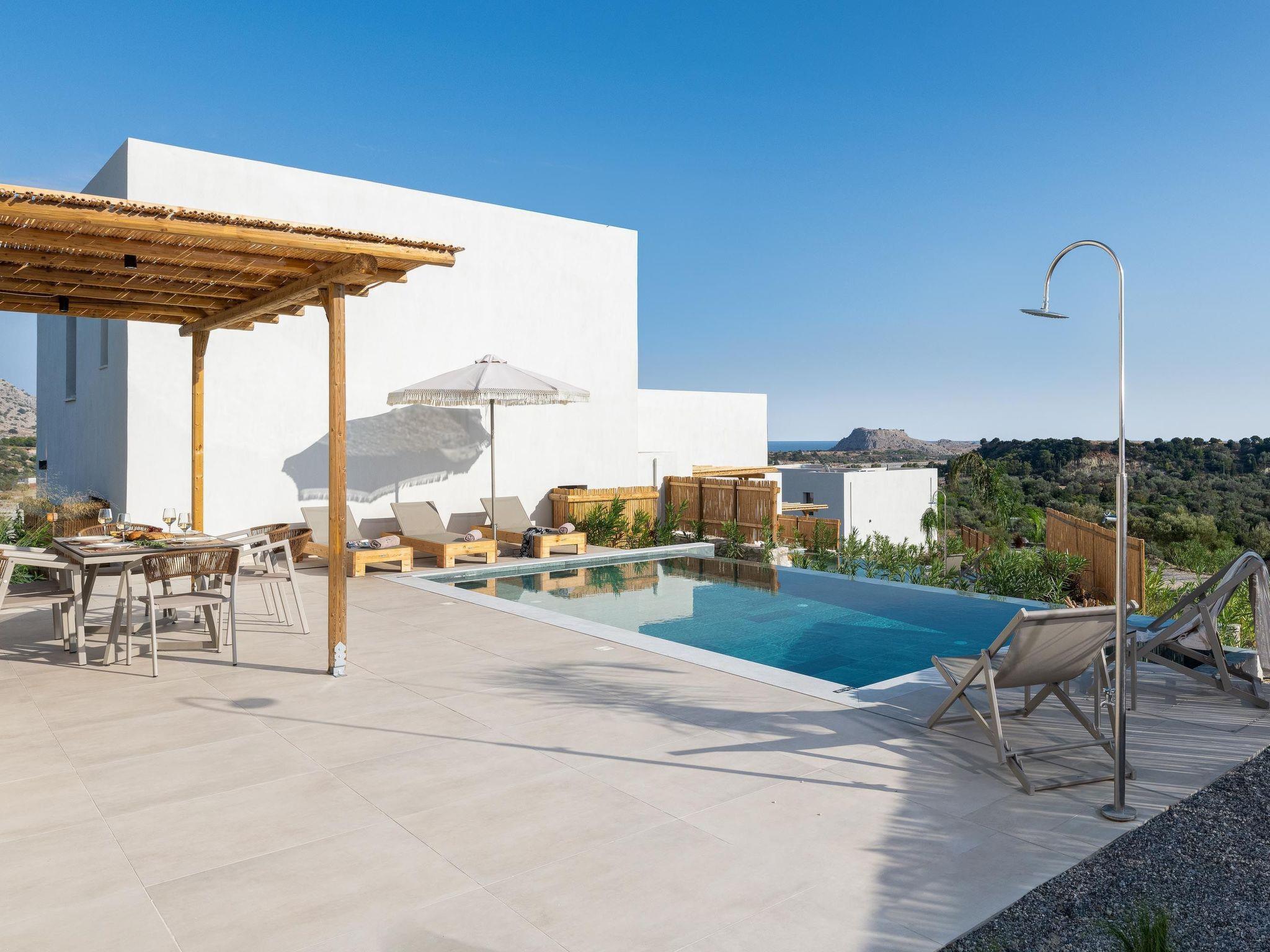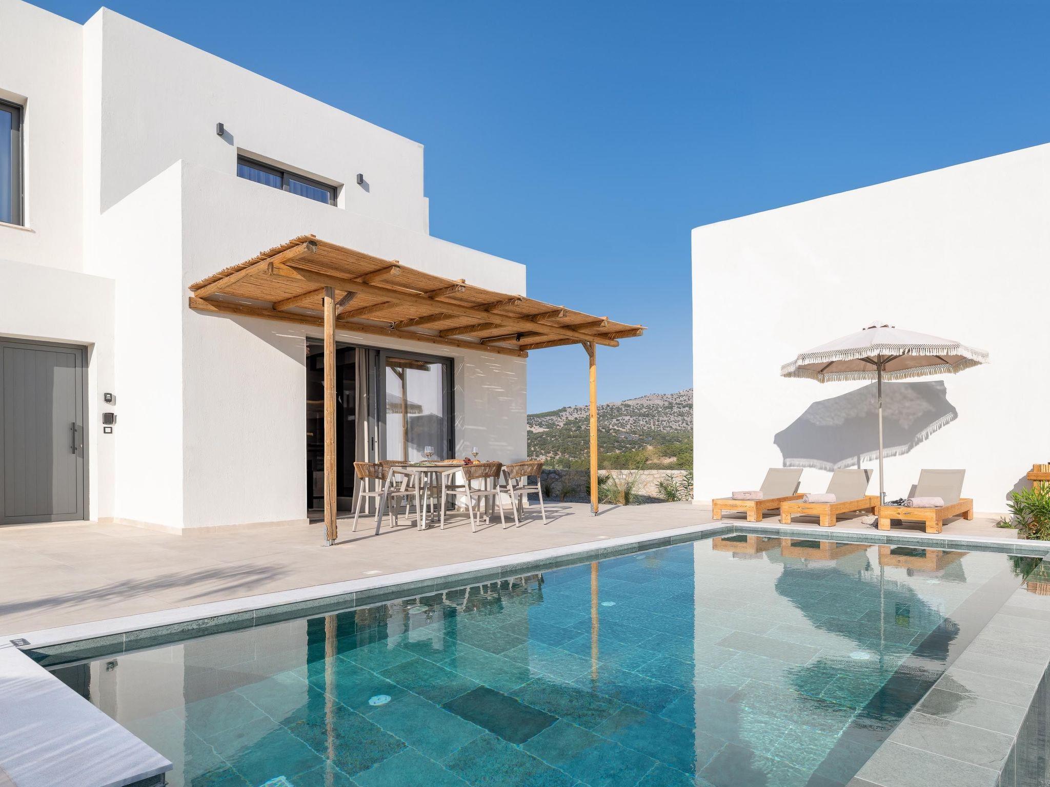 Massari Hills Luxury Living are 15 fantastic brand-new properties designed in unique minimal architecture with unique warm-colored details. They are located in Massari, only a 5-minute drive from Charaki beach. All of the modern villas provide you with all comforts, private swimming pools and patios in a unique design. There is an outdoor sharing gym and each villa offers a BBQ installation. Each property accommodates up to 8 guests.