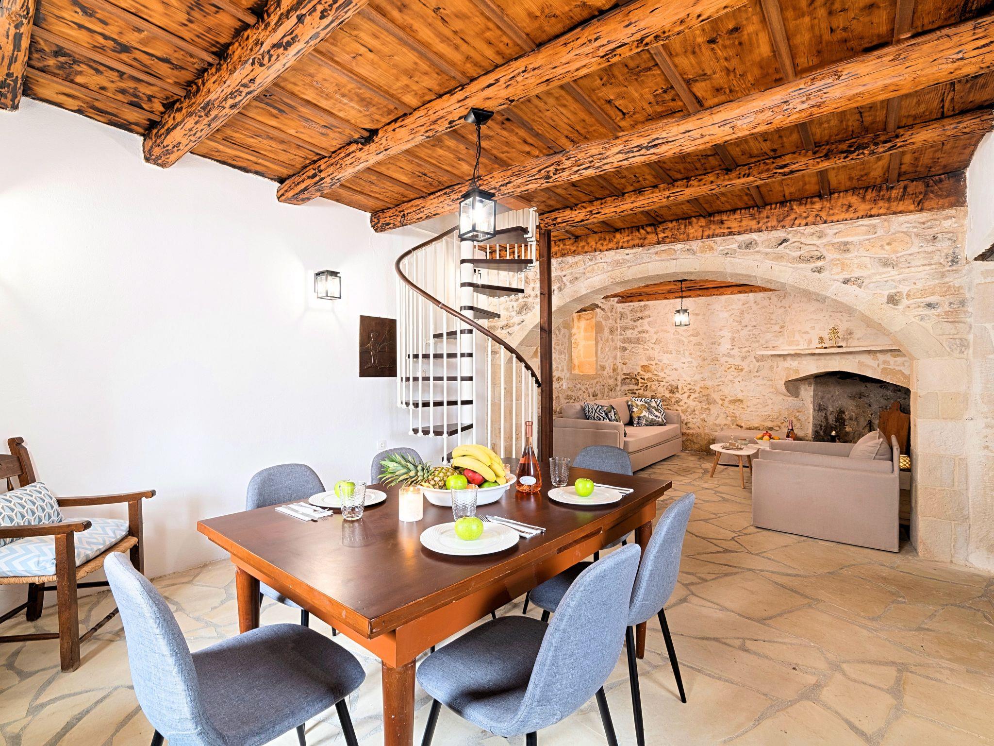In the wildly beautiful landscape of Crete, Villa Barozziana stands proudly at the edge of Argyroupolis one of the most ancient villages of the island, reflecting a unique sense of freedom and enjoying the panoramic view of the surrounding mountains and the Cretan Sea.It is renovated with a harmonious blend of local rock, wood and steel in order to create a Villa of simple unpretentious comfort which blends perfectly with the surrounding Cretan landscape. But this does not mean that the needs of the modern traveler have been neglected. Factors such as the comfortable rooms with access to a large veranda overlooking the olive groves and the Cretan Sea, the fully equipped kitchen, the large swimming pool, the gardens and the heated jacuzzi will ensure that your stay with us will be pleasurably and unforgettable.The villa is spread over two floors, with the two levels connected by an interior staircase. Bedrooms are in the first floor and a large living area with a magnificent fireplace at the ground floor.