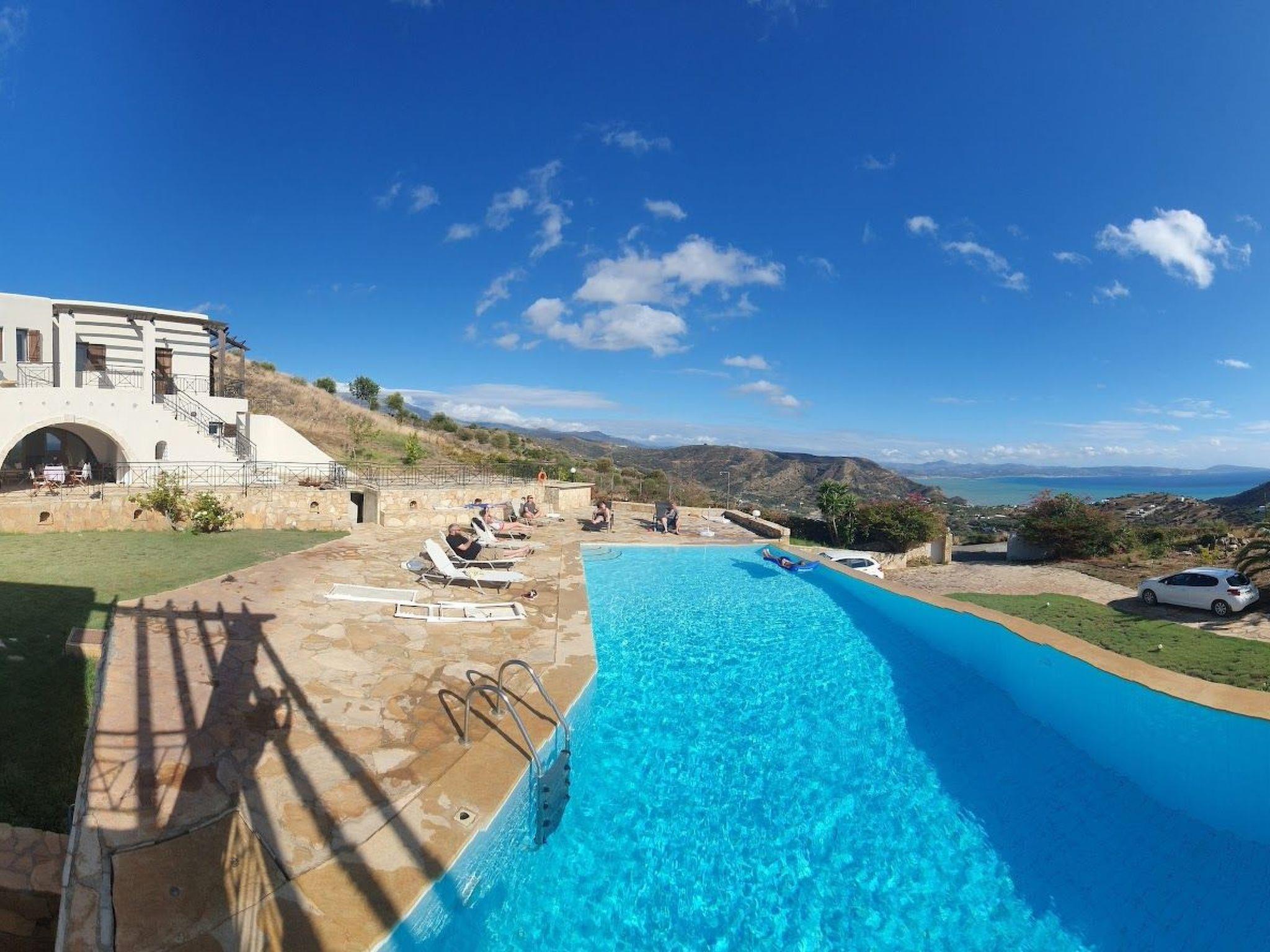 Some informations concerning the house The house, situated on the hill Platyvola over the beach of Agia Galini Village, stands in the middle of 8.300 m2 property which also includes 170 small olive trees and 67 vines. A marvelous view to the sea extends from the house and the whole property. We can see the islands of Paximadi, the villages of Agia Galini and Matala and the surrounding hills of very old olive trees. The architectural design of the house is inspired from the Cretan construction style of the post Minoan period. The house complex is formed by two different buildings: the main house “Spiti” and the secondary house “Paraspito”. The Paraspito is our guest house. On the first floor there is a large bedroom, a bathroom with WC, a kitchenette, a dining room and a large balcony. At the ground floor are the swimming pool’s WC and a covered area, cool and shady used as an eating place. Conforming to the style of the post Minoan period, the house complex is surrounded by a wall. Cretans used such walls as a defense against pirates that often visited the south part of Crete. In our case the wall, is the swimming pool’s wall! From the guesthouse’s balcony we can directly dive at the deepest part of the swimming pool, which is a 14x7 meters overflow type. NB the swimming pool remains closed from 15 November to the end of March every year. Looking out from the living room of the main house, you see the blue water of the swimming pool becoming one with the blue of the sea. The property’s main entrance is a heavy metallic rolling gate flanked by beautiful bougainvilleas. As you enter you find two stone covered alleys. One goes to the entrance of the court under the guest house and one goes to the garage. As we open the garage’s wooden rolling door we enter an area of 200 m2. Here is also stored a small boat with a 25hp Mercury outboard engine. It is at your disposal for fishing or fun. The left part of the garage houses the pool room and its equipment. We go up through a slated stair and arrive to the swimming pool patio, an area covered with Cretan flat ceramic colored stones and a grass court. At our left there is a 100 m2 swimming pool. In front of us is the guest house and at our right the main house. We enter the main house by a wooden door under an arched area where we take our breakfast at summer. We walk in the living room on iroco wooden floor. All floors of the house (salon, dining room, corridors, internal stair and bedrooms) have wooden iroco with the exception of the bathrooms and the kitchen. At our right side there is the dining room adjoining a fully equipped kitchen and a WC. The wooden staircase takes us to the first floor. Here are four large bedrooms, each one with its own bathroom and WC. Each bedroom has its own large balcony with a beautiful view to the sea. From the balcony of the master bedroom we can go down to the court through an external slated stair.