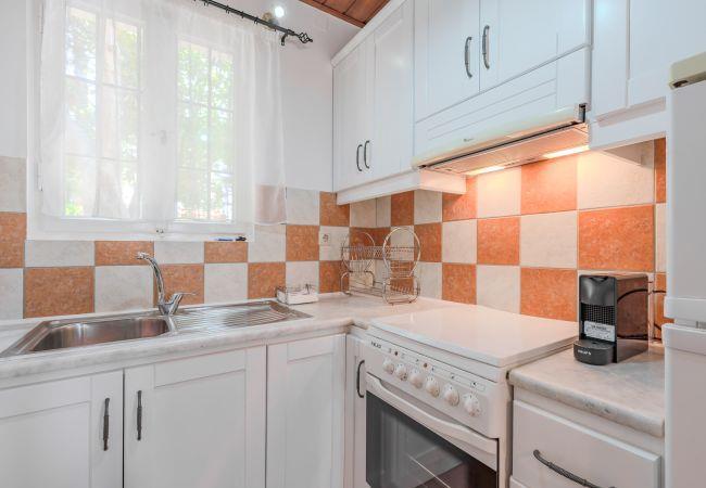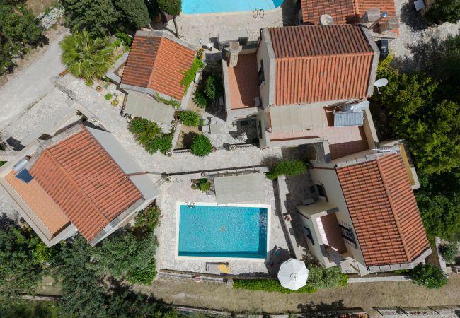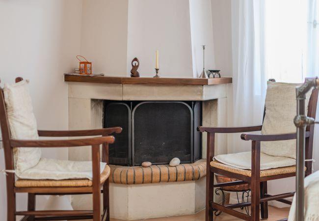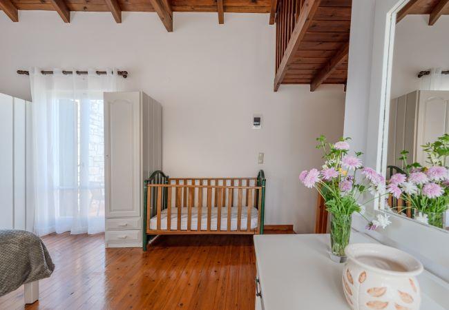The villa comfortably accommodates up to five guests and offers generous balconies with unobstructed views of the valley, along with a sunny terrace perfect for relaxing. The ground floor includes a cozy living and dining area with a fireplace, a sofa bed, a fully equipped open-plan kitchen, and a small WC — all adorned with traditional furnishings that add a touch of rustic charm.