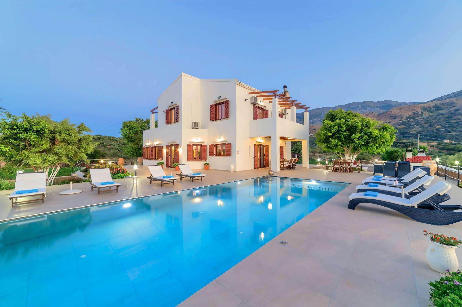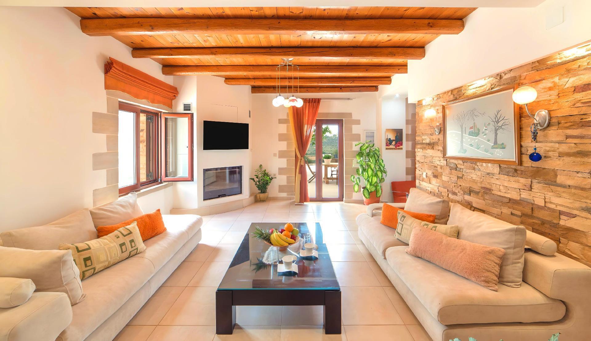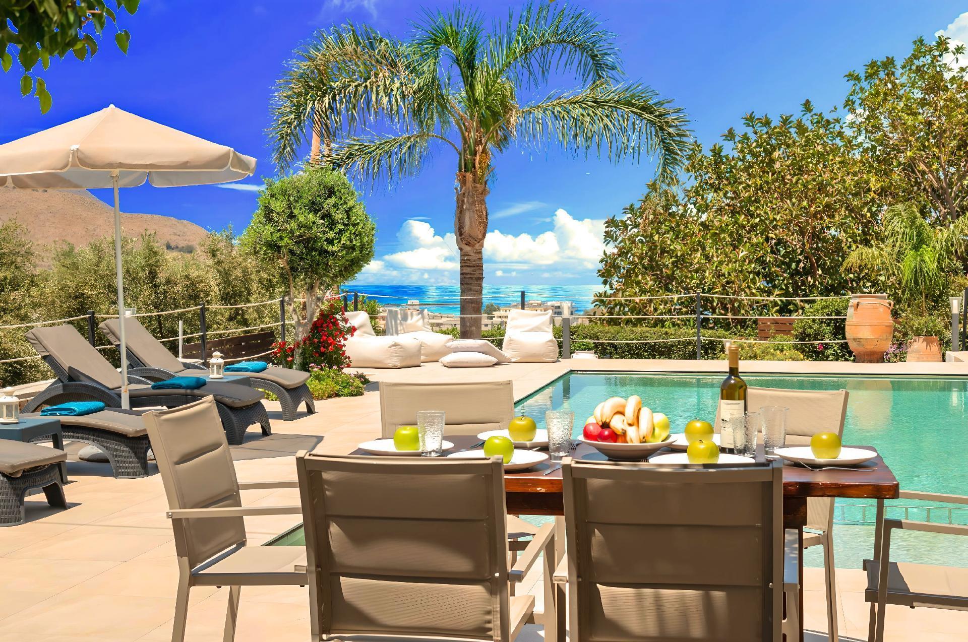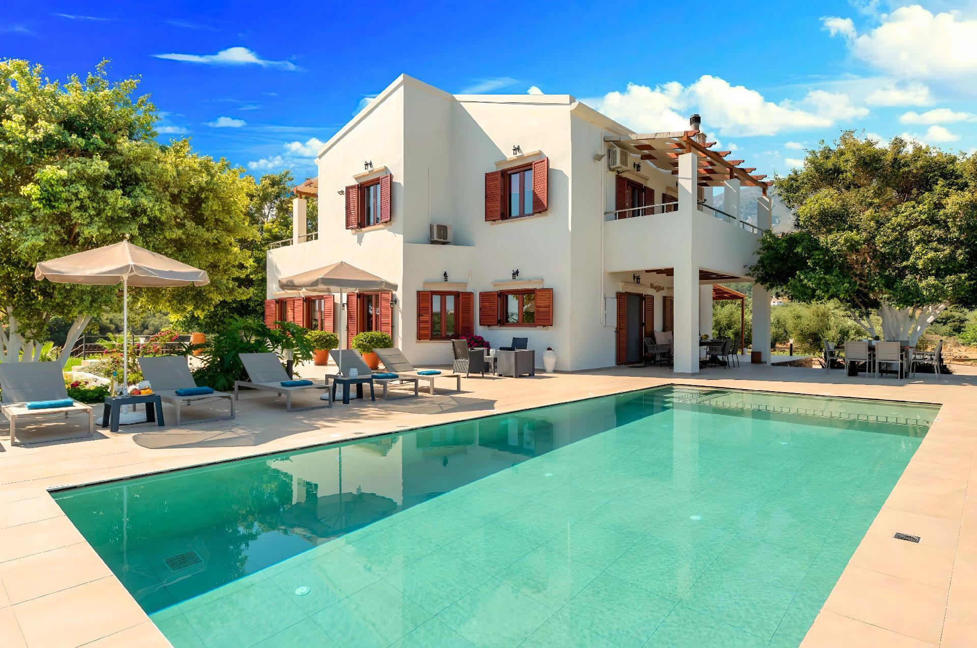 Nuzzled in a gorgeous hill, above the sun kissed beach of Georgioupolis in Crete, Cretan Dream Villa captures the essence of relaxing living only few minutes away from the shimmering sea. Built amphitheatrically with direct sea view, this elegant Villa evokes the island’s Mediterranean spirit and cosmopolitan charm in its elegant environs while ensuring a holiday beyond comparison. Surrender to the temptations of refinement at one of the most enchanting Cretan Villas and take in the splendid panoramic views to the emerald Cretan Sea. Find your peace and quiet and unwind in a haven of bliss and tranquility. Hide away in the calm of summer and elevate your senses at one of the most remarkable Villa with private pools. Cretan Dream Villa can accommodate up to 17 guests ( 13 in the bedrooms) and 4 more at the sofas in the living room).