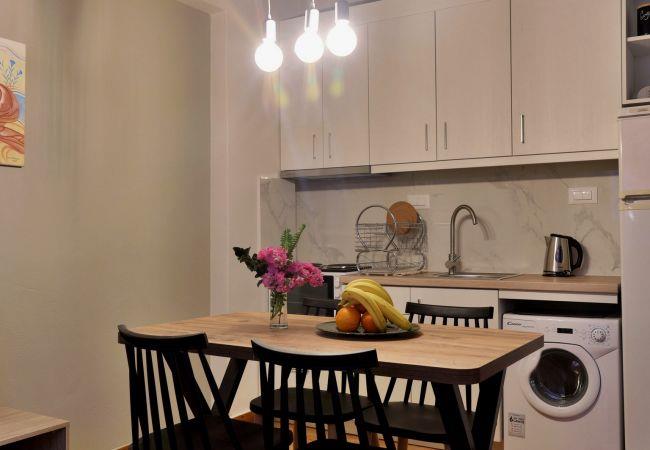 The apartment is flooded with natural light and features a cozy living room with a sofa bed and modern furnishings, complete with a dining table. It also boasts a fully equipped open-plan kitchen and a well-appointed bathroom. Additionally, there is a spacious double bed and ample closet space.
