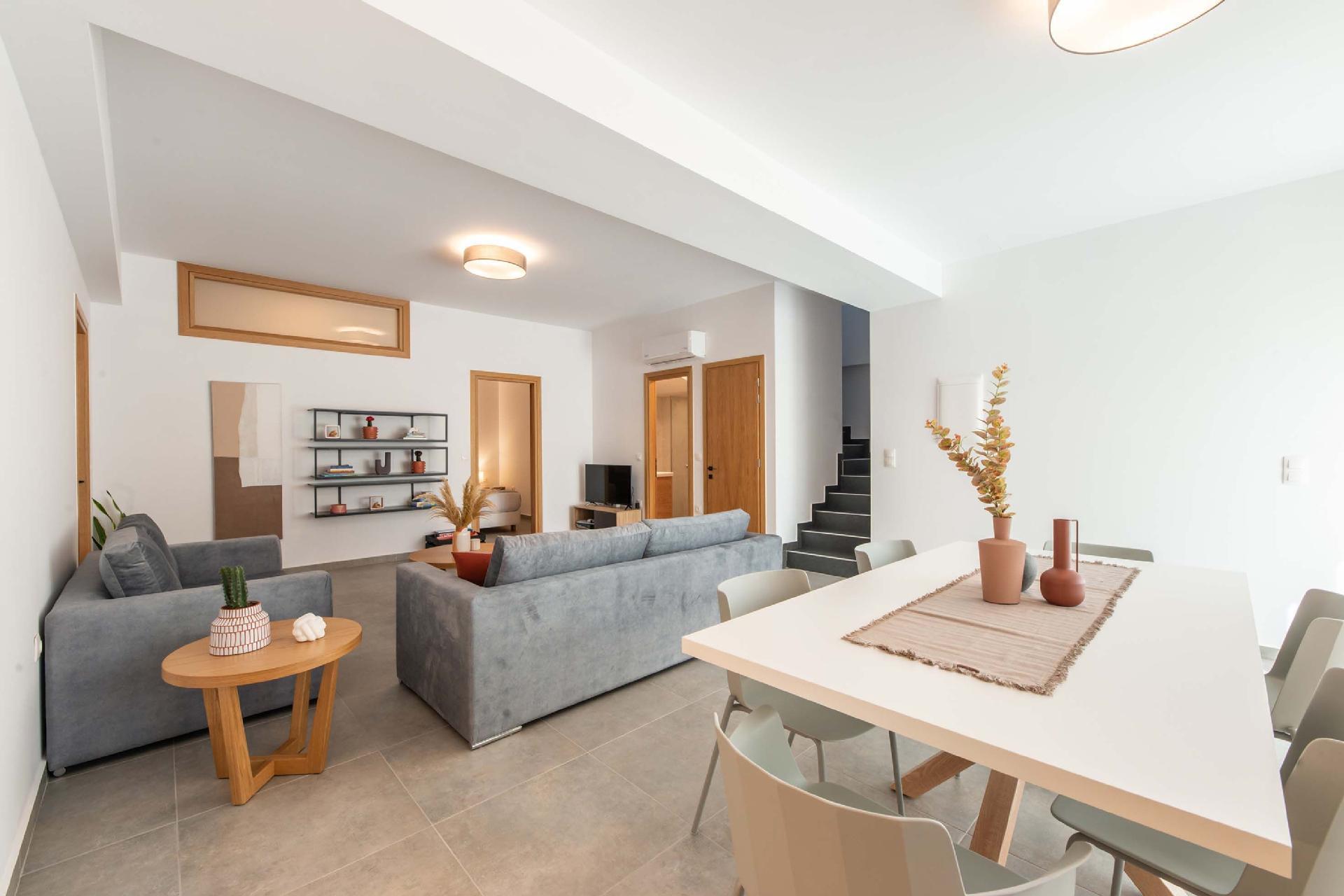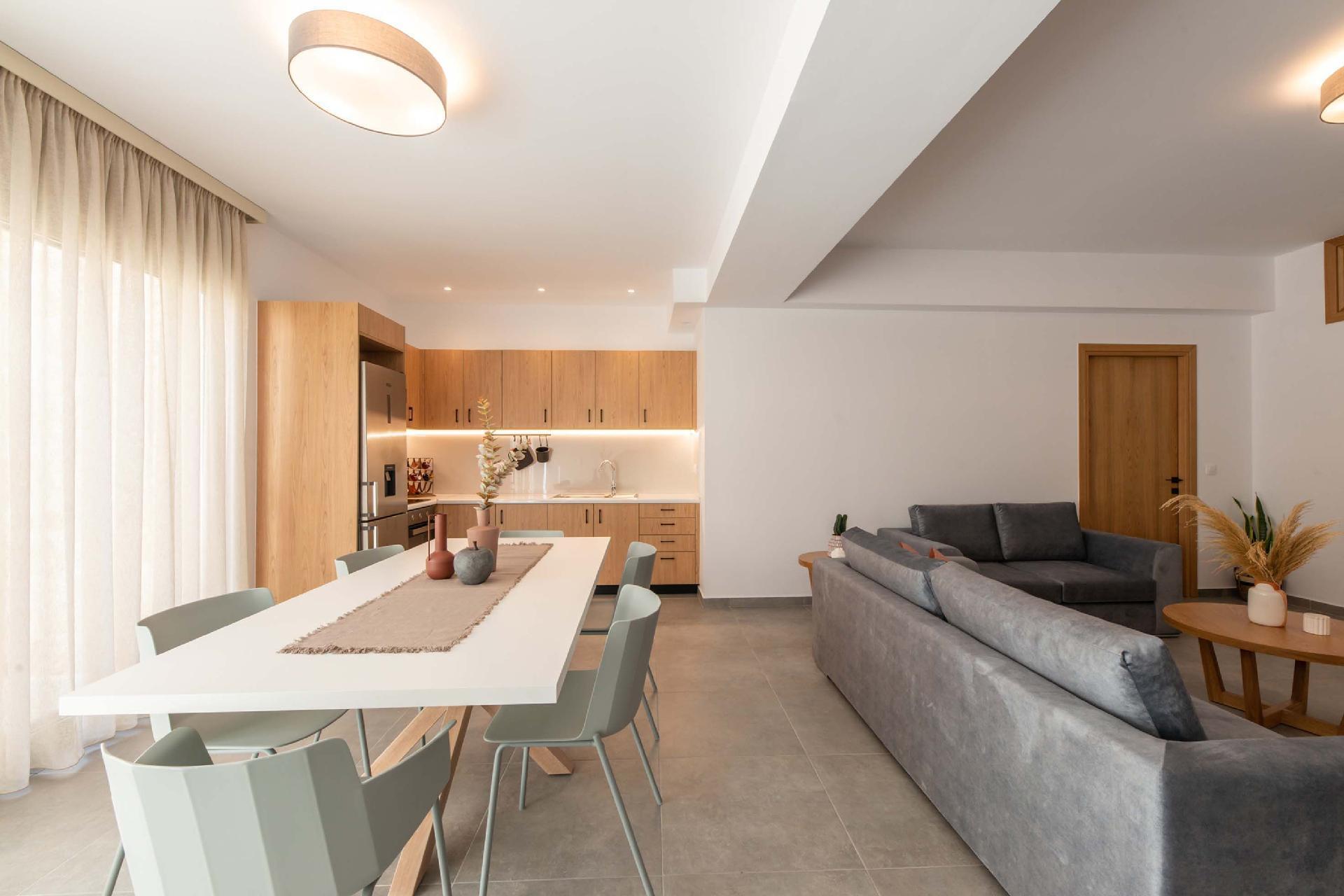 A sleek contemporary villa with arresting views, designed over three floors, features generous indoor and outdoor areas with a lavish design. Entering the villa you will step into a large living area with breathtaking views of the sea. The supreme amenities, the exuberant living room, and the dining area are also adequate for people with special needs. The villa is styled to feel like an immersive sanctuary, where natural materials meet modern design for a calming atmosphere that is luxurious yet comfortable with every space designed to embrace the exterior environment. Pretty close to the living area there is a glossy kitchen where cooking is anything but a chore and have light breakfasts and gourmet dinners. On the same level, there is also a bedroom with a satellite Smart TV and large windows that create the illusion of transparency and a dining room with seating for 6 persons.
