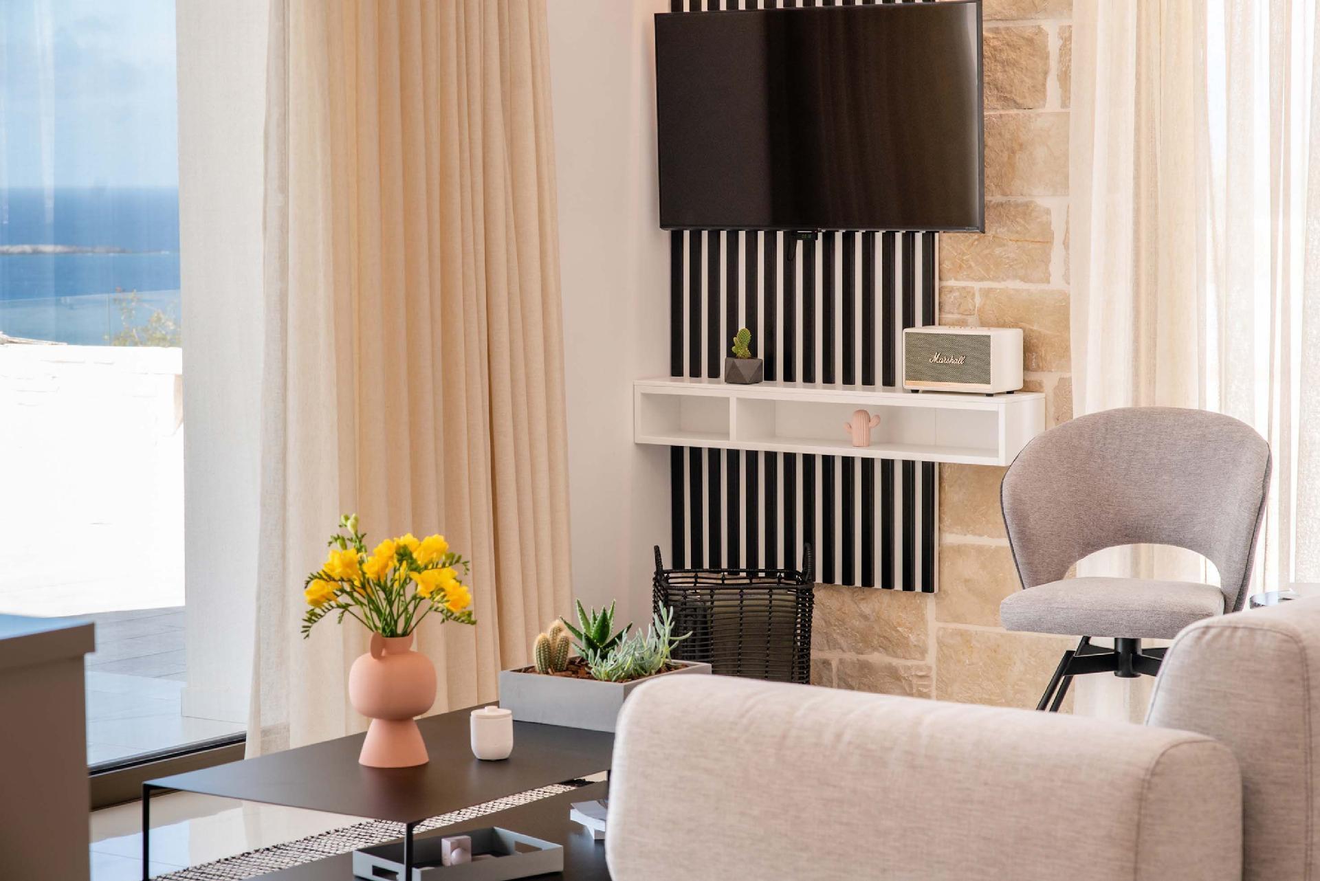 Living area with sofa, 43’’ satellite Smart TV, access to the pool terrace, sea view