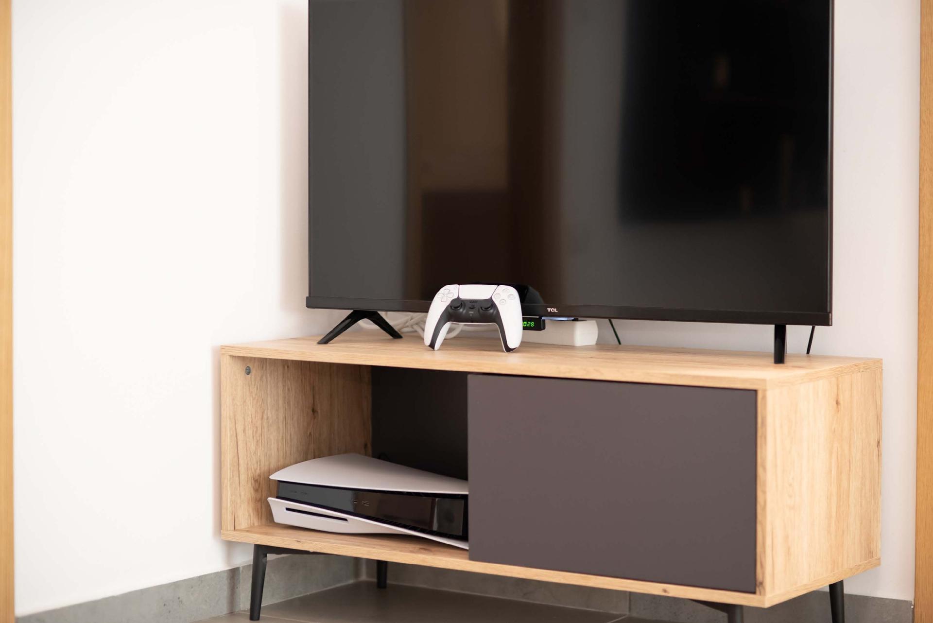 Living area with sofa, 40’’ Smart Satellite TV, Playstation 5 console