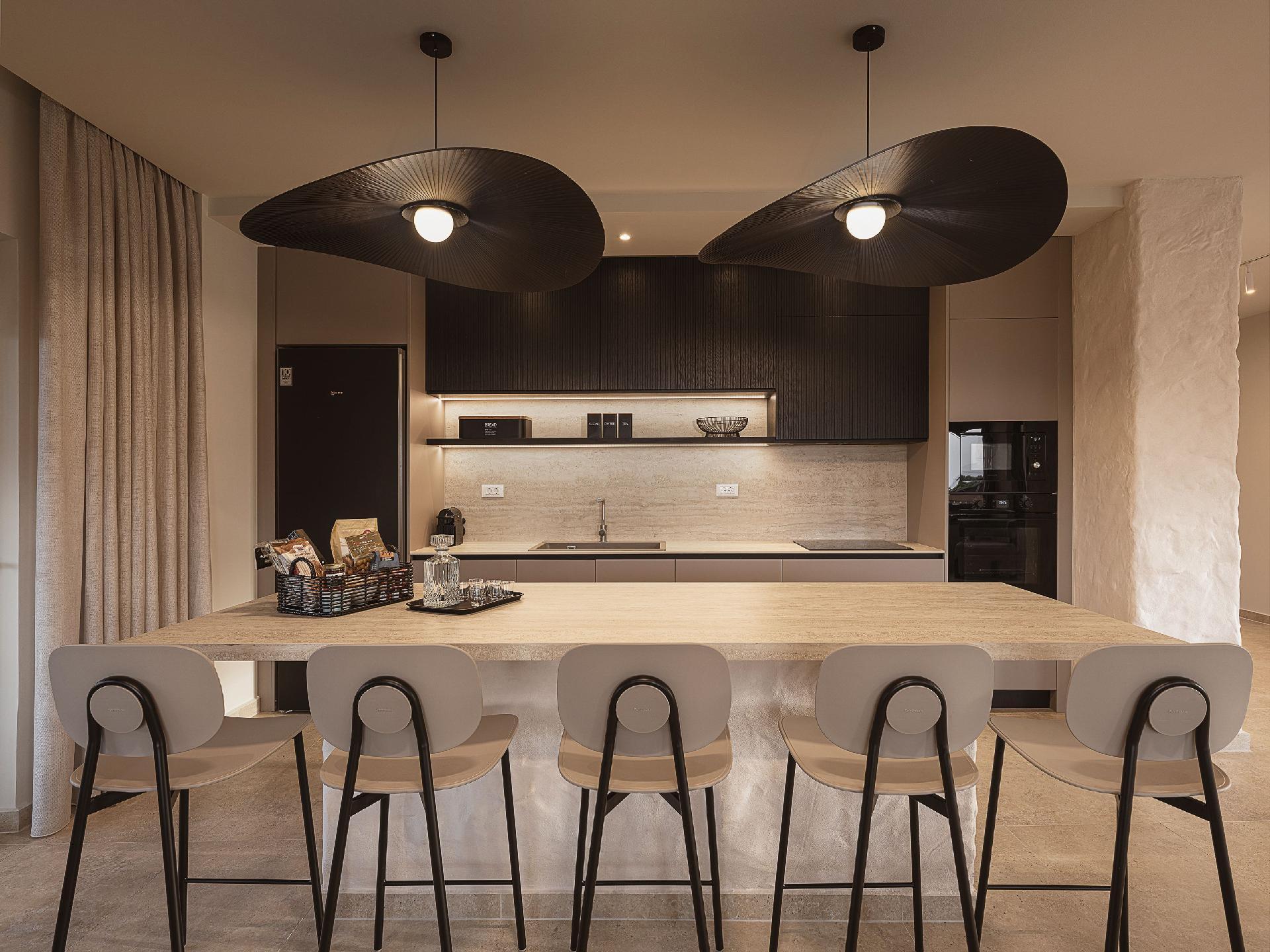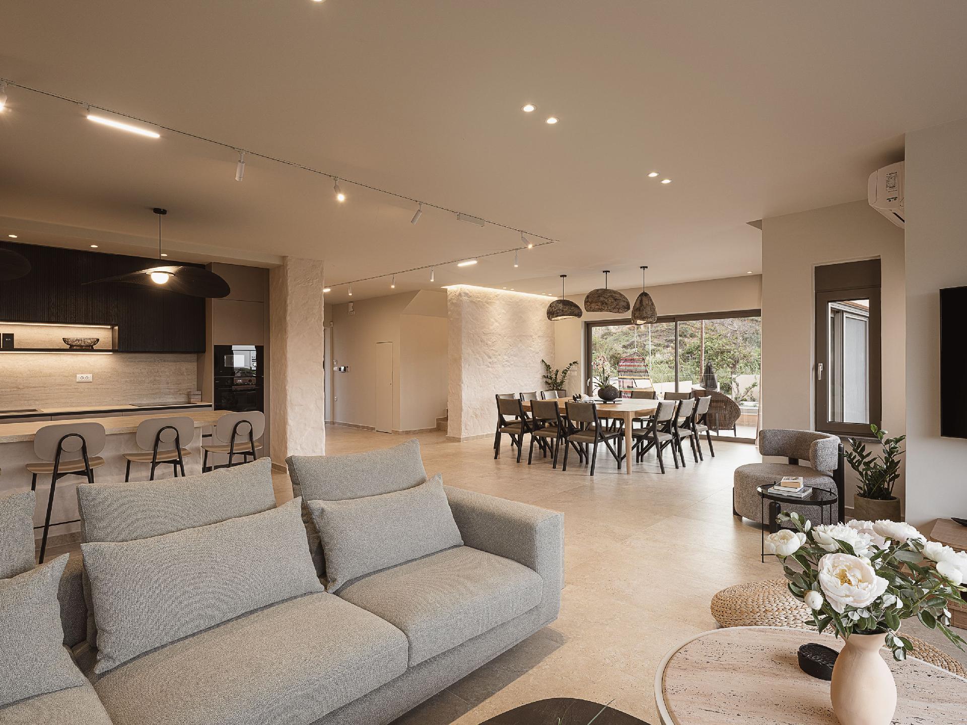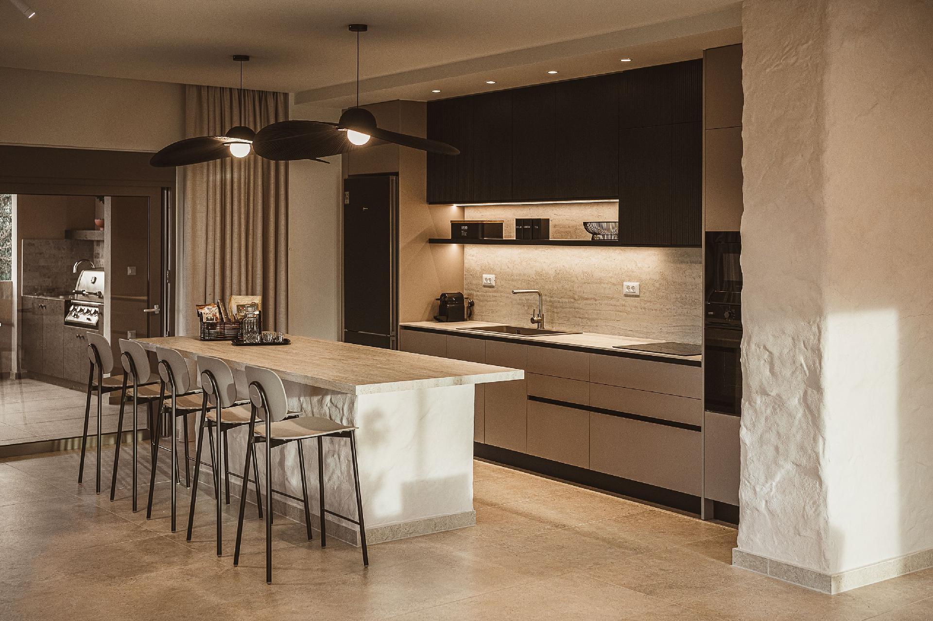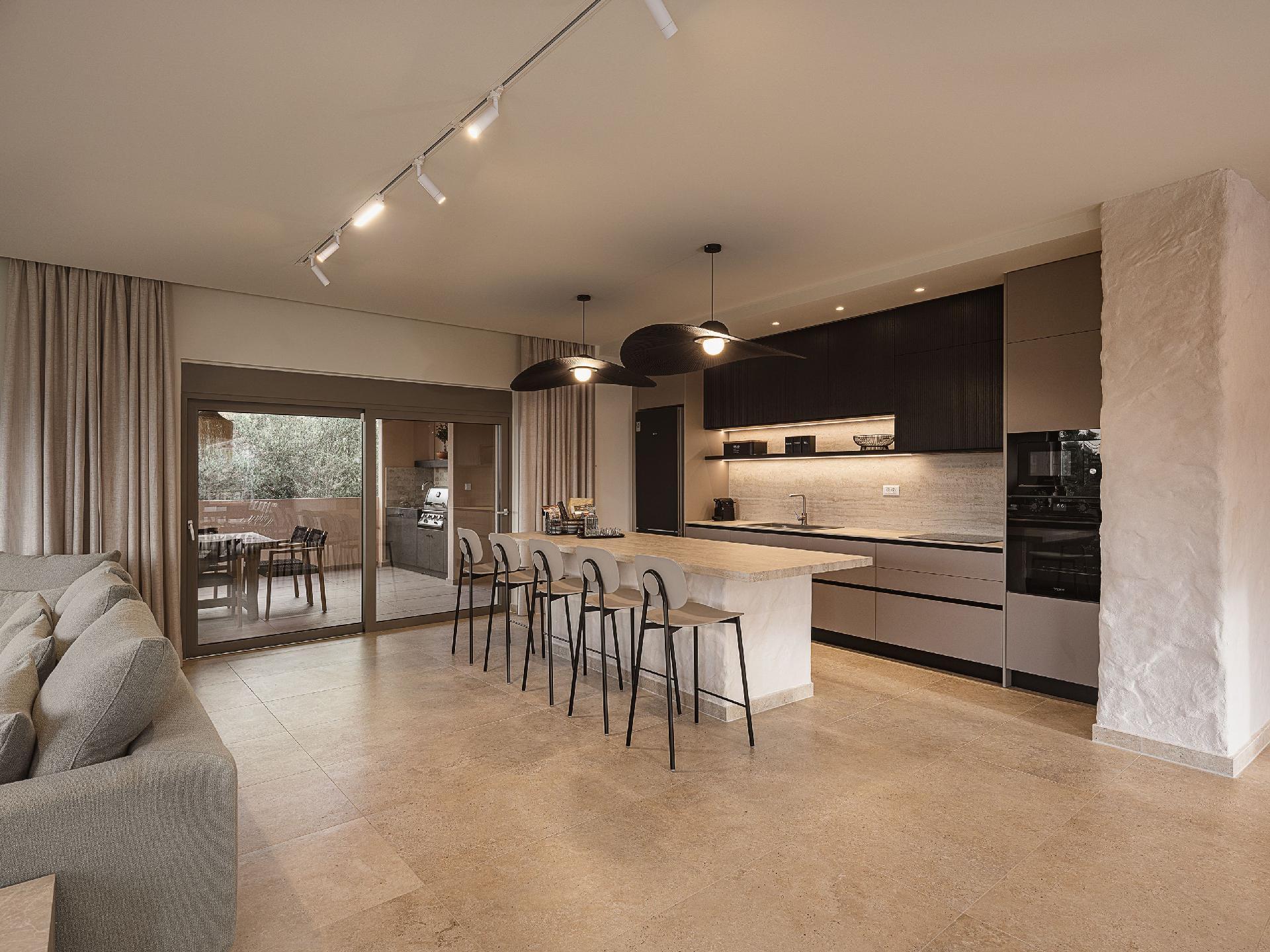 On the ground floor, you will find two bedrooms, one has an ensuite bathroom and views of the sea from the balcony, something that will attract your attention. The villa on the ground floor is completed with an open-air living space and a highly equipped kitchen that makes cooking meals worth trying. Sink into the comfy sofa and enjoy a cozy night while watching your favourite series, or gather around the dining area and raise a glass of wine while you get to enjoy a good-spirited dinner! The access to the exterior area and the pool is pretty easy from the dining area, with the large window doors making a seamless transition giving you the chance to enjoy the direct connection with nature.