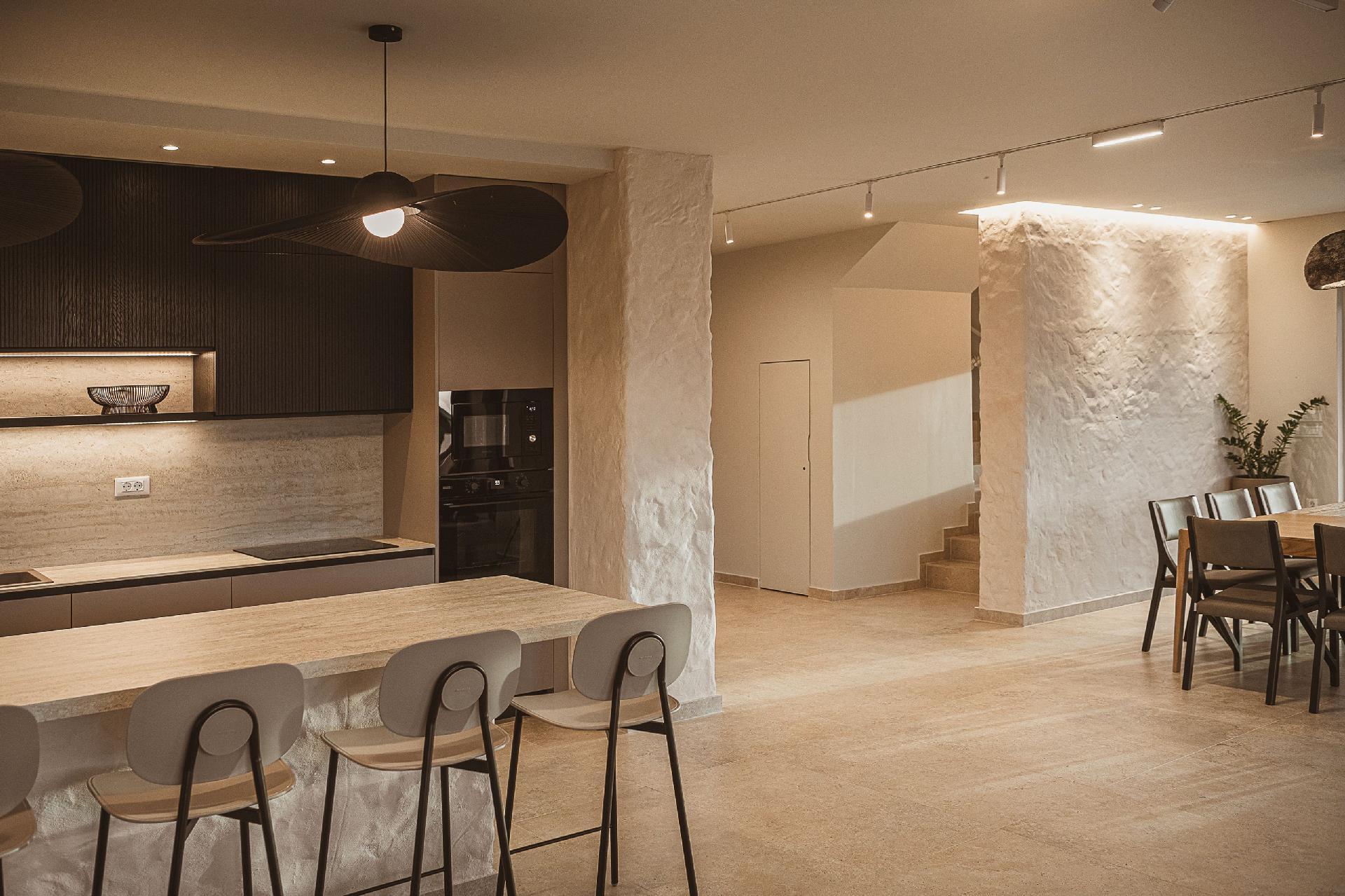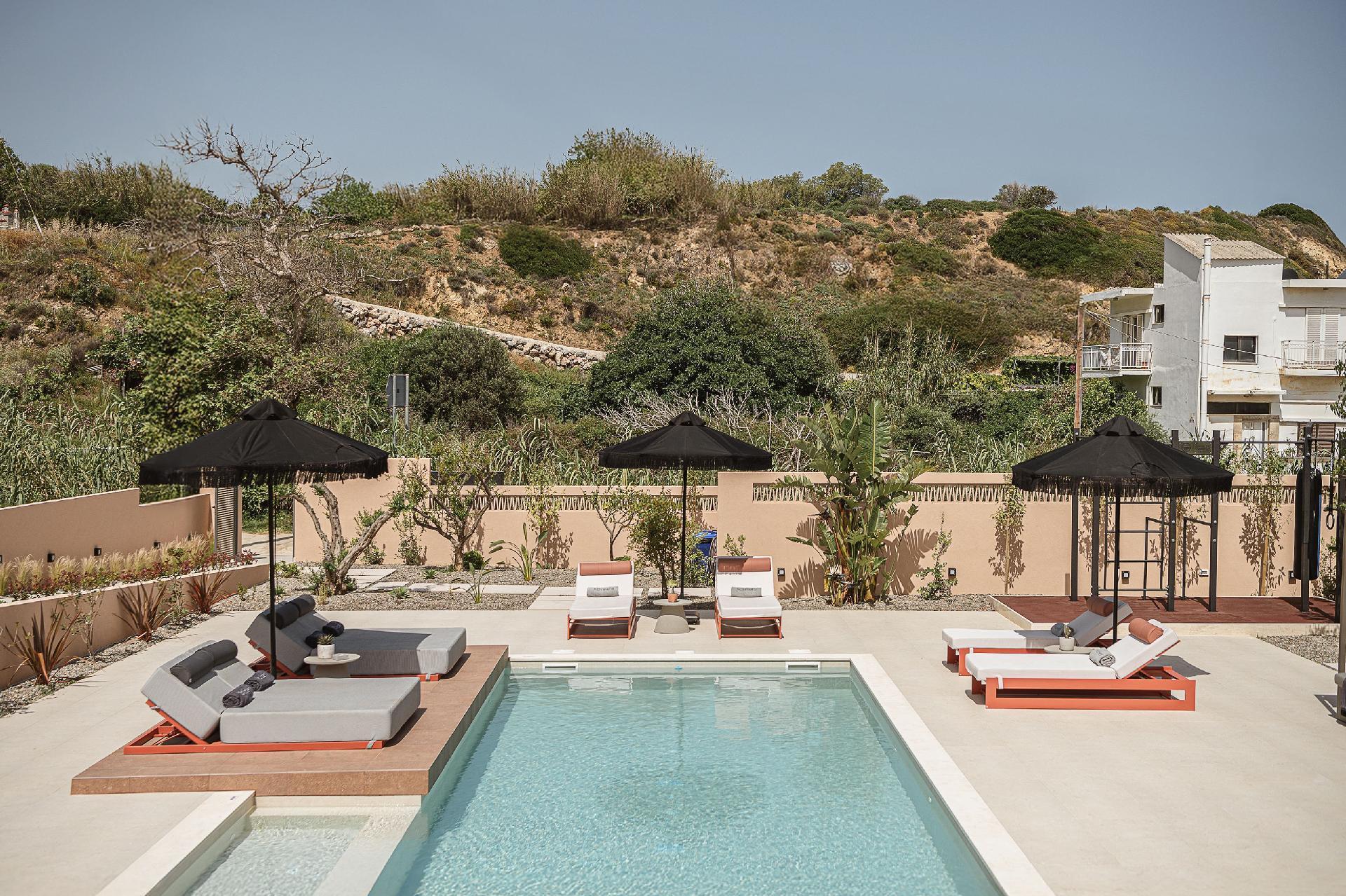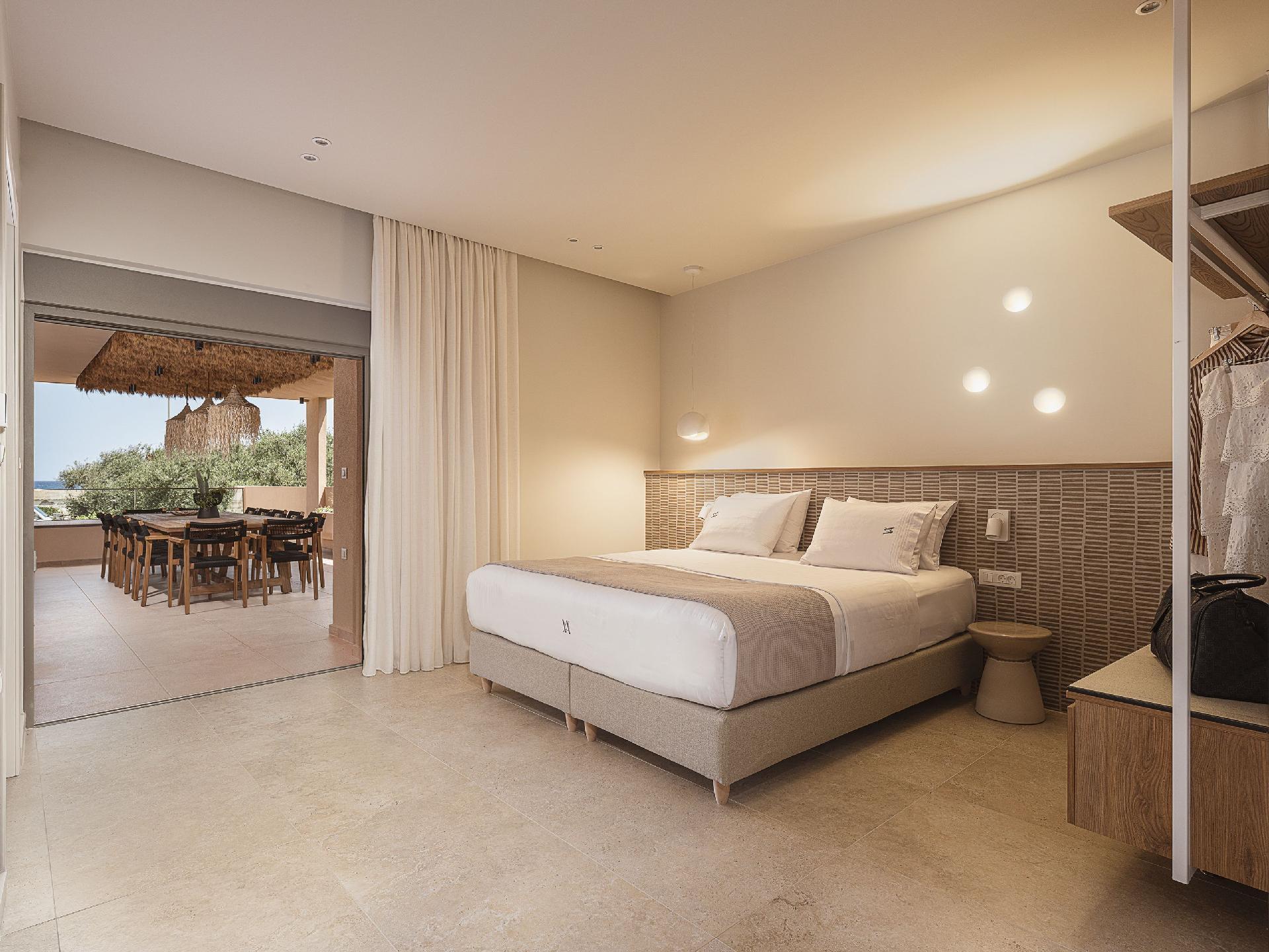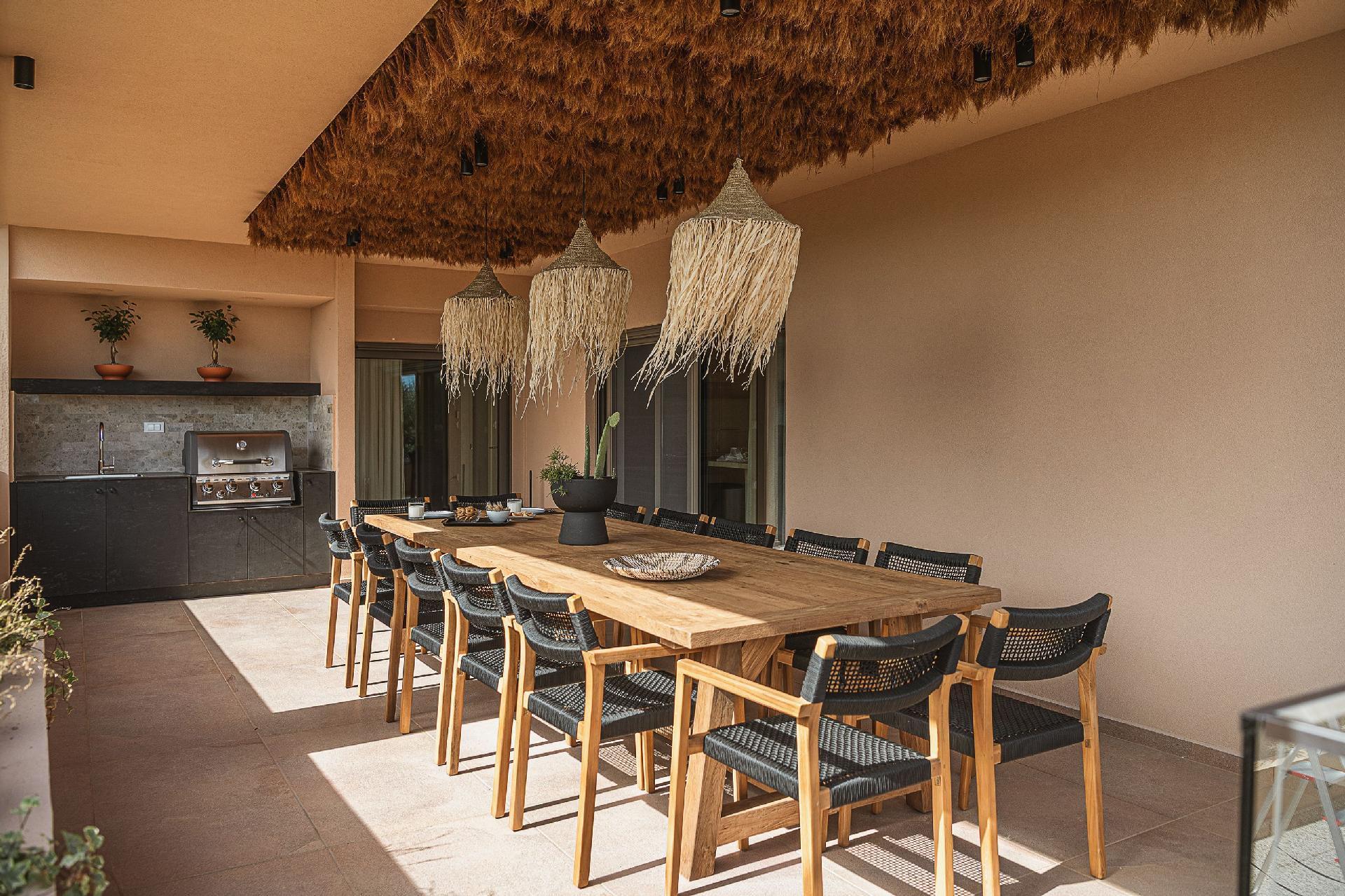 On the ground floor, you will find two bedrooms, one has an ensuite bathroom and views of the sea from the balcony, something that will attract your attention. The villa on the ground floor is completed with an open-air living space and a highly equipped kitchen that makes cooking meals worth trying. Sink into the comfy sofa and enjoy a cozy night while watching your favourite series, or gather around the dining area and raise a glass of wine while you get to enjoy a good-spirited dinner! The access to the exterior area and the pool is pretty easy from the dining area, with the large window doors making a seamless transition giving you the chance to enjoy the direct connection with nature.