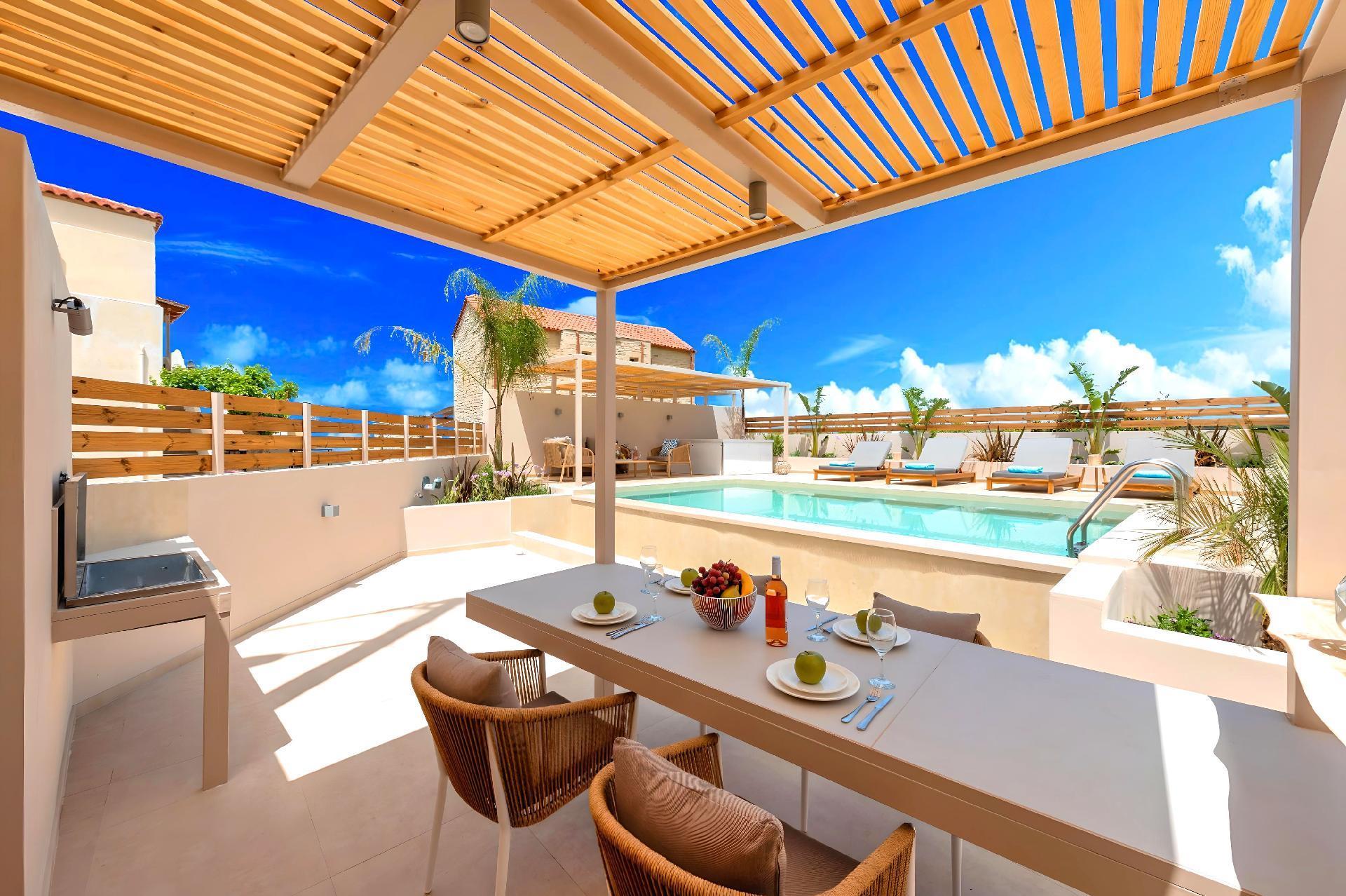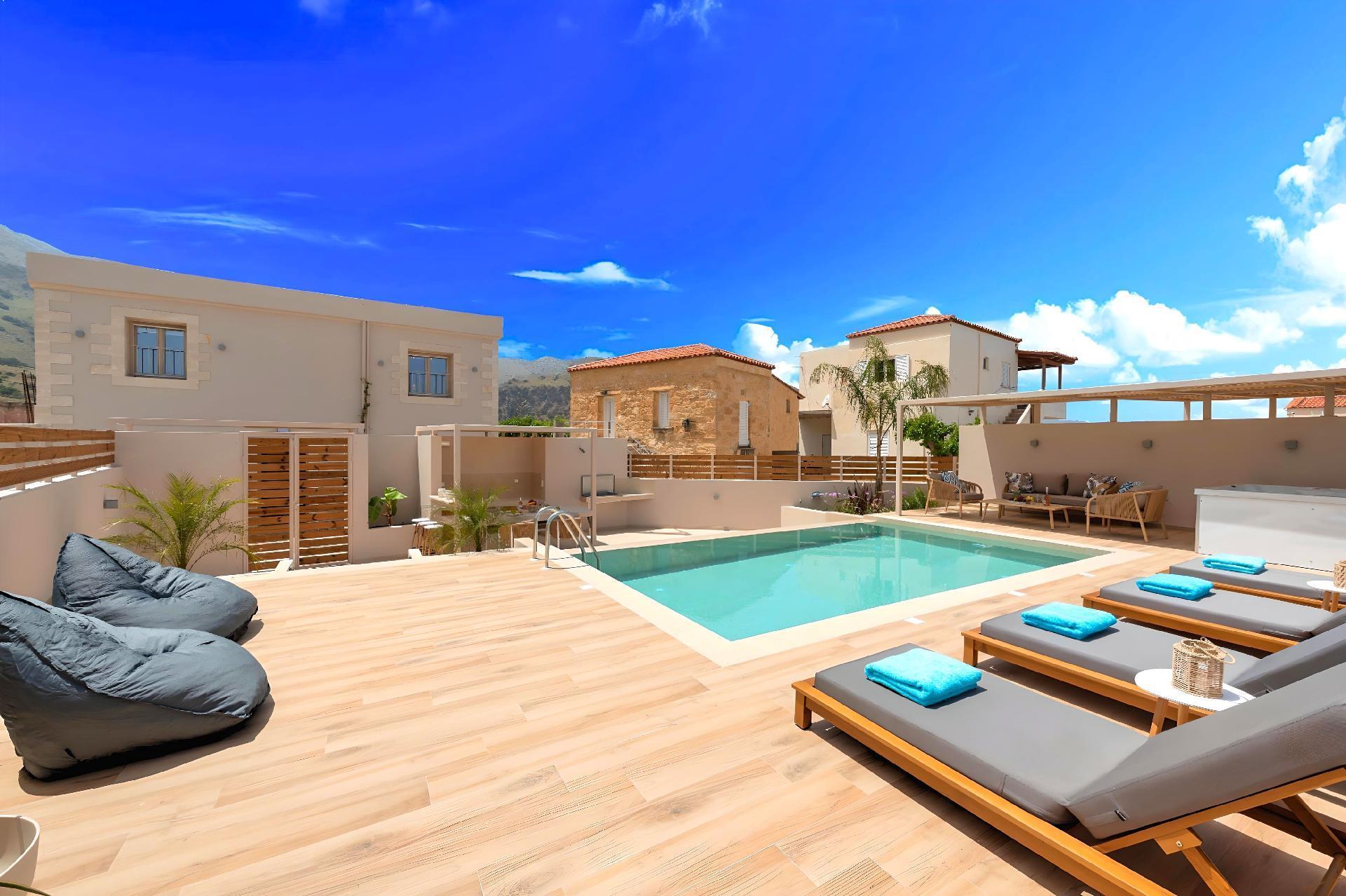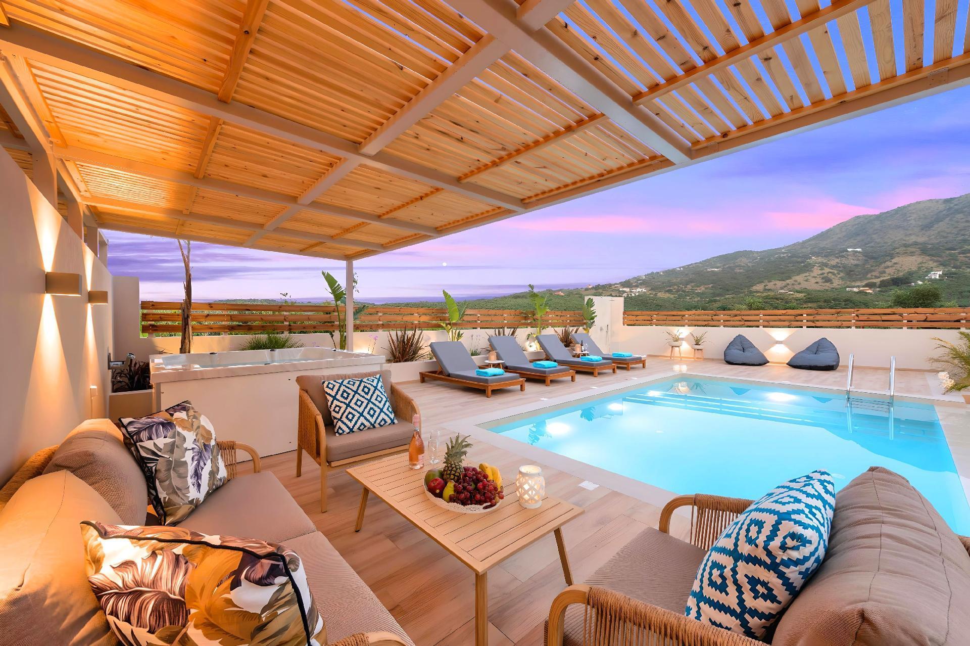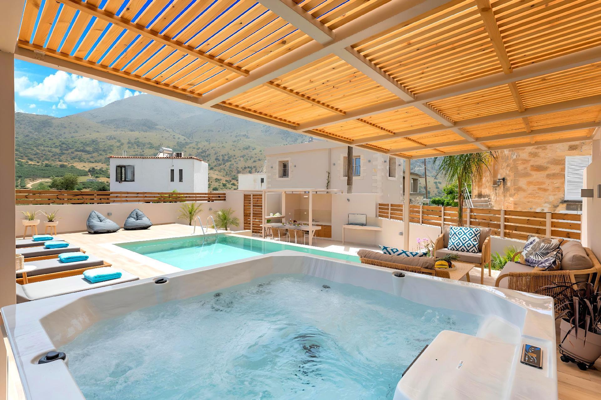 Outdoors, a spacious terrace with a BBQ and dining area overlooks the private pool, a relaxing sun beds area, and a heated large whirlpool.