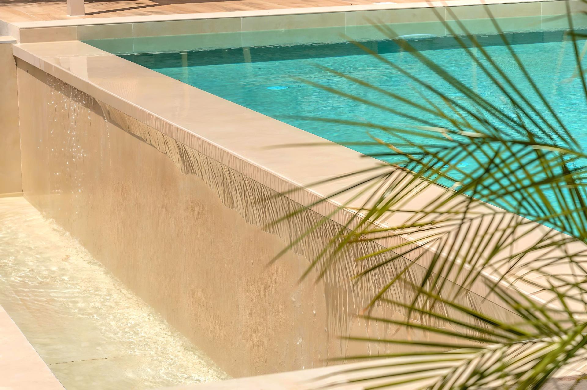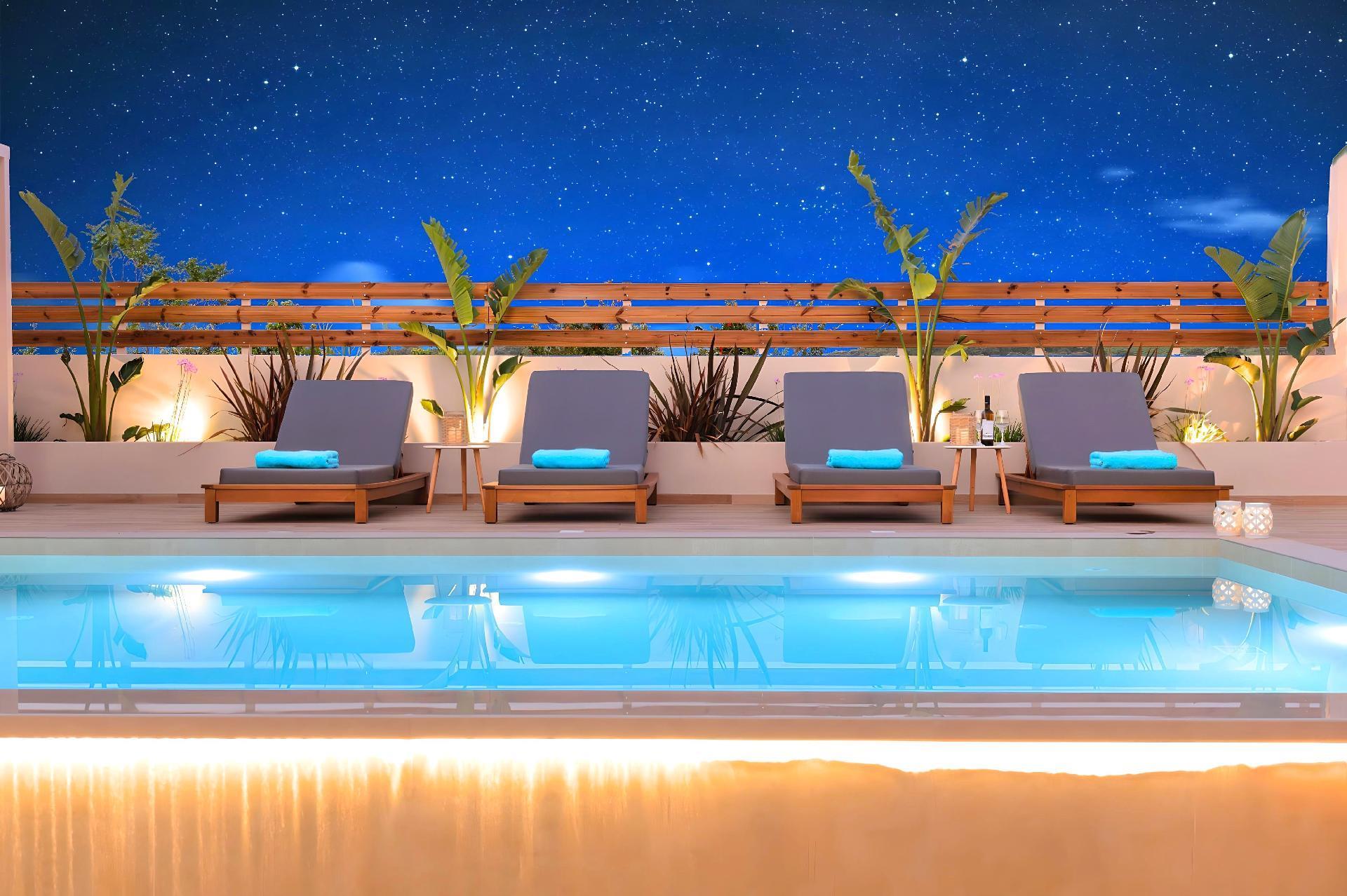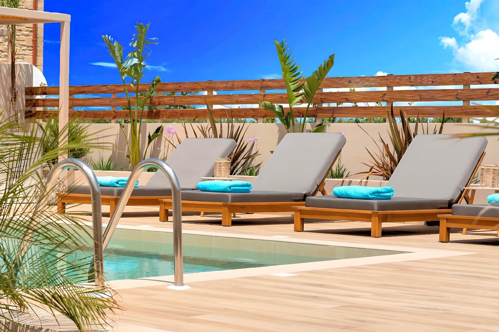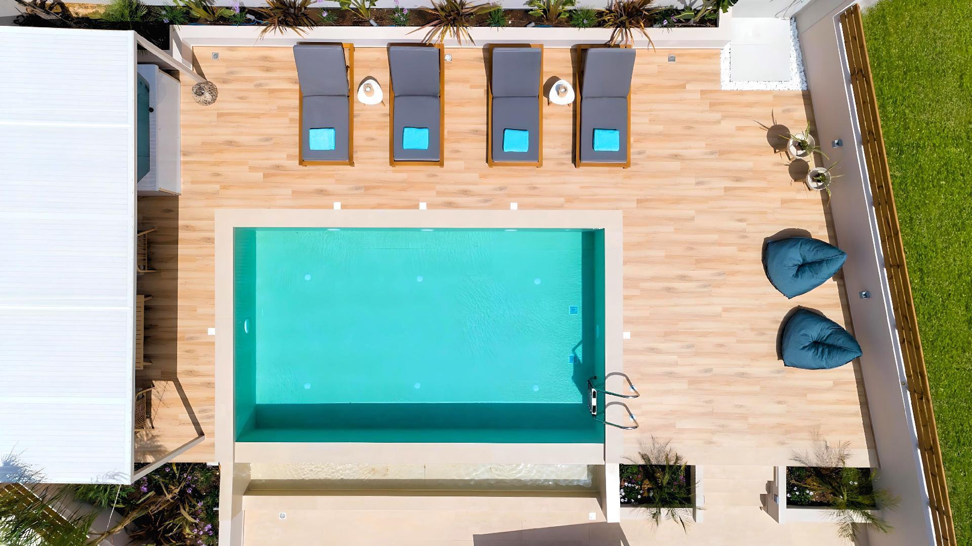 Outdoors, a spacious terrace with a BBQ and dining area overlooks the private pool, a relaxing sun beds area, and a heated large whirlpool.