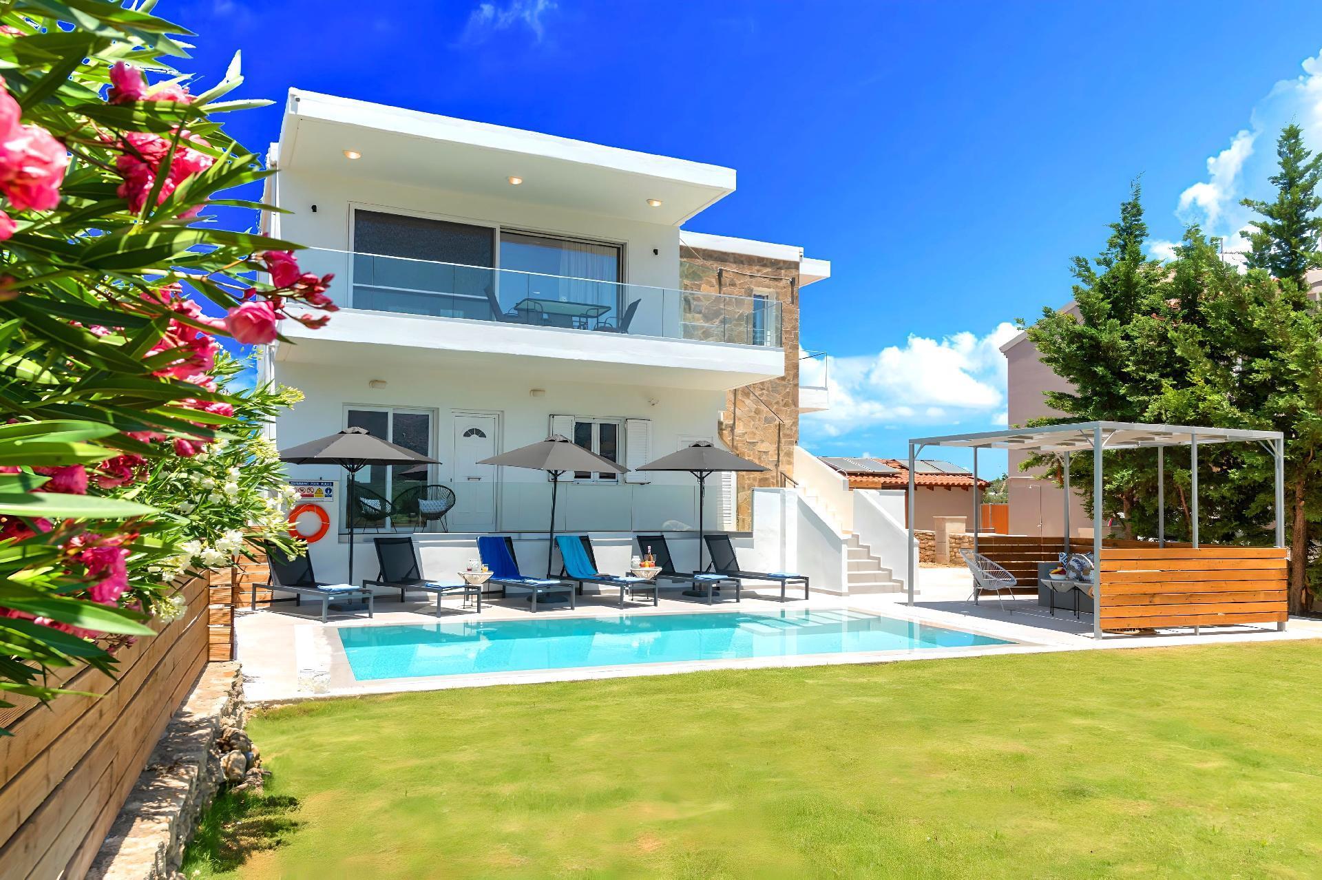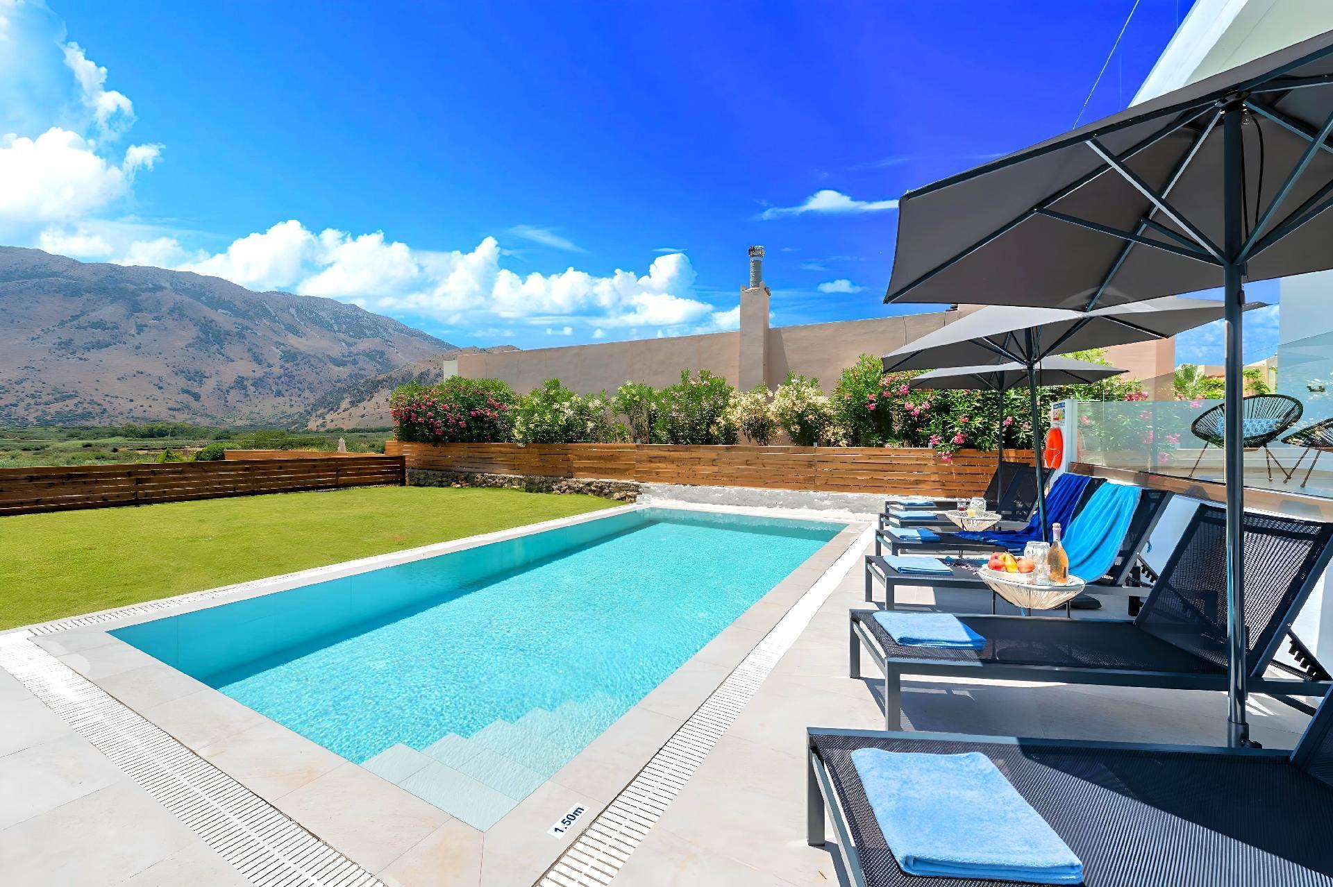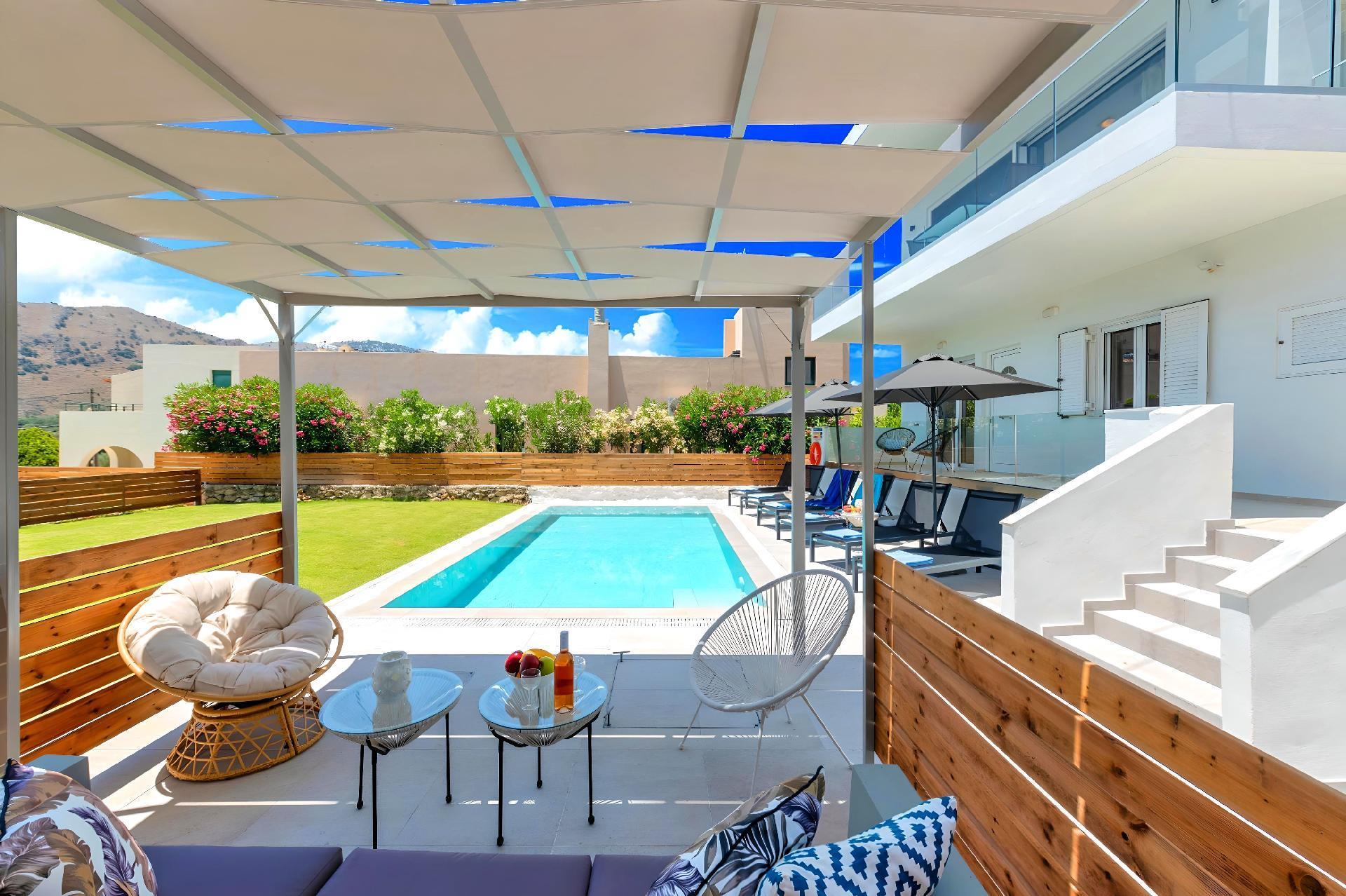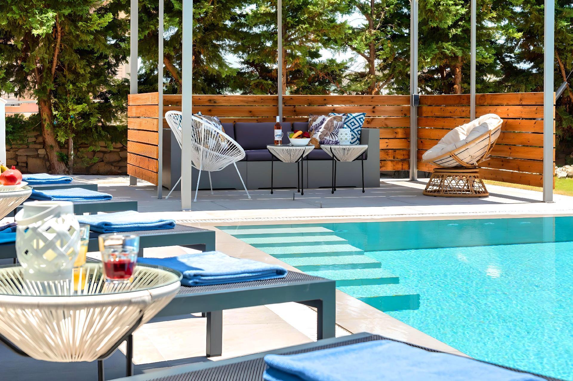 Outside, immerse yourself in the ultimate relaxation with a large swimming pool, perfect for a refreshing dip or leisurely swim. The sun terrace, adorned with comfortable sun loungers and umbrellas, invites you to bask in the warm Mediterranean sun. Enjoy your mornings with a cup of coffee or unwind in the evenings at the outdoor sitting area, ideal for savoring the gentle sea breeze and scenic views.
